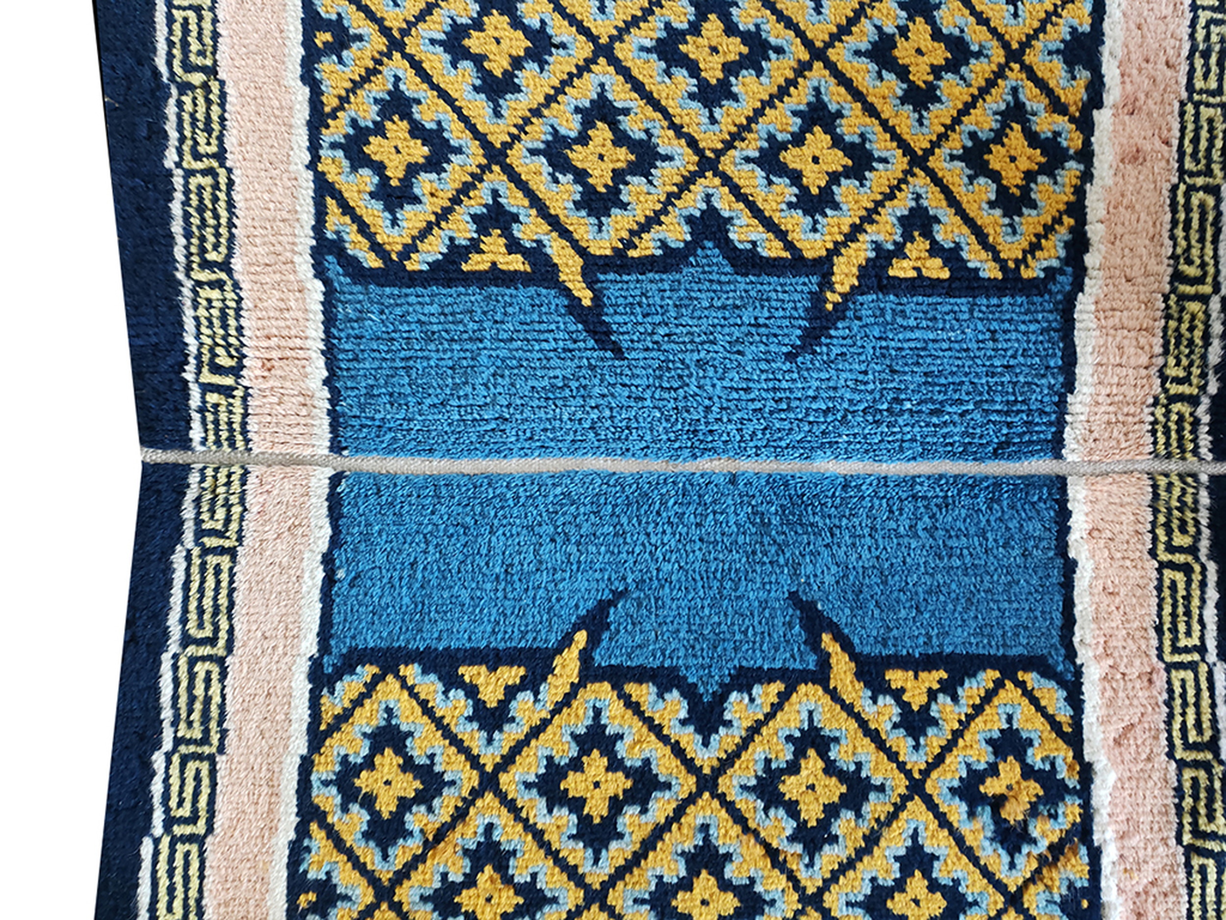 The field features a sophisticated palette, utilizing deep navy, mustard yellow, and striking teal accents, classifying it among the finest multicolor jewel tone rugs. The primary diamond lattice creates an effective allover rugs impression within the main panels, framed by a classic Greek key fretwork border in contrasting beige and black.