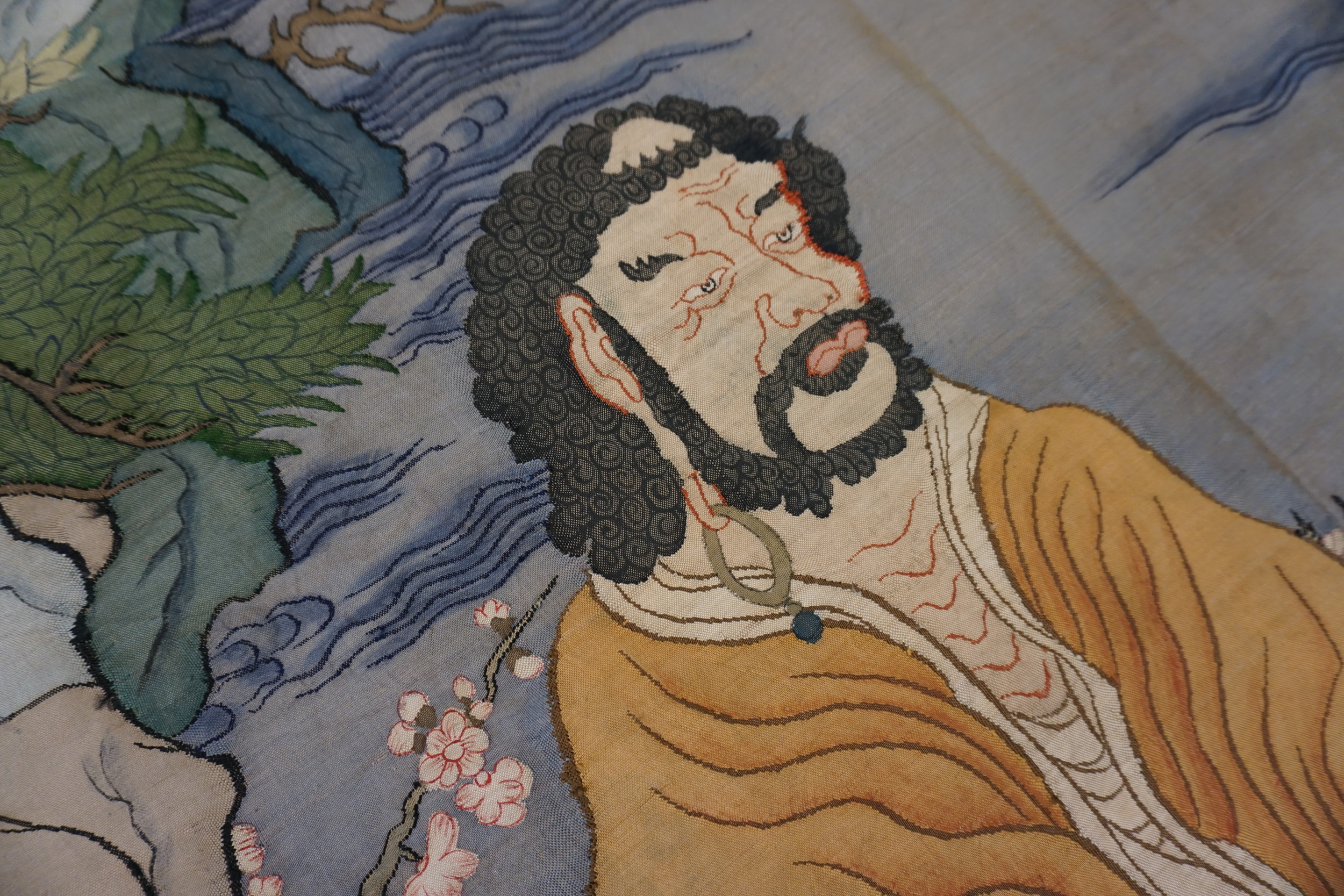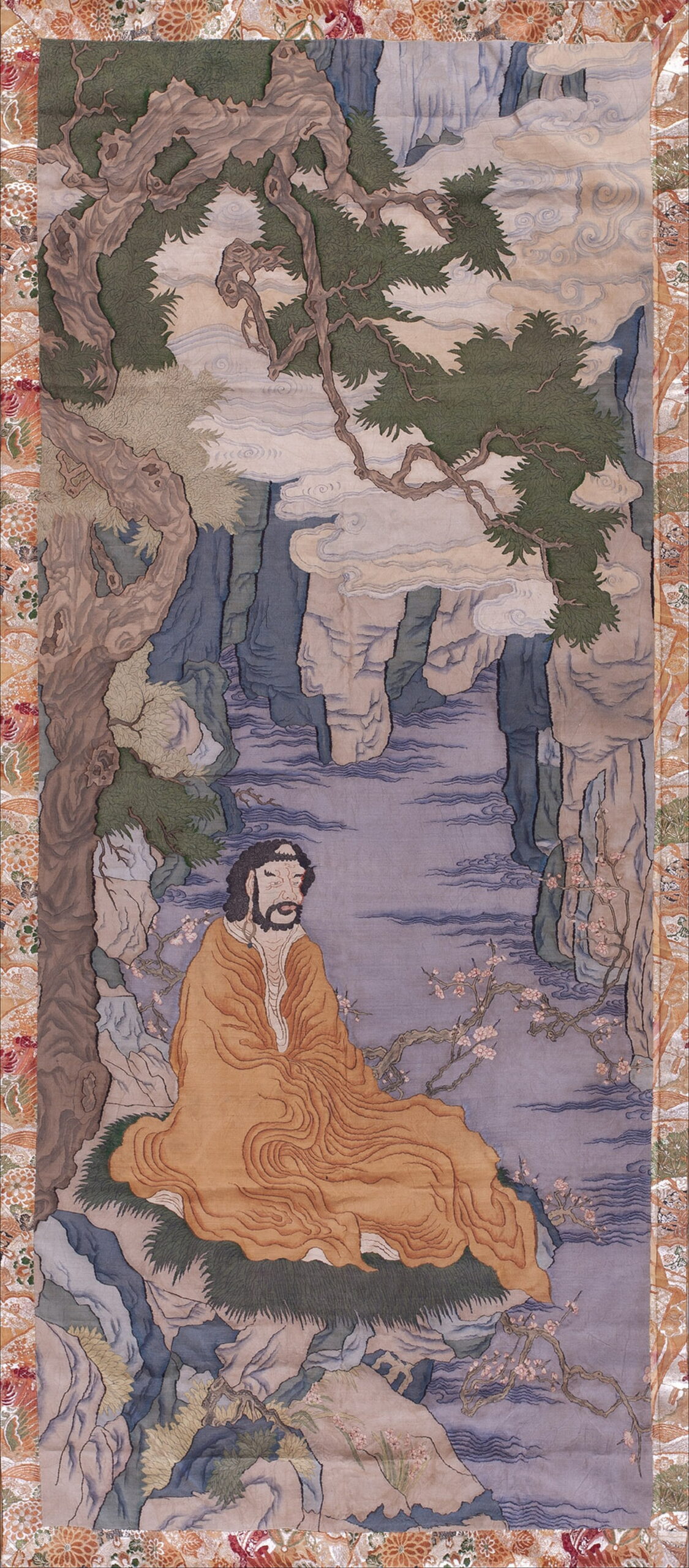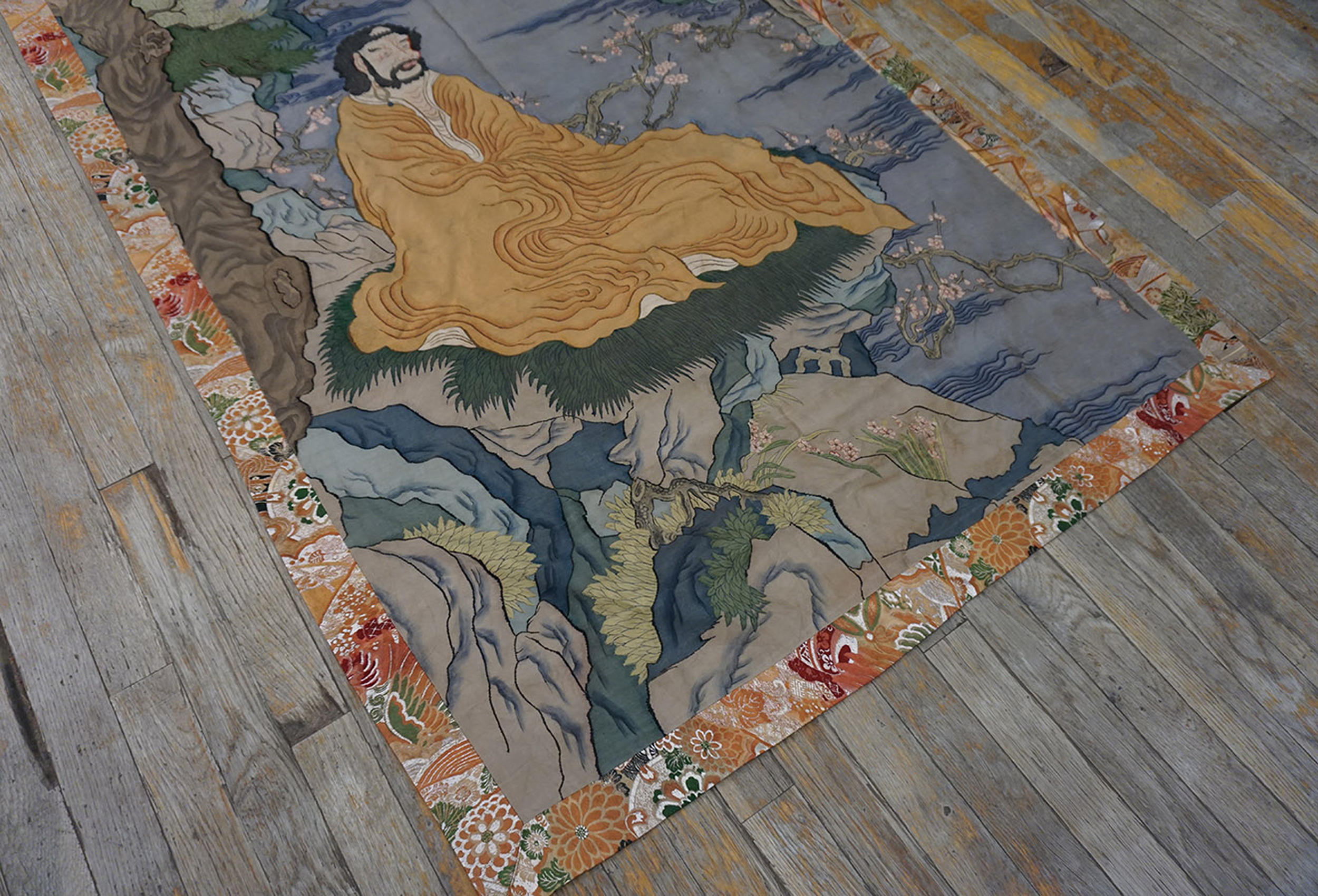 Executed with remarkable detail, the scene depicts a solitary figure—likely a scholar or immortal—meditating amidst craggy mountains and ancient pine trees, rendered in a muted palette of sage greens, soft blues, and ochre. The construction suggests a highly refined form of textile art, where shading and perspective are achieved through meticulous weaving or embroidery techniques, giving the composition a distinctly painterly quality.
