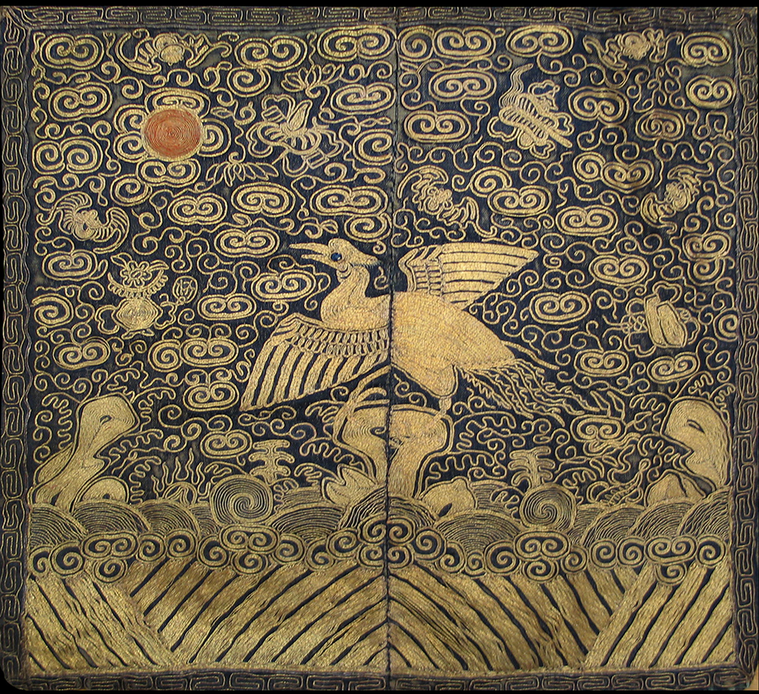 The technical mastery evident in this piece elevates it beyond standard weaving. Classified as a textile, the surface is densely covered with intricate needlework, depicting a magnificent central phoenix soaring amidst swirling Ruyi clouds. The texture is rich and dimensional, capturing the movement of the mythical bird and the stylized waves below.