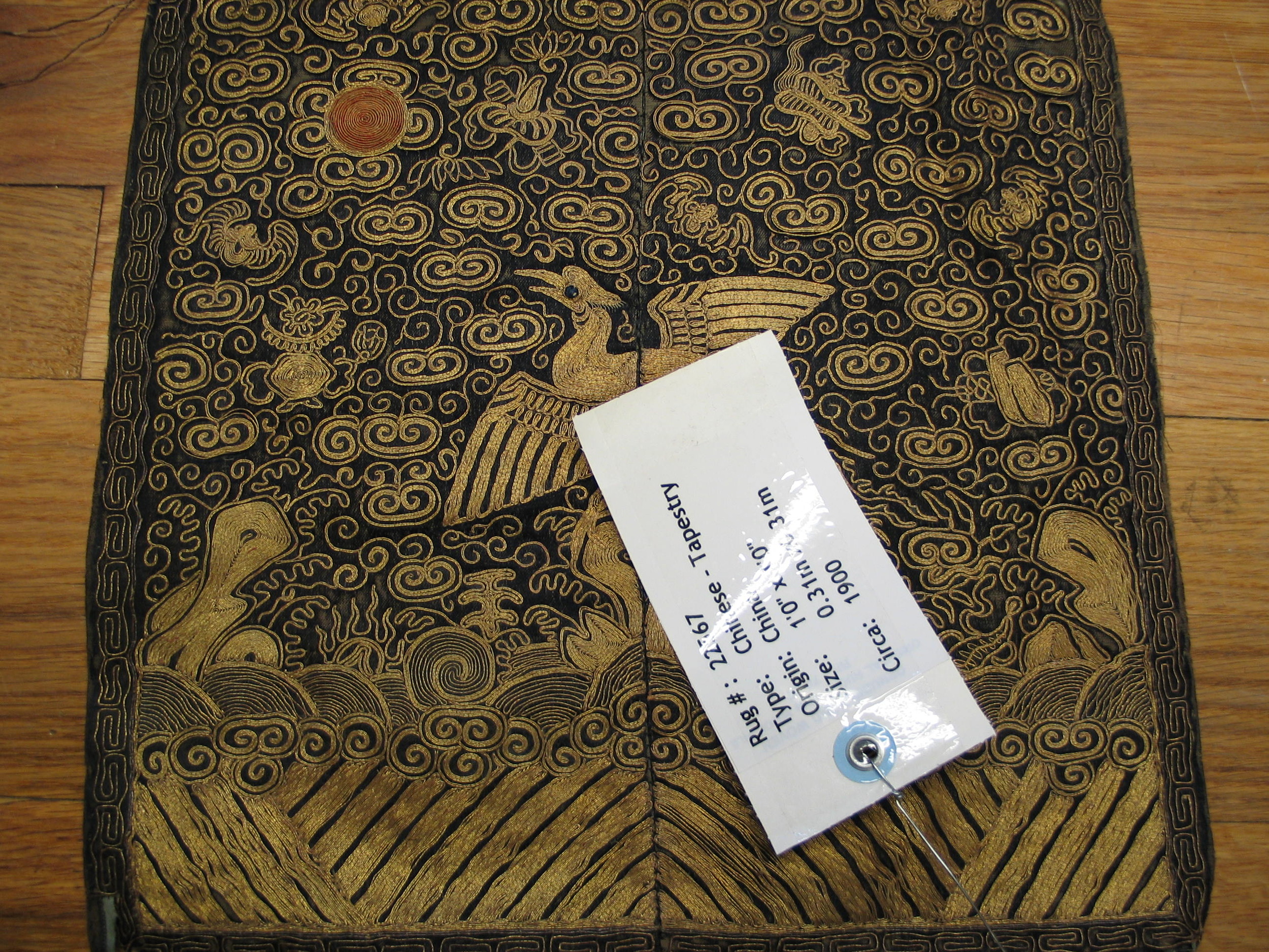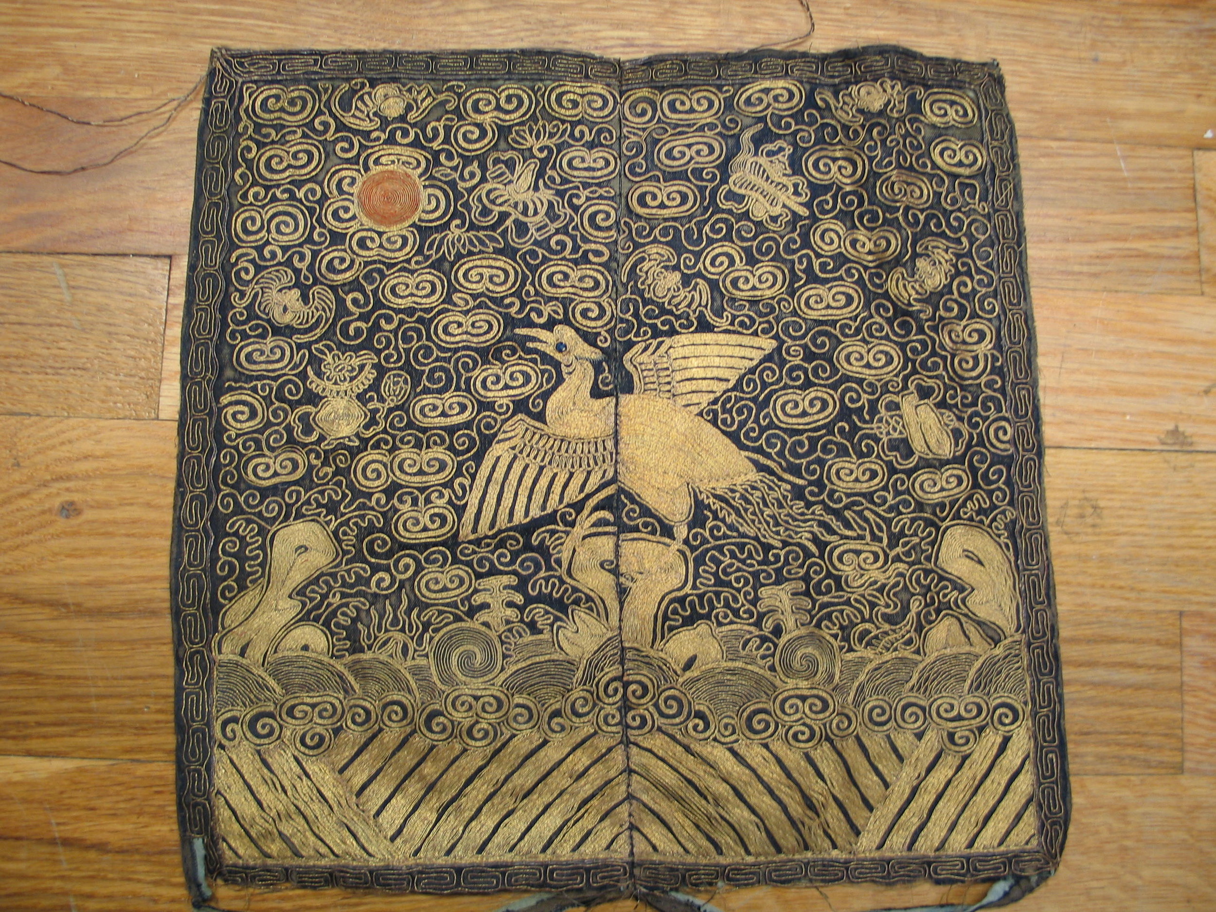 Antique Chinese – Textile Small Scatter Size Wool Black Rug, Circa Date: 1900s. This exquisite piece represents the finest tradition of antique rugs from the late Qing Dynasty period. While titled a rug, its construction suggests it is a highly detailed embroidered or woven textile, likely intended for ceremonial display rather than floor use, presented here in a desirable small scatter size.