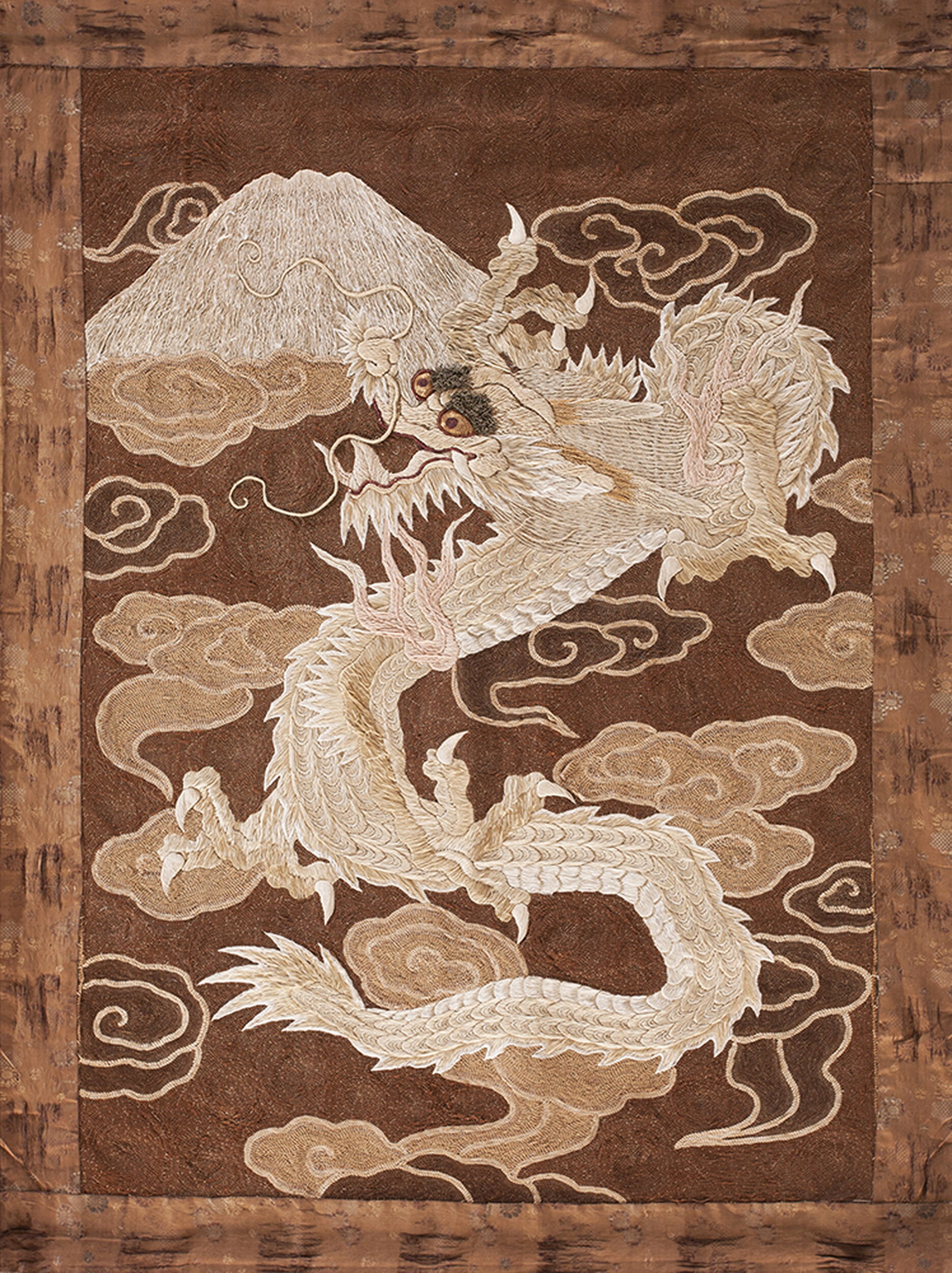 Antique Chinese Textile Small Wool & Silk Brown Dragon Embroidery Wall Hanging, Circa Date: 1890s. This exceptional late Qing Dynasty textile presents a powerful mythological scene, masterfully rendered through intricate needlework that elevates the piece beyond standard embroidered textiles into the realm of fine art.