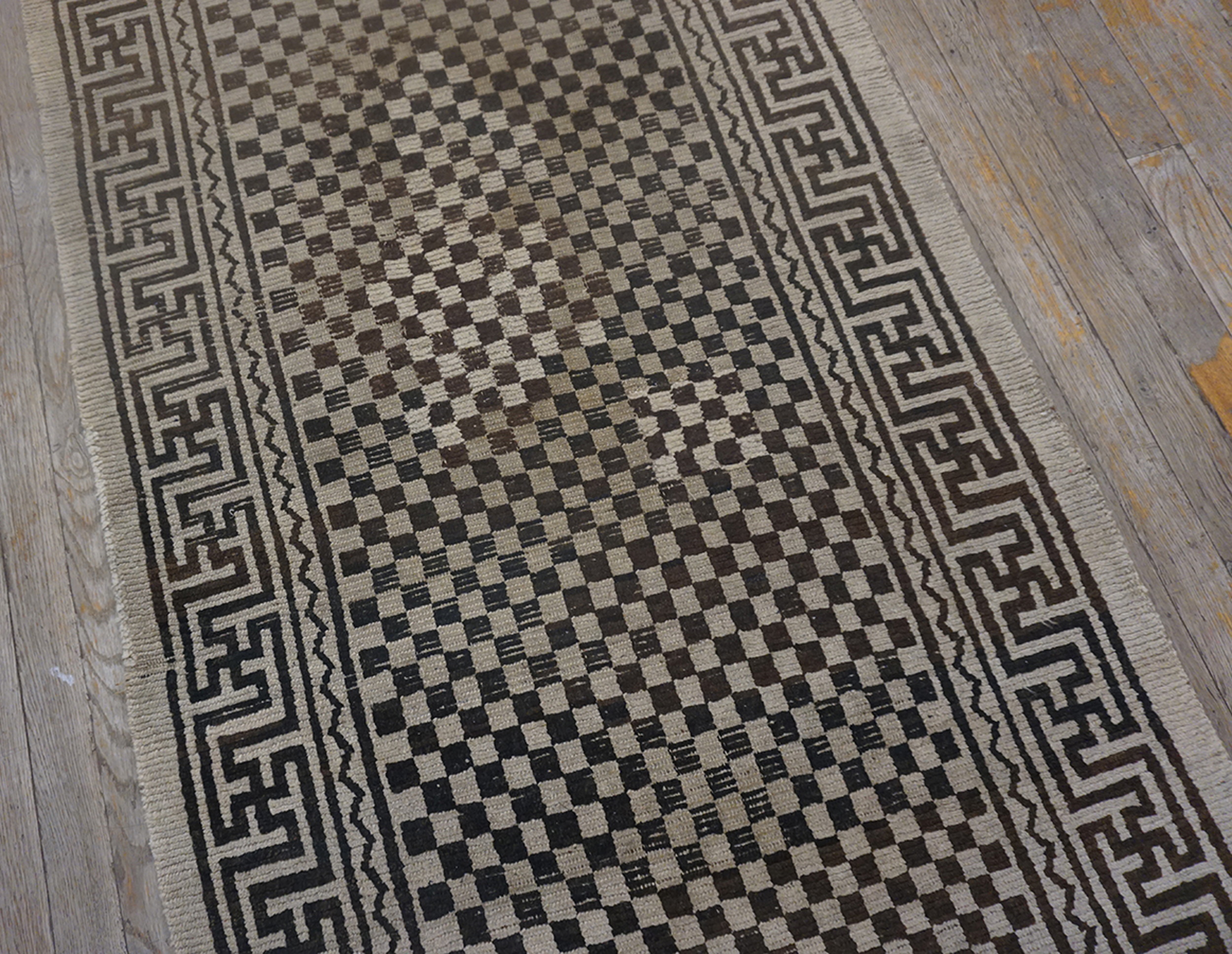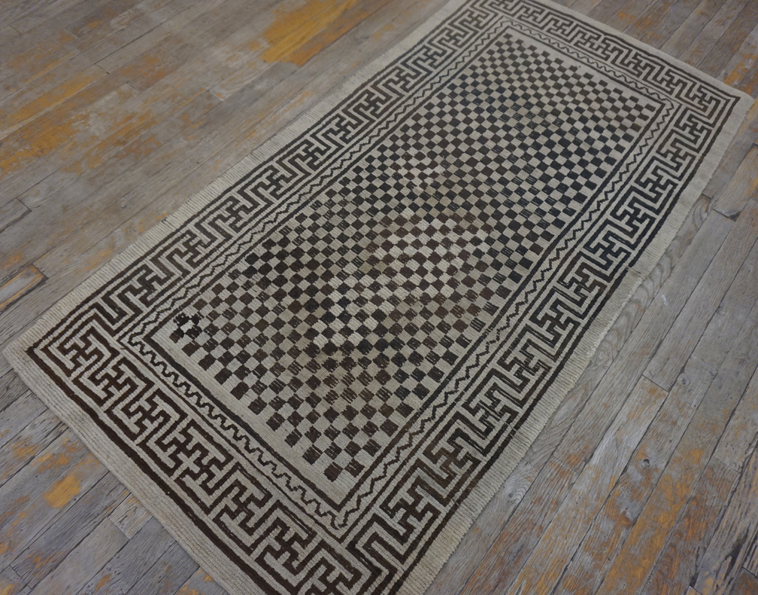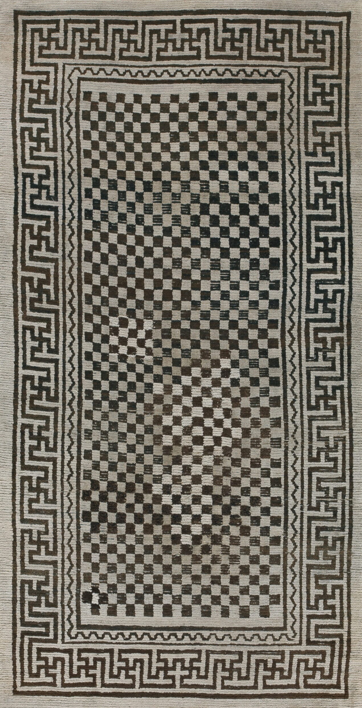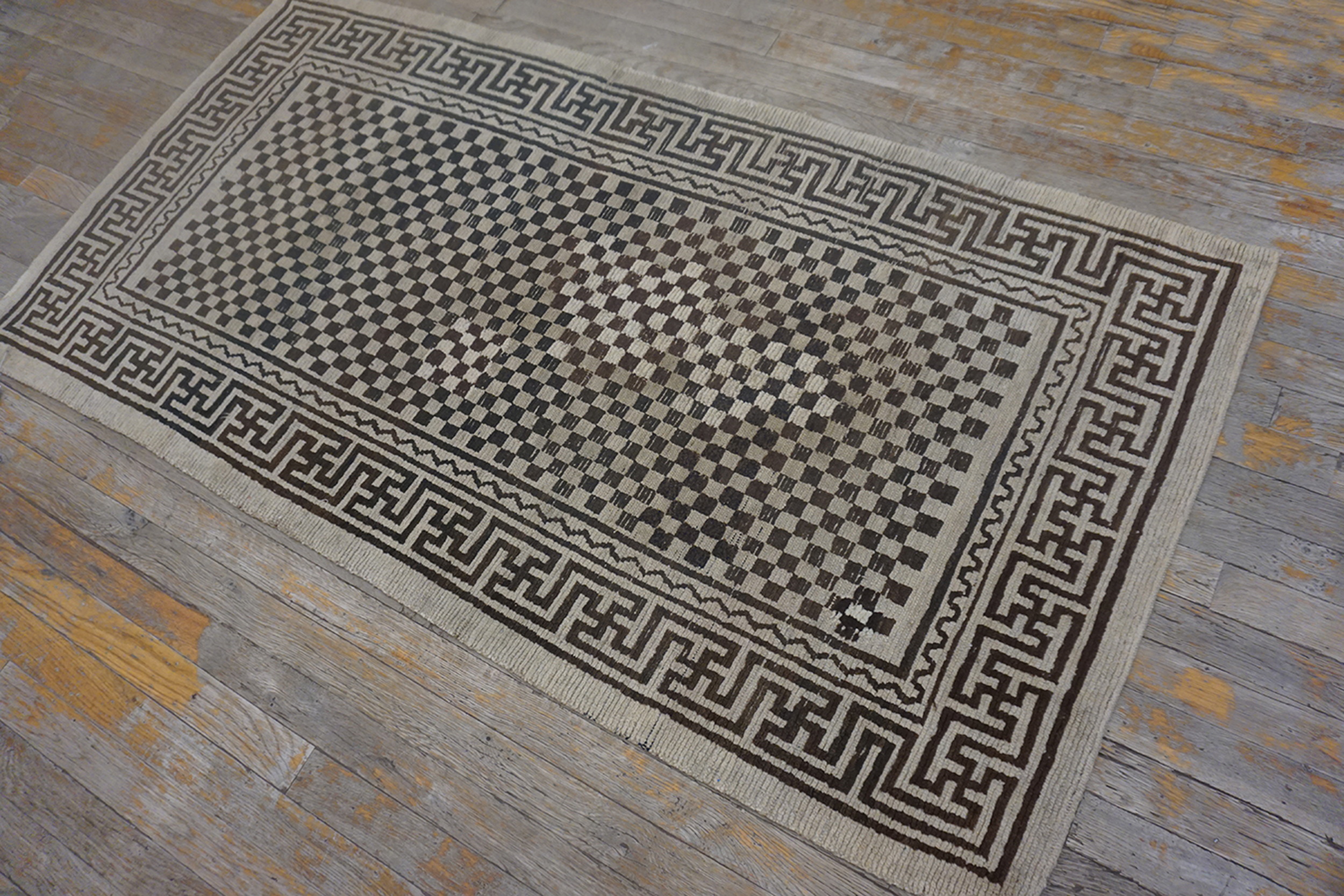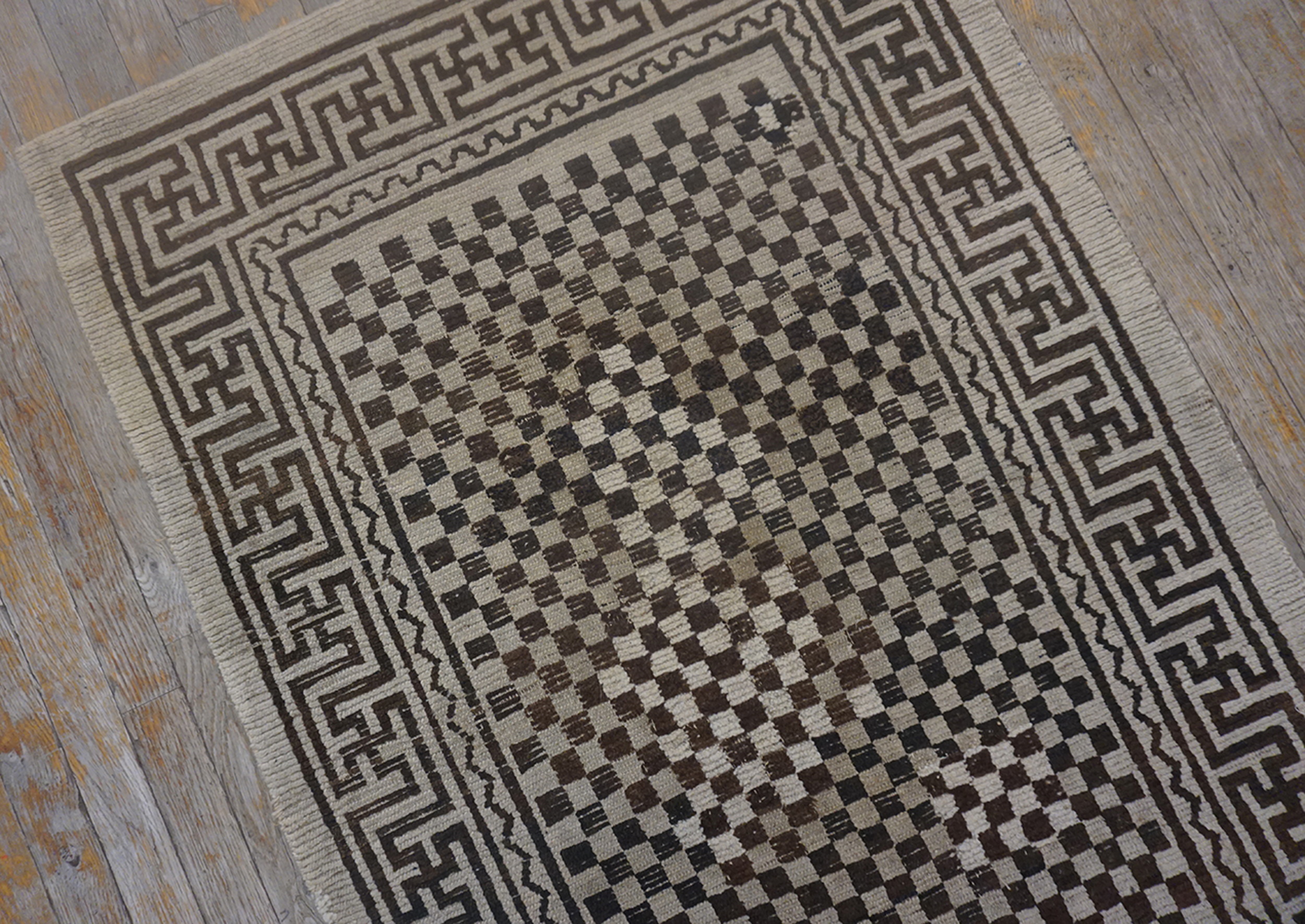 The overall composition is a masterclass in restrained symmetry. While highly geometric, the repeating squares create an effective allover design that draws the eye across the entire surface, providing texture and depth rather than a singular focal point. This Tibetan-influenced Chinese rug remains a timeless example of early modern textile art.