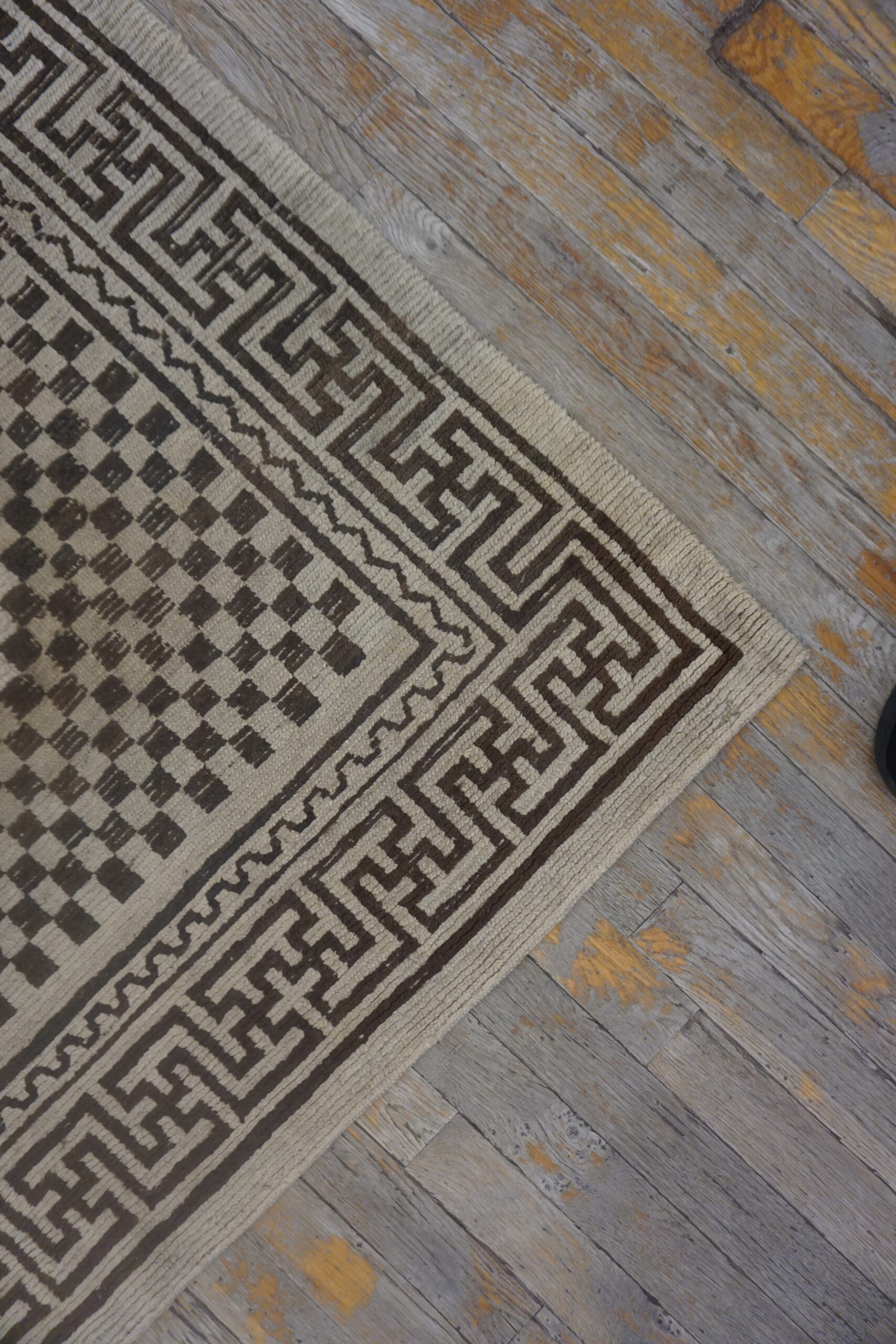 Antique Chinese – Tibetan Ivory 1930s Rug, Circa Date: 1930s. This exceptional piece exemplifies the geometric boldness often found in early 20th-century antique rugs from the region. Its design relies on a powerful, high-contrast palette, typical of the transitional period between traditional Chinese motifs and the emerging Art Deco aesthetic.