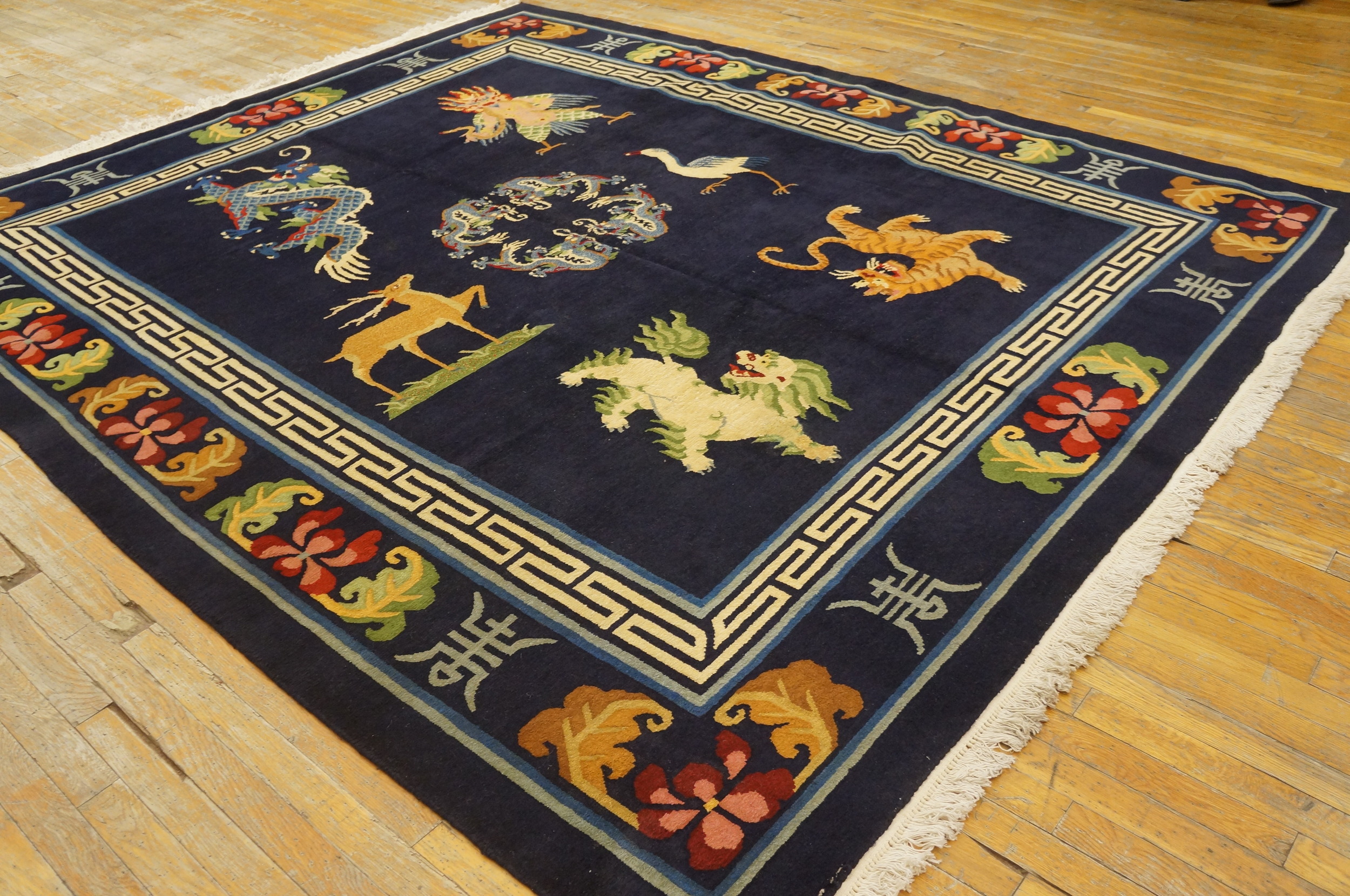 The rarity of such a ful rug, especially one that so eloquently balances fierce mythological imagery with refined color application, makes it a significant collector’s item. It represents a superb example of early 20th-century East Asian textile art and is a distinguished addition to our curated collection of antique rugs.