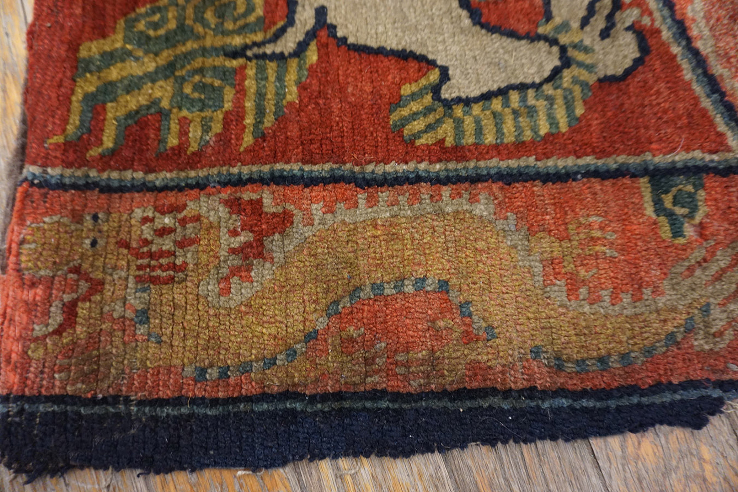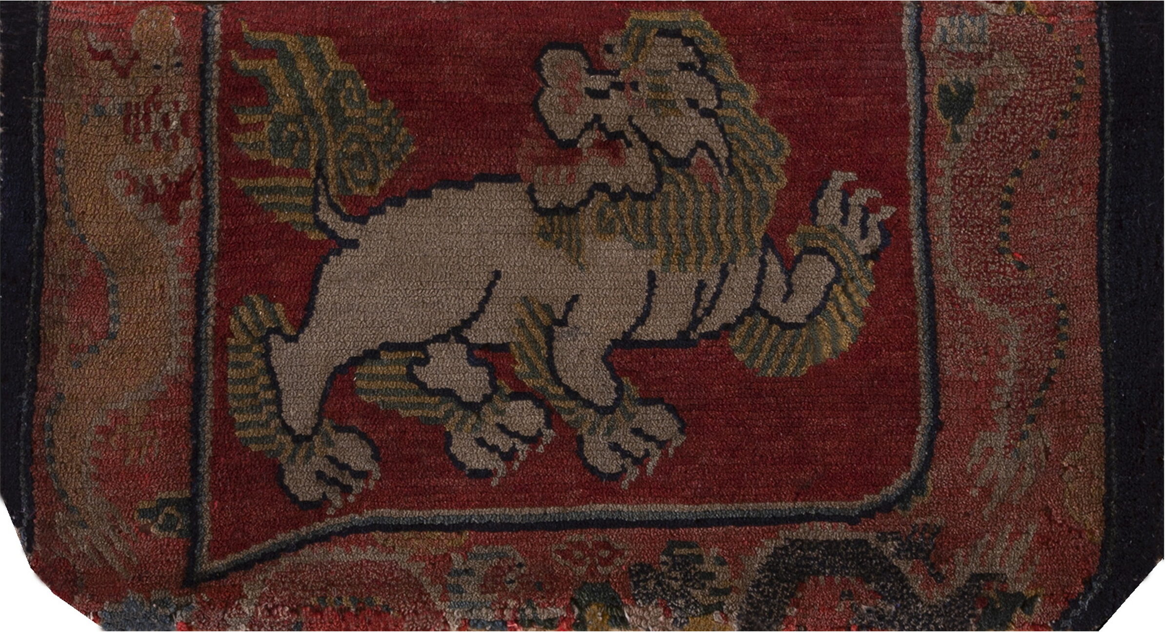 Unlike the more fluid designs of contemporary Chinese court carpets, this Tibetan piece utilizes bold, angular outlines and a structured composition. Even the mythical creature is rendered with a strong, graphic quality, emphasizing the underlying geometric patterns that define the border and frame the central medallion.