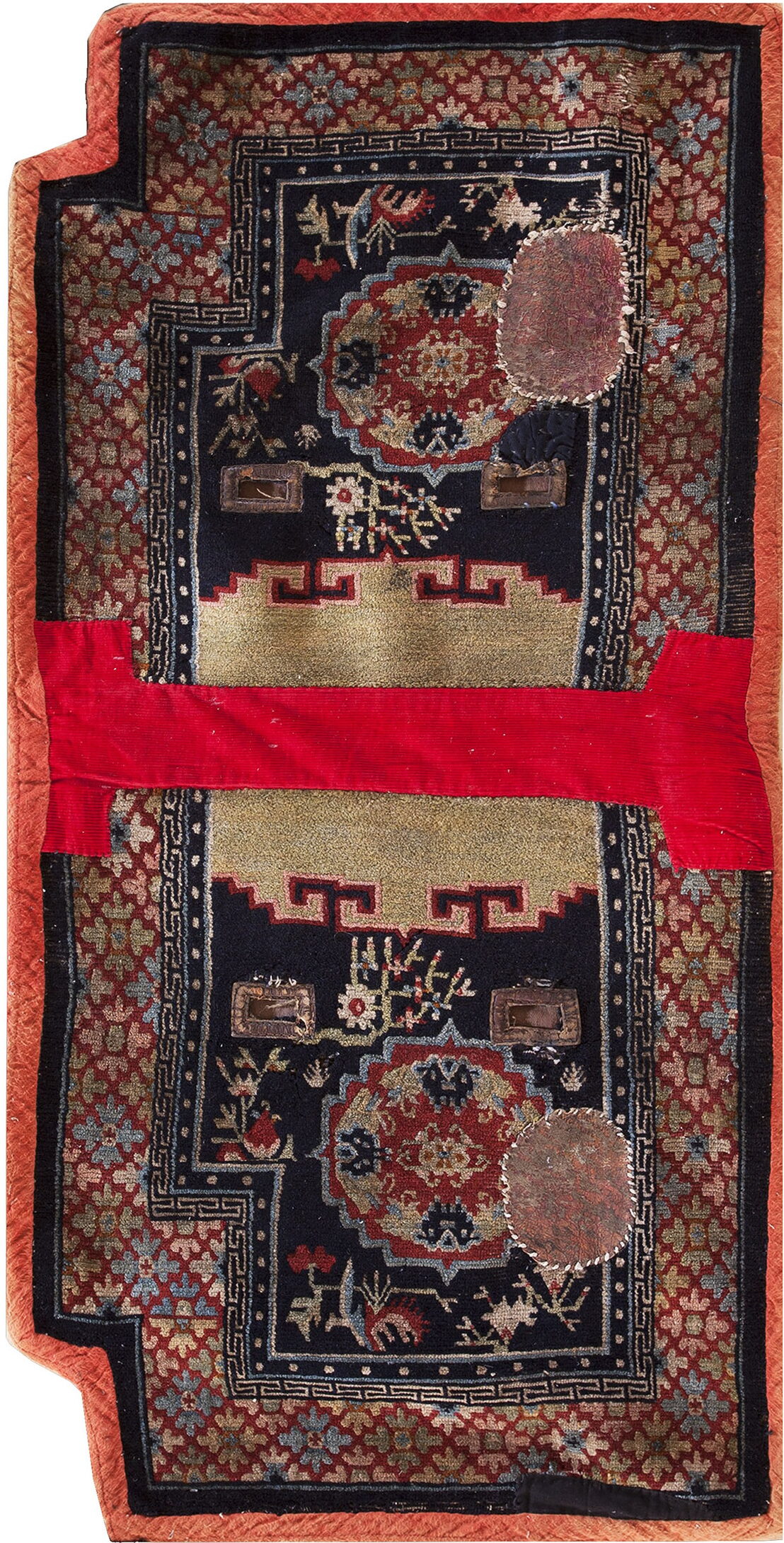 While the exact function is unknown—it may have served as a highly decorative seat cover or a saddle rug—its dimensions classify it as a desirable small scatter size. The strong vertical orientation emphasizes the central medallion structure, which is flanked by stylized cloud bands and geometric stepped forms.
