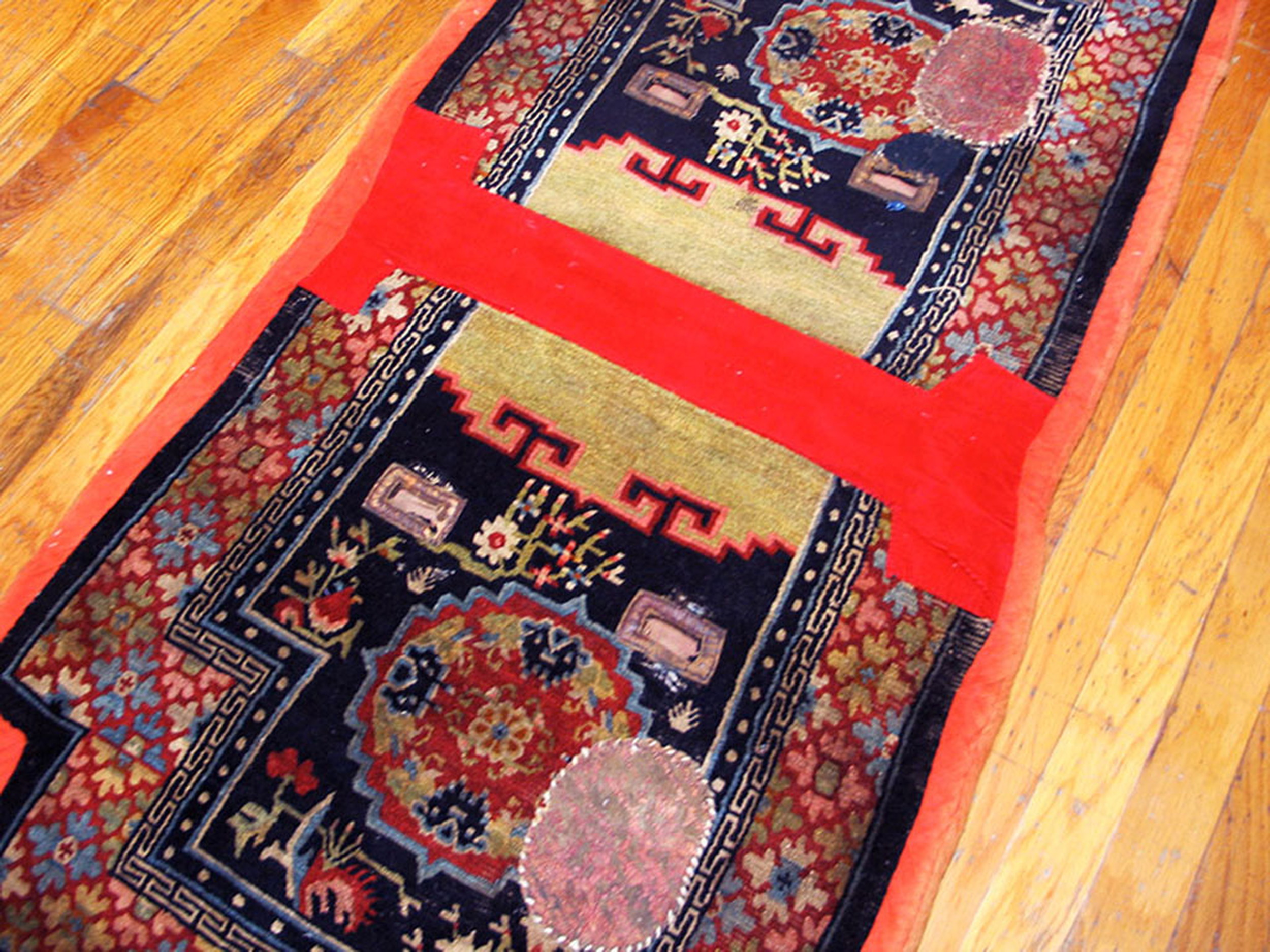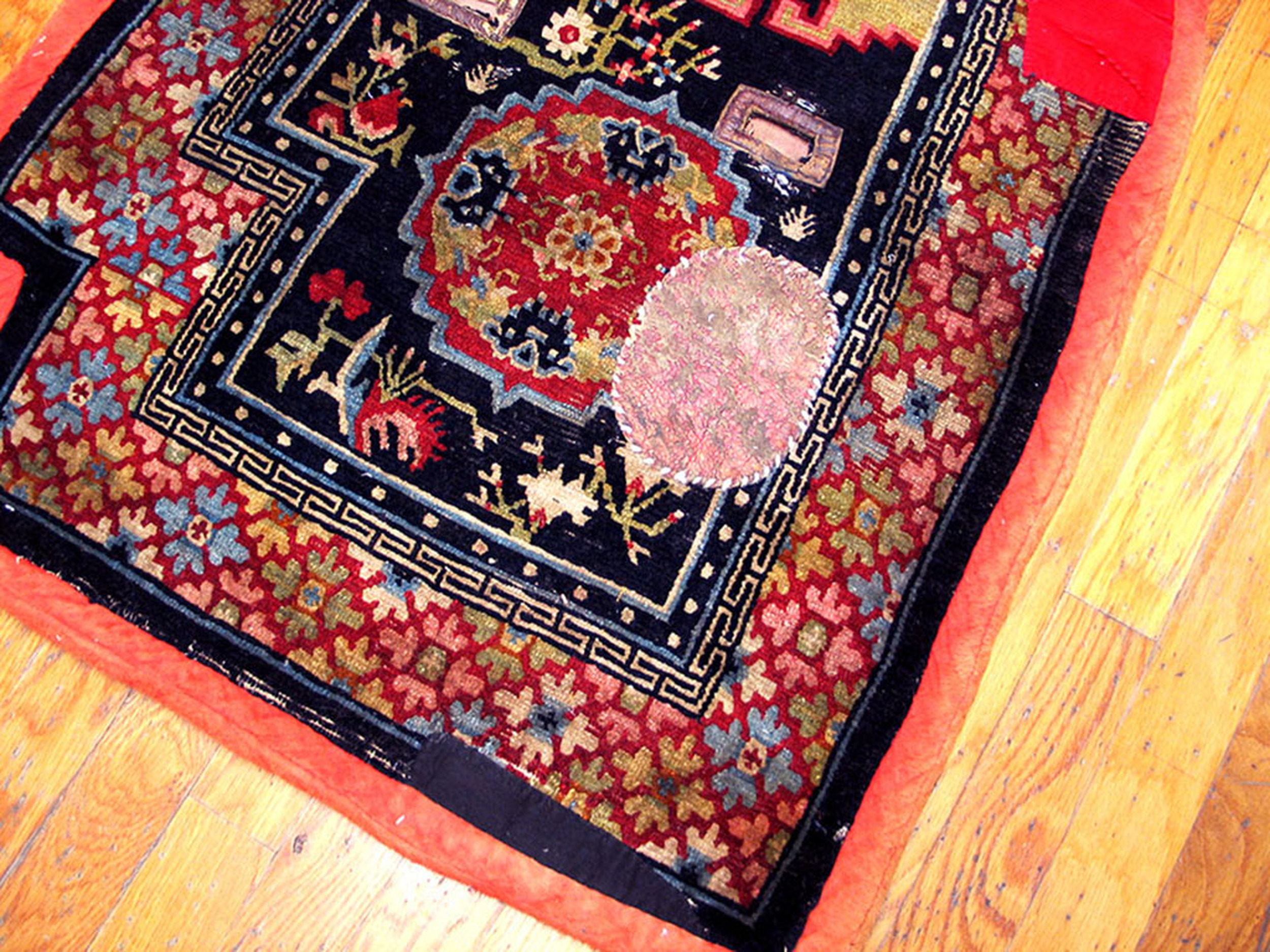 This piece bears the patina of age, displaying compelling signs of wear and historical repairs, including the prominent red velvet appliqué, which speaks to its long life and intrinsic value as a genuine antique rugs. It is a powerful example of early 20th-century Chinese textile art, prized for its unique character and graphic intensity.