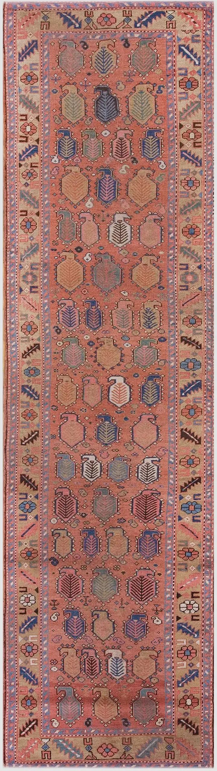 The composition employs a highly idiosyncratic allover design featuring repeating, stylized amphora or leaf forms arranged in neat rows. This tribal interpretation of classic Persian motifs avoids a central medallion, allowing the eye to travel the length of the textile unimpeded. The rustic geometry of the border provides a strong frame, balancing the complexity of the field with traditional tribal iconography.