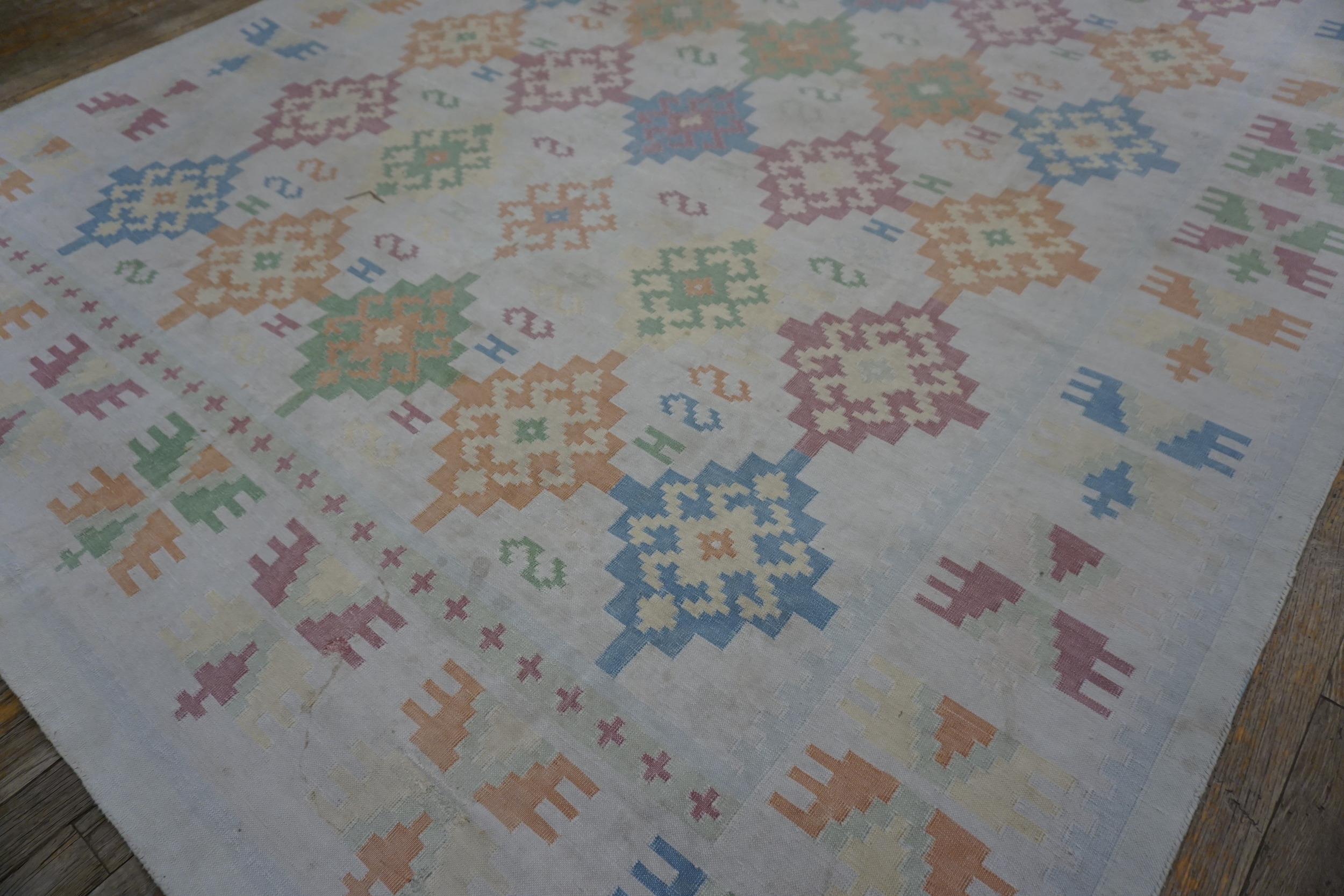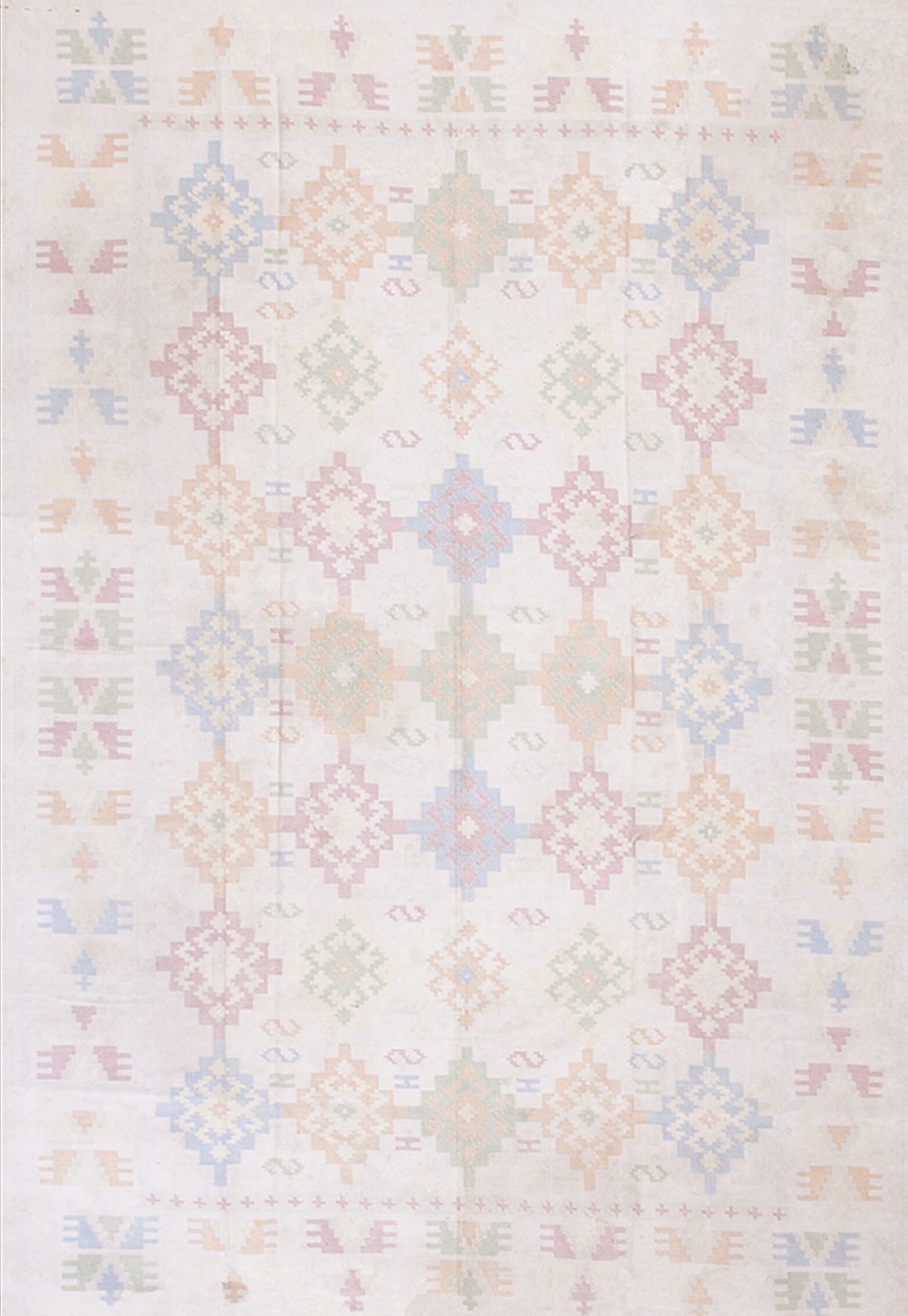 Woven primarily in cotton, the foundation provides a luminous, near-white field, placing it among our most desirable ivory color rugs. The ground is gently offset by a sophisticated palette of faded rose, pale sky blue, and soft mint green, colors that suggest a light, airy disposition perfect for contemporary interiors.