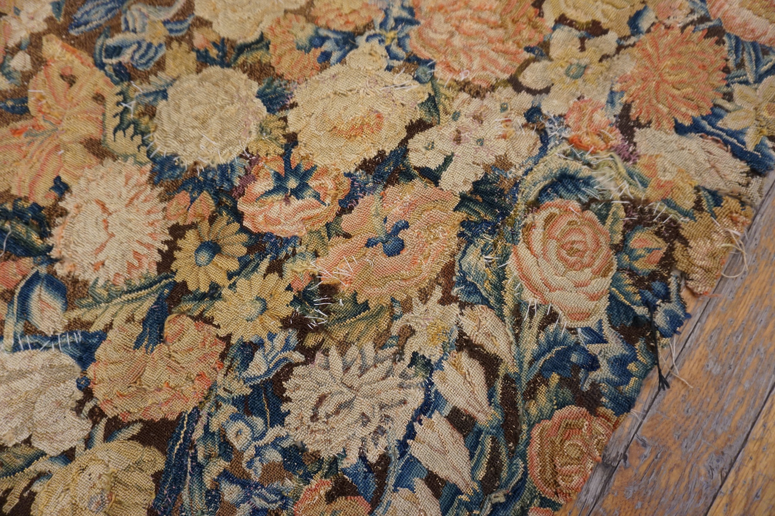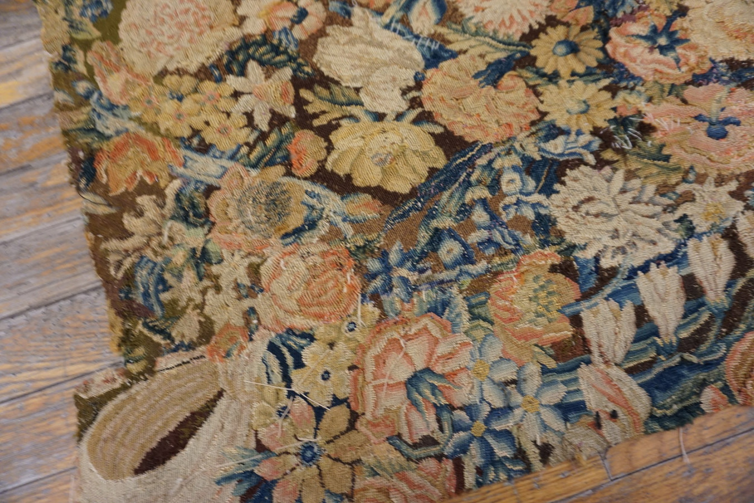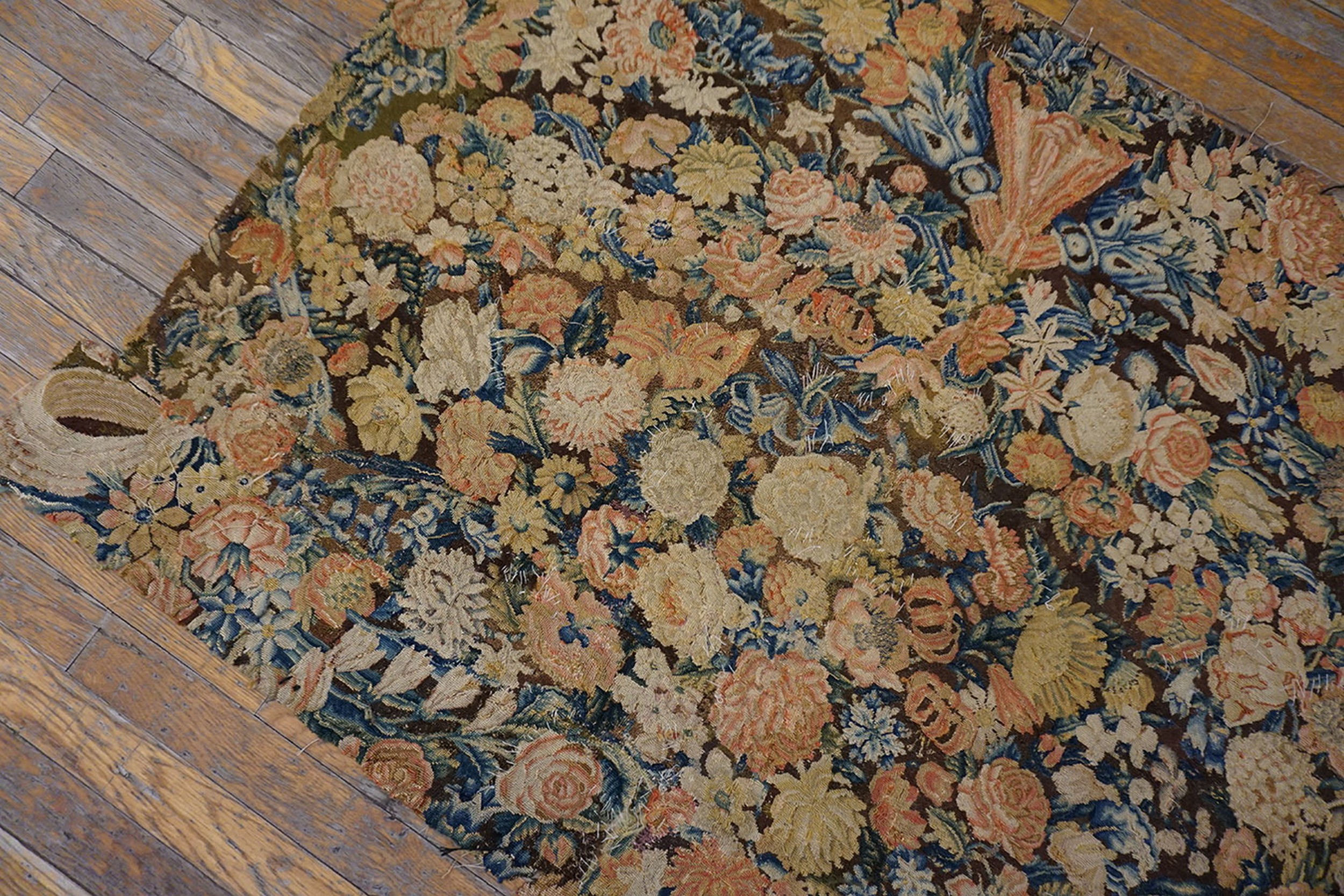 Antique Needlepoint English Floral Knotted Rug, Circa Date: 1700s. This exceptional piece exemplifies the height of English textile artistry during the Georgian era. The densely packed design, reminiscent of a millefleurs tapestry, showcases a tradition of European weaving that defines the category of antique rugs.
