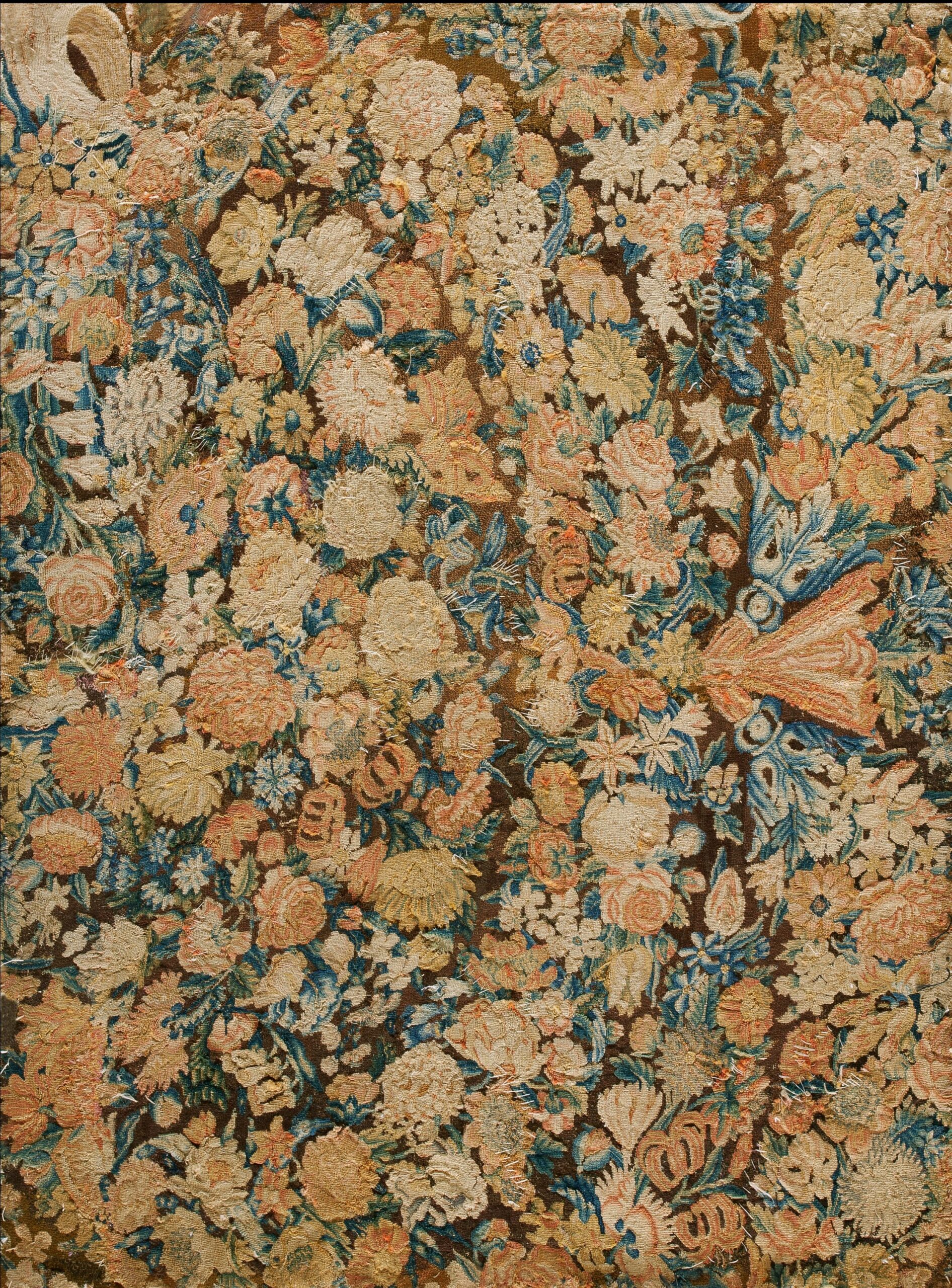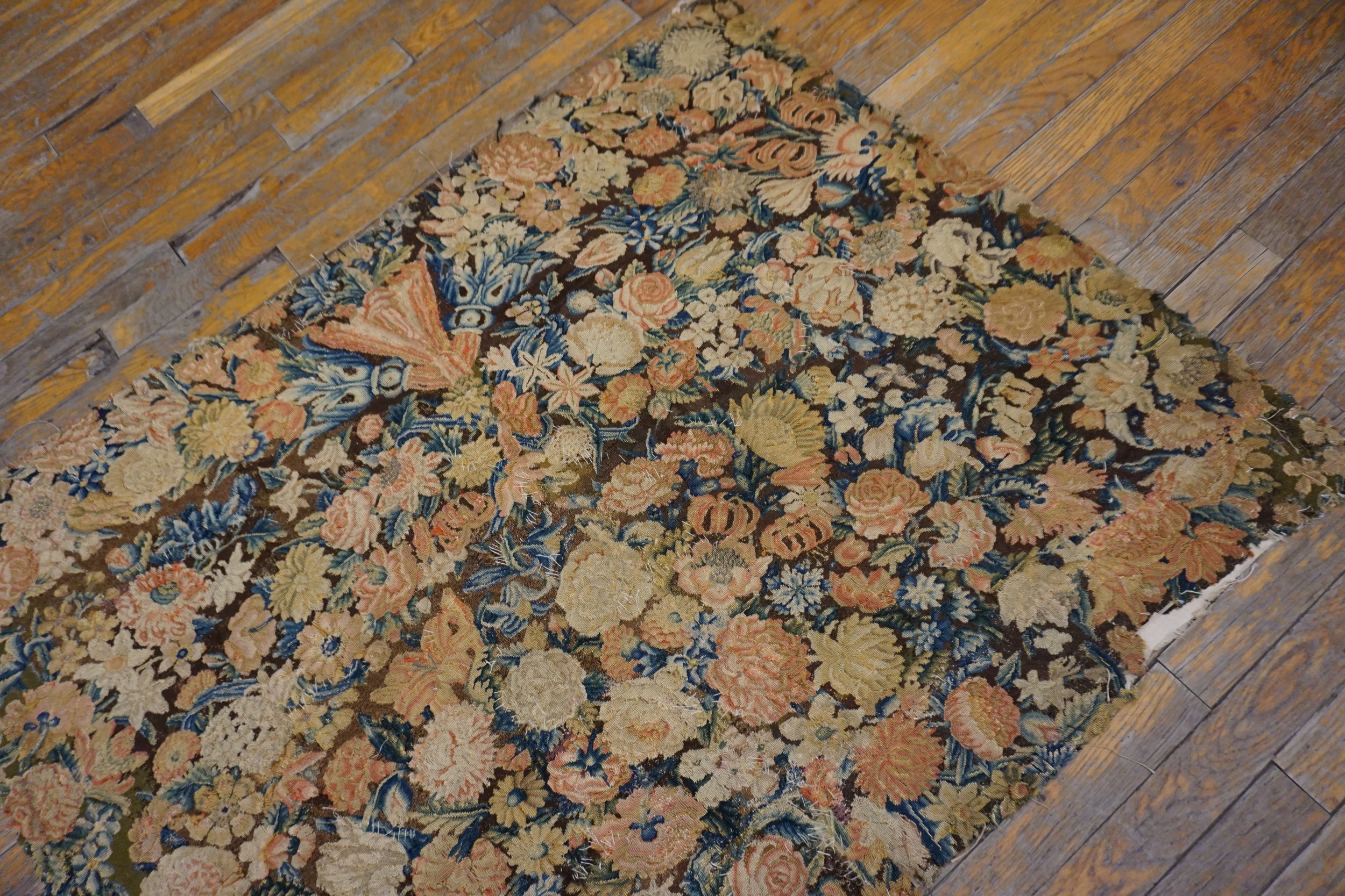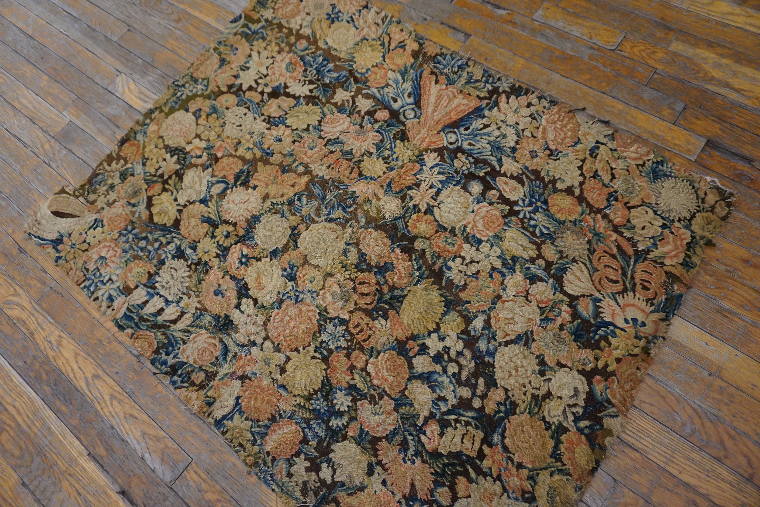 Antique Needlepoint English Floral Knotted Rug, Circa Date: 1700s. This exceptional piece exemplifies the height of English textile artistry during the Georgian era. The densely packed design, reminiscent of a millefleurs tapestry, showcases a tradition of European weaving that defines the category of antique rugs.