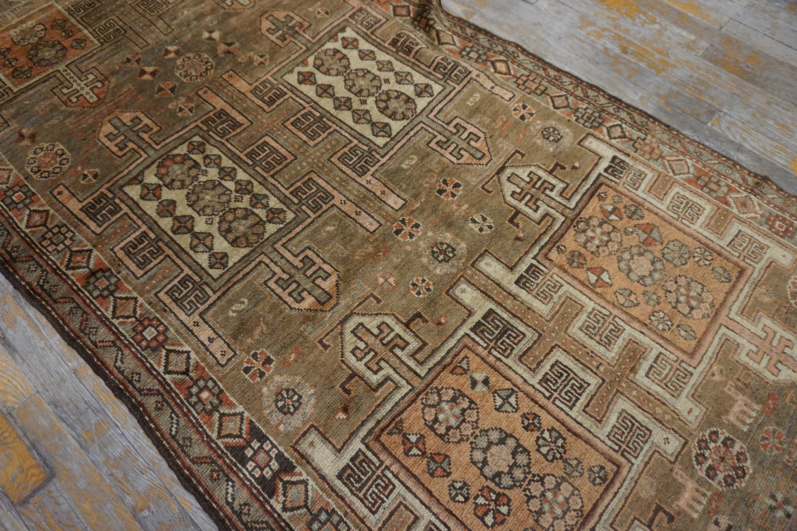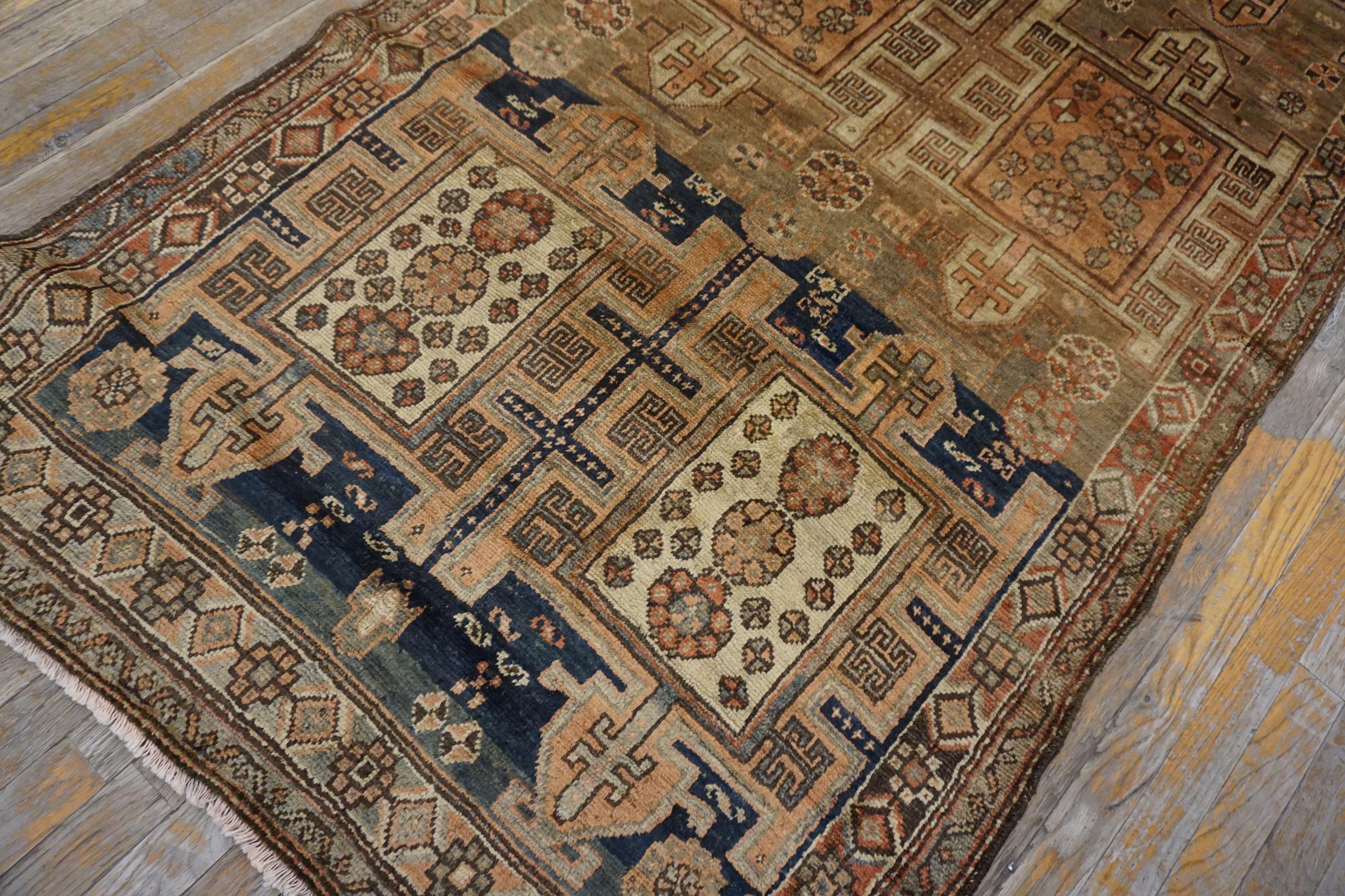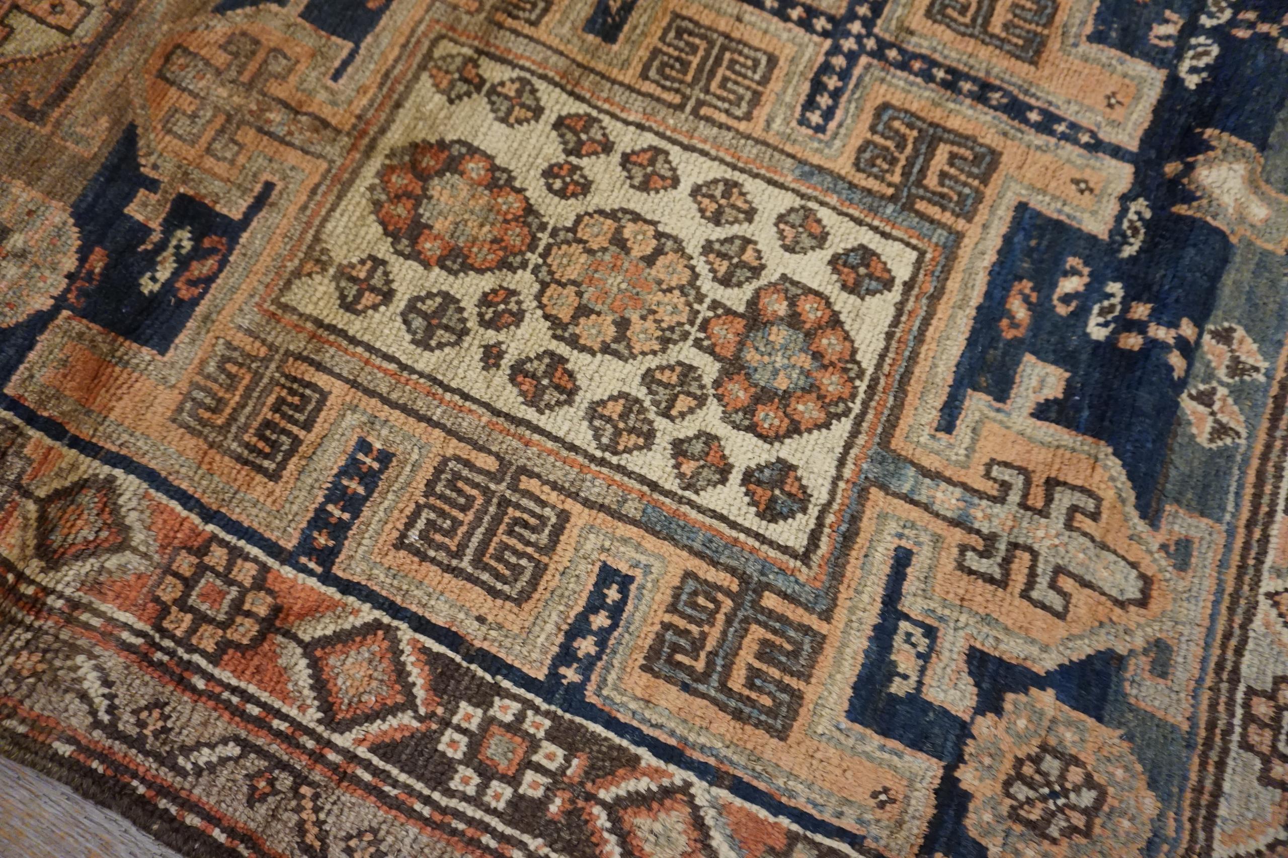 This early 20th-century antique tribal Northwest Persian rug is a rugged and soulful monument to the nomadic weaving traditions of the Azerbaijan and Kurdistan borderlands. While many city Persian rugs of the era focused on delicate floral symmetry, this long, narrow “Kenareh” format piece is defined by its fierce geometric character and its deep connection to the high-altitude landscape of the Zagros Mountains.