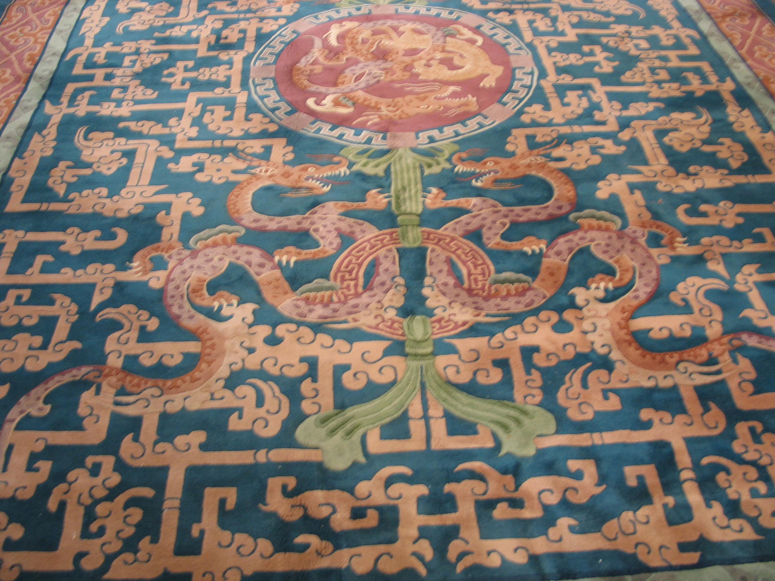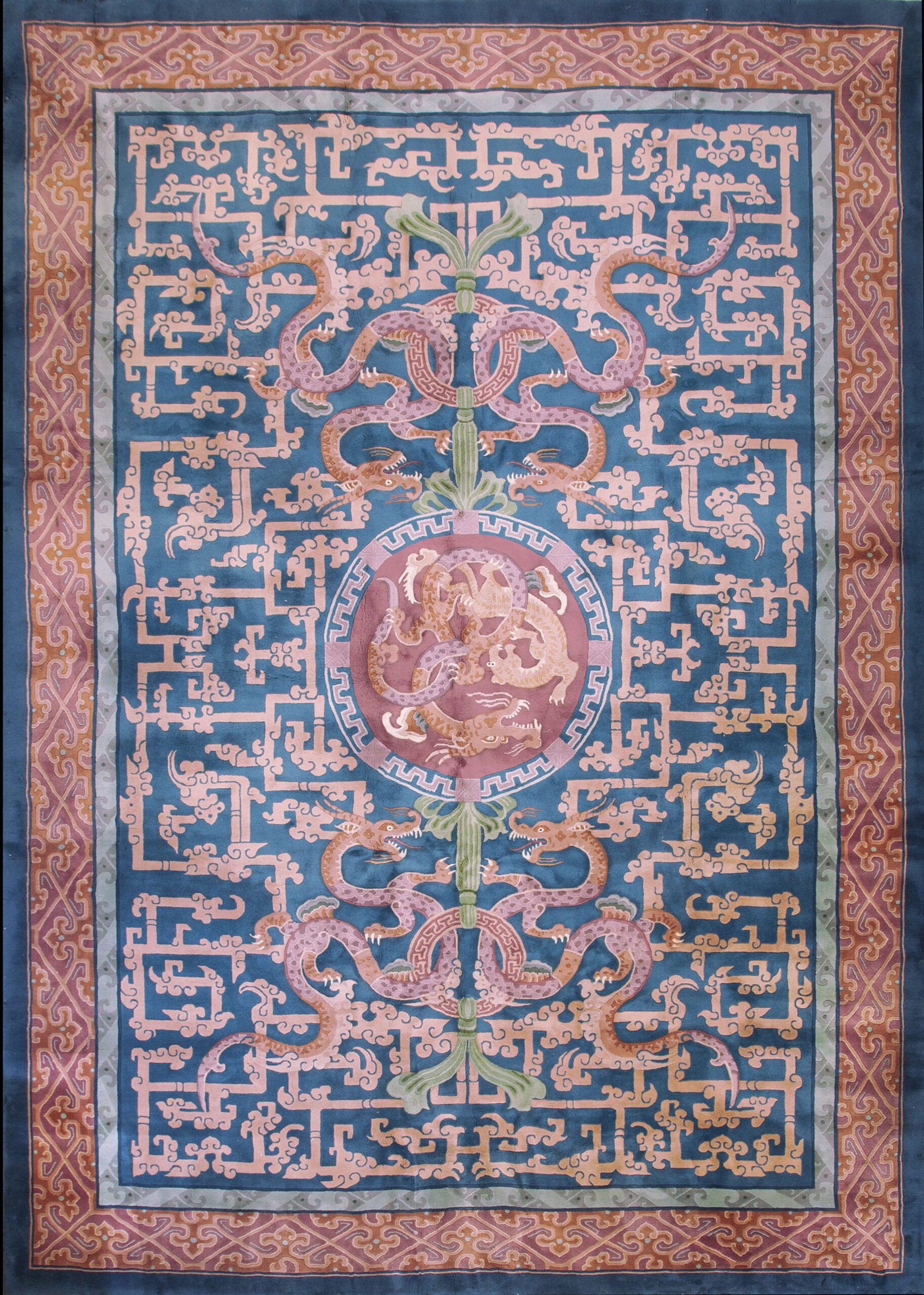 The design features powerful, sinuous dragons—symbols of imperial power and good fortune—intertwined within a central medallion and repeated in flanking pairs. The substantial dimensions suggest this rug was intended as a central focal point, classifying it among the most impressive room size rugs of its type.