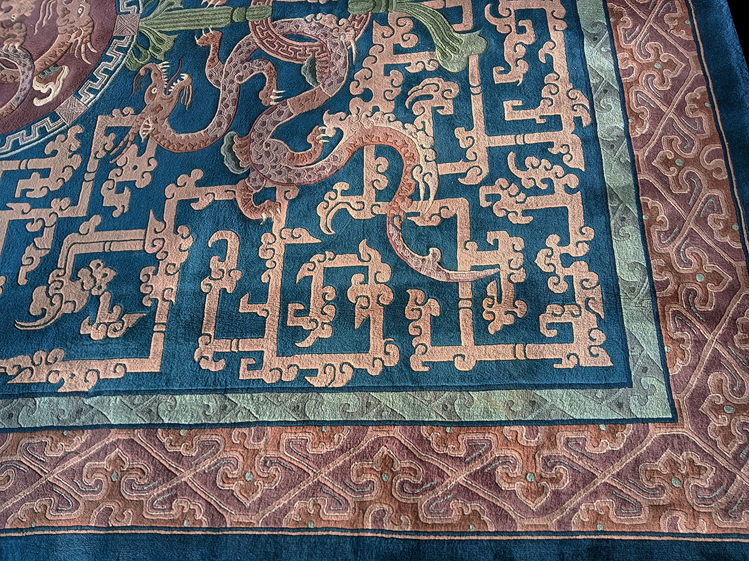 Antique Chinese – Art Deco Chinese Blue 1930s Blue Rug, Circa Date: 1930s. This magnificent piece is a superb example of the Art Deco movement as interpreted by Chinese weavers during the 1930s. The bold coloration and symbolic density elevate it beyond typical period pieces, making it a highly desirable addition to any collection of antique rugs.