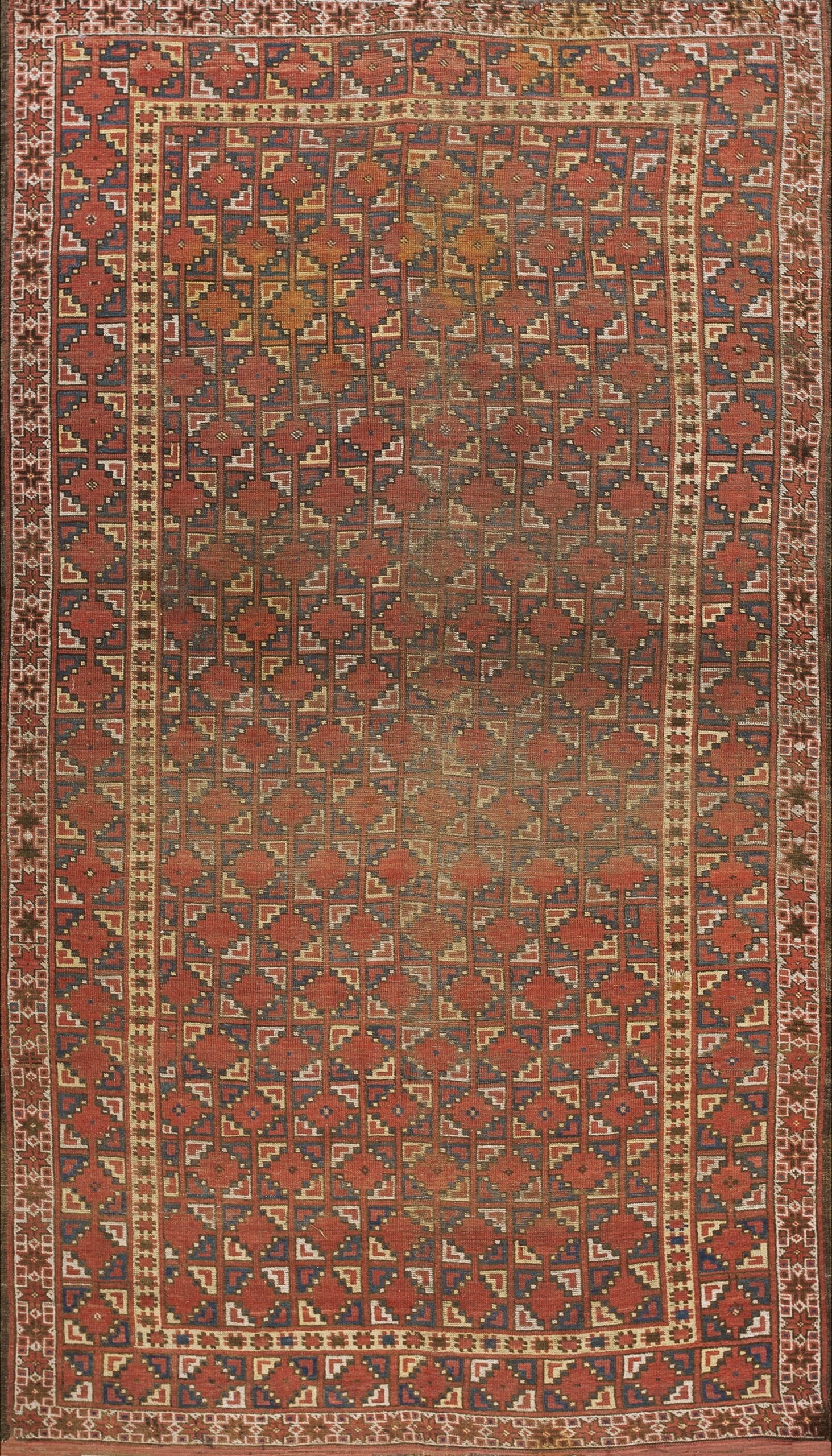 Antique Ersari – Beshir Russia Geometric Knotted Rug, Circa Date: 1875. This superb example of Central Asian weaving represents the finest traditions of the Ersari tribe, specifically those attributed to the Beshir region near the Amu Darya river. Its deeply saturated wool and precise geometric structure mark it as a distinguished piece among antique rugs.