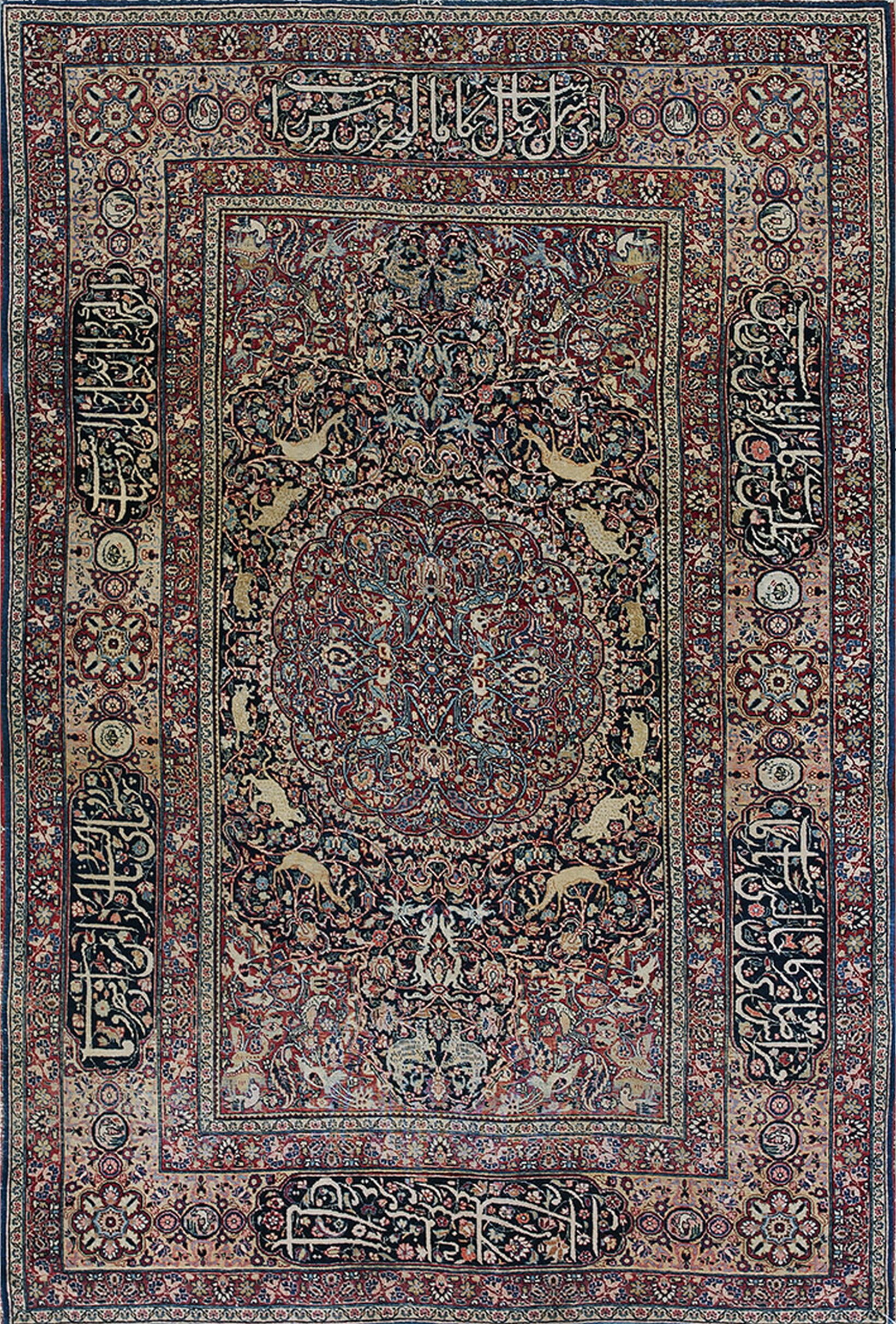 The masterful use of natural dyes creates a rich tapestry of color, where deep rust, cream, and subtle teal accents play against the primary blue color rugs foundation. Notably, the main border features prominent cartouches containing elegant Nasta’liq calligraphy, adding a layer of cultural and historical significance rarely seen in this format.