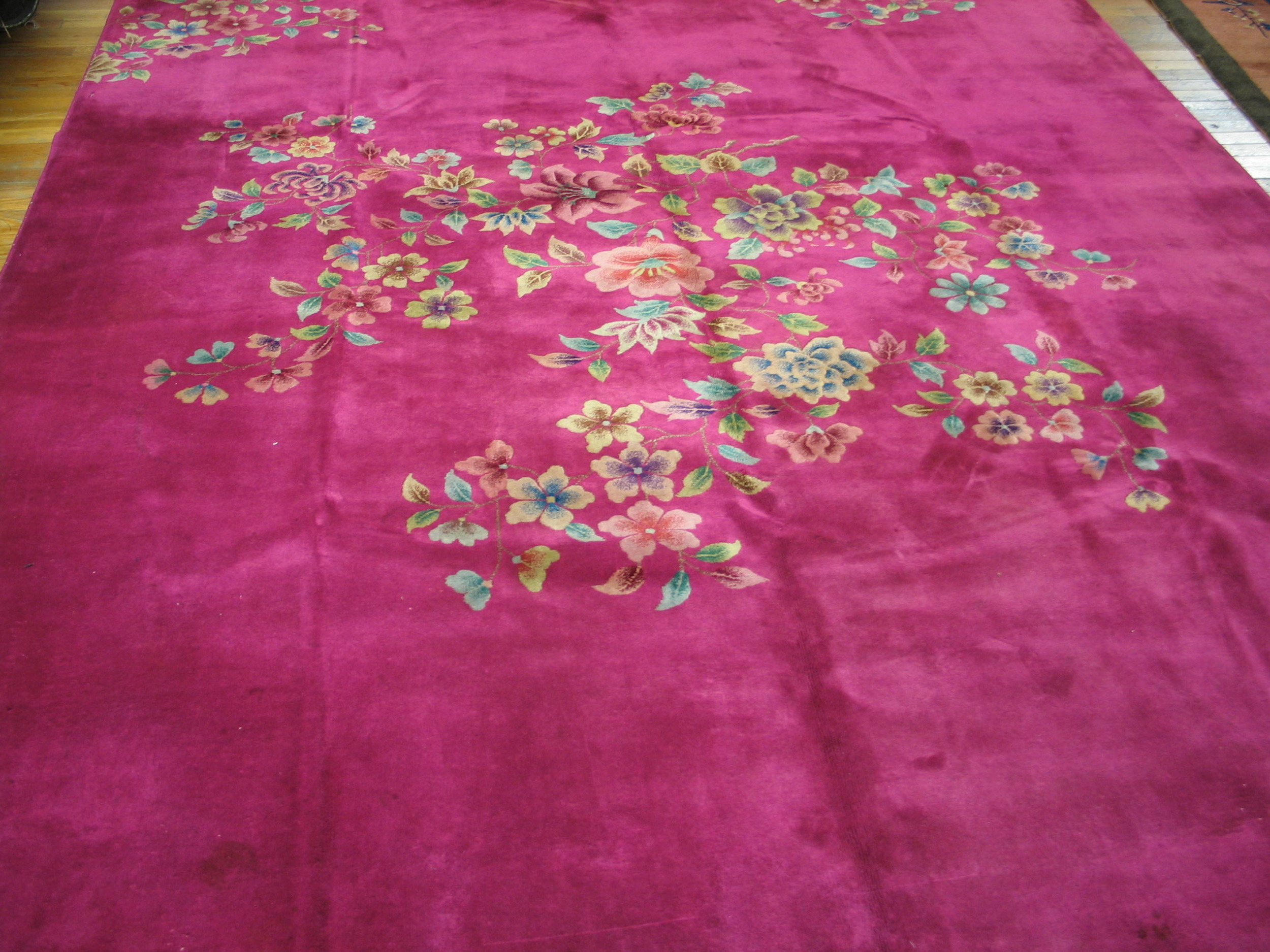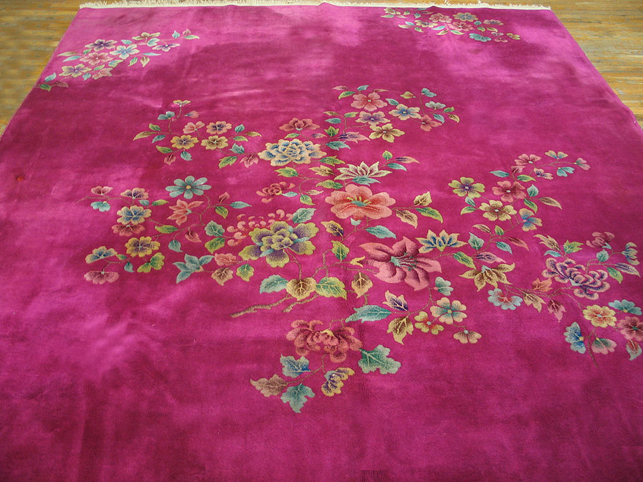 Hand-knotted from luxurious wool pile, the composition features an open field design, characteristic of the era’s departure from rigid traditional borders. Scattered across the vibrant ground are finely articulated sprays of blossoms and delicate foliage, placing this piece among the finest examples of floral rugs from the early 20th century.