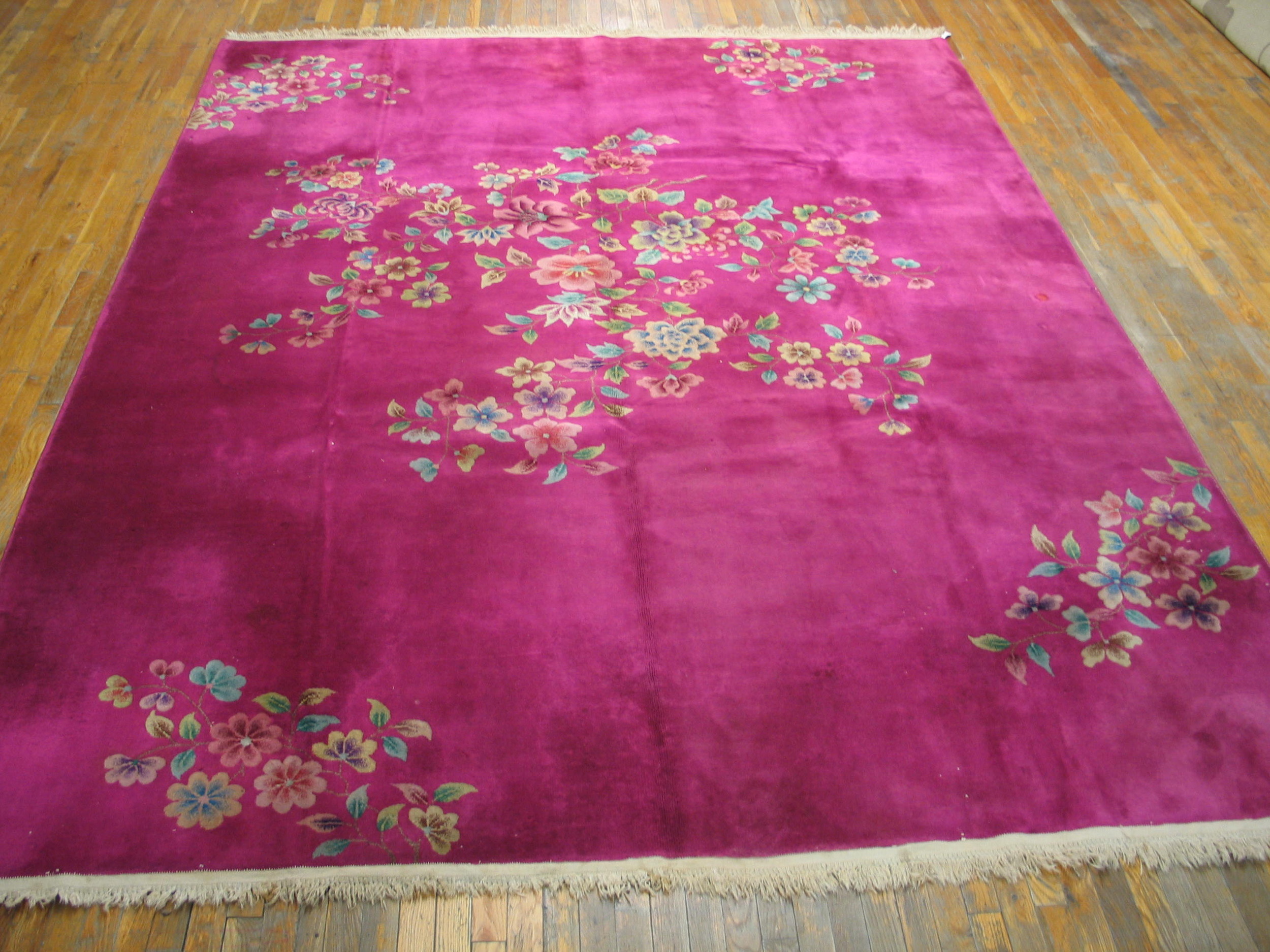 Room Size Rugs (8.09ft x 11.02ft), Circa Date: 1930s. This exceptional piece captures the bold aesthetic of the Art Deco period, rendered in a stunning field of purple / lavender mauve color. The deep, saturated hue provides a dramatic, monochromatic backdrop that allows the subtle variations in the wool’s texture to emerge.