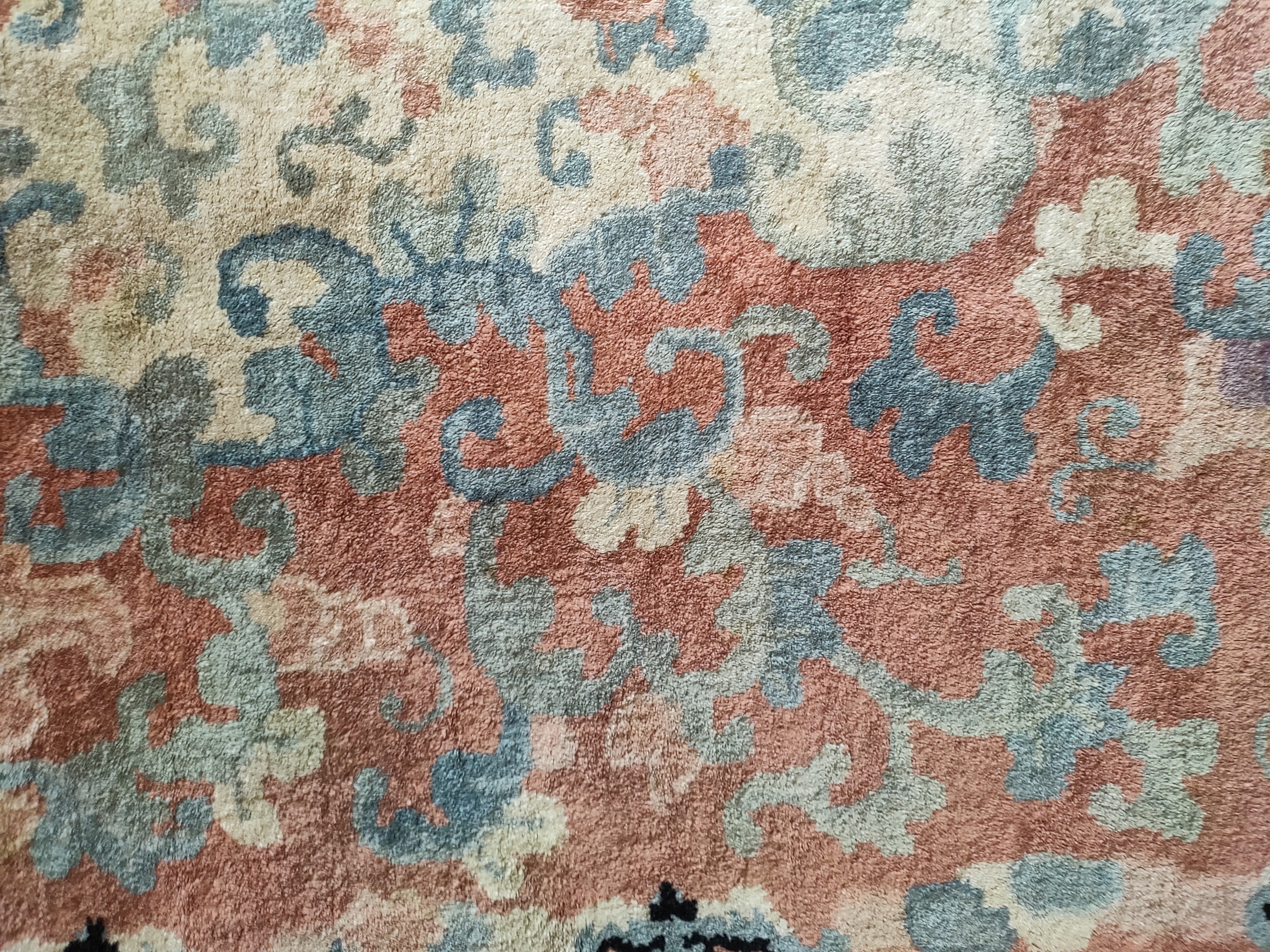 Antique Chinese – Art Deco Chinese Coral 1925 Rug, Circa Date: 1925. This exceptional piece perfectly captures the transitional aesthetic of the early 20th century, blending traditional Chinese scrolling designs with the emerging Art Deco sensibility. It stands as a prime example within our collection of antique rugs.