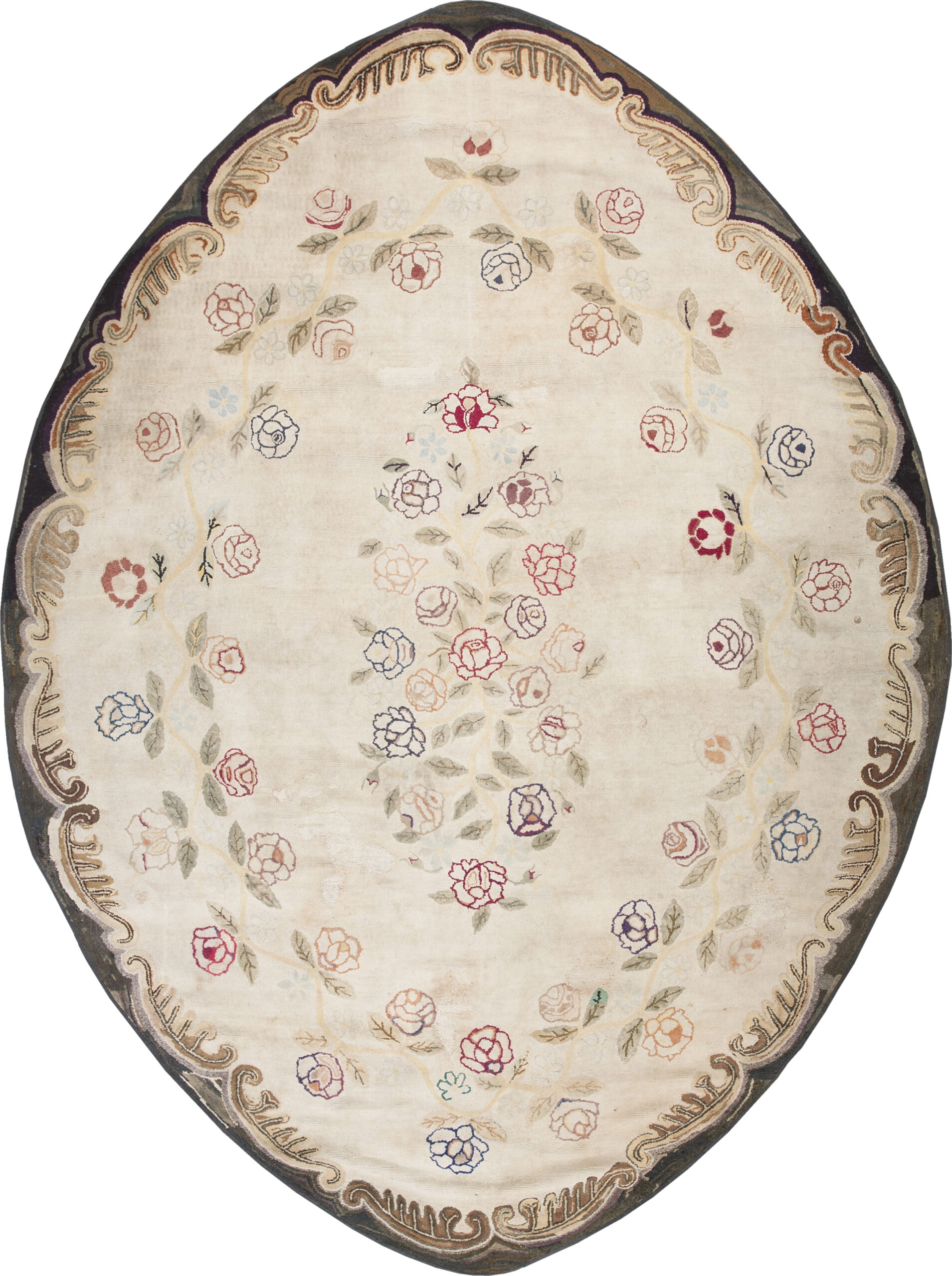 The field presents a luminous foundation of ivory, beige, cream, providing a perfect canvas for the scattered rose bouquets. The palette is intentionally soft and inviting, allowing the subtle variations in the wool’s natural dyes to create depth. The elongated oval shape, highly unusual for the time, suggests a custom commission designed to anchor a specific parlor or drawing room.