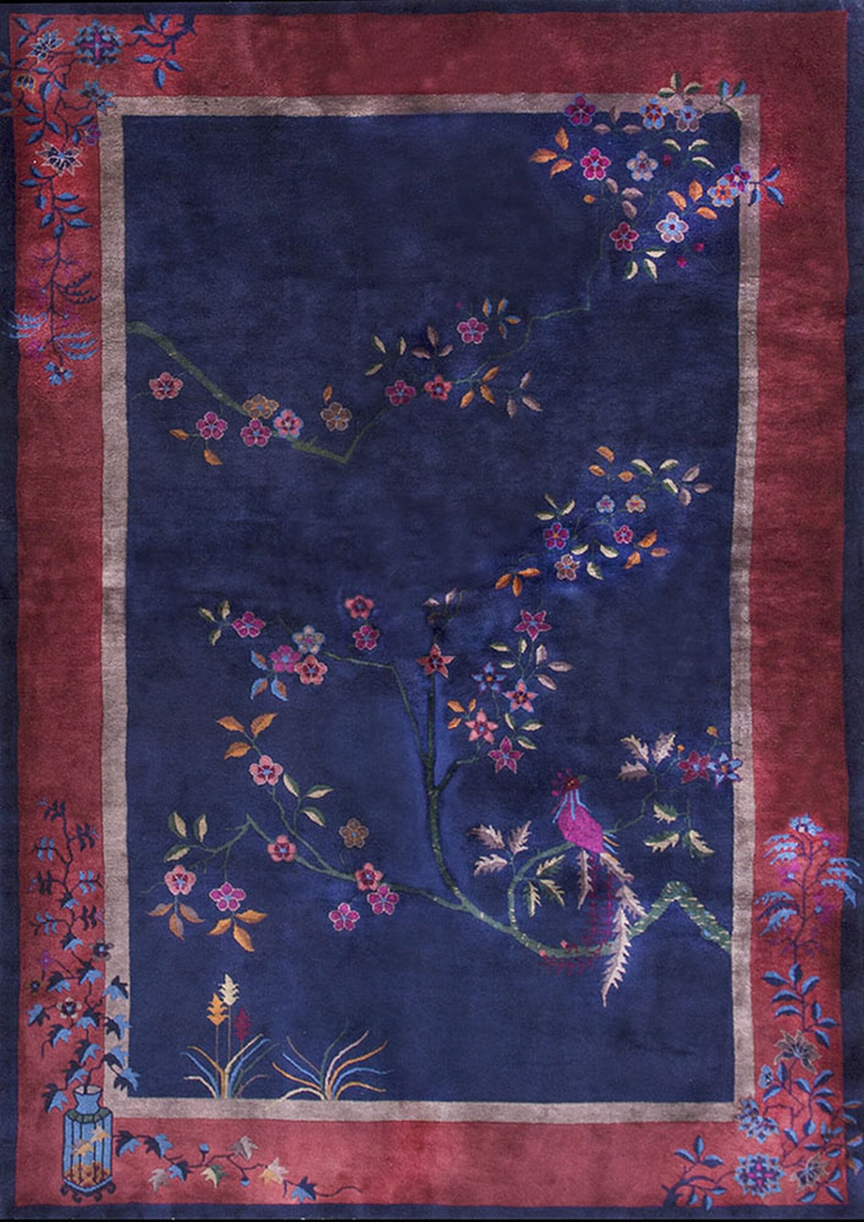A stylized bird, likely a phoenix, perches gracefully on a flowering branch, rendered with meticulous detail and a luxurious, high pile. The superb condition and clarity of design confirm its status as a fine example among high-quality antique rugs of the Art Deco era.