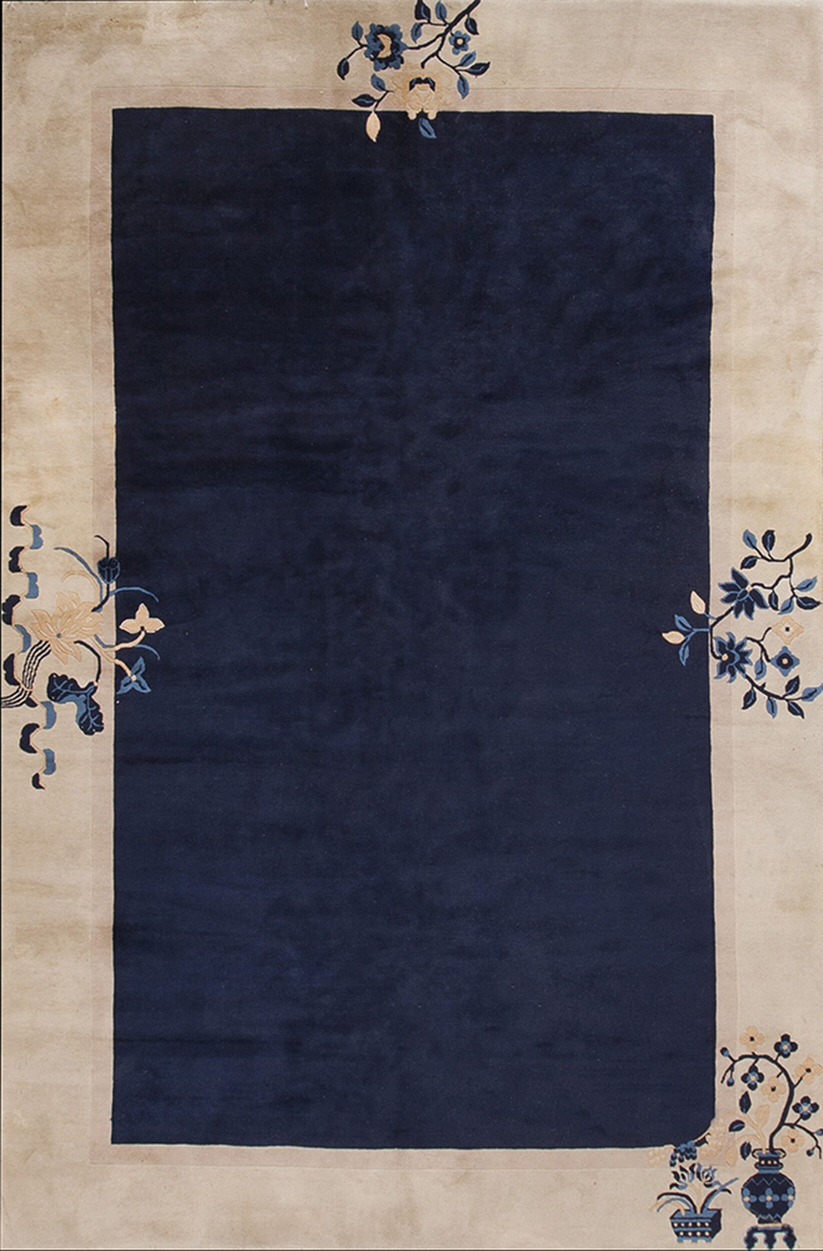 The central field is dominated by an intensely saturated, near-midnight indigo, providing a dramatic backdrop for the delicate border. This use of a deep, solid hue highlights the artistry inherent in blue color rugs of this era, allowing the texture of the hand-knotted wool pile to speak for itself.