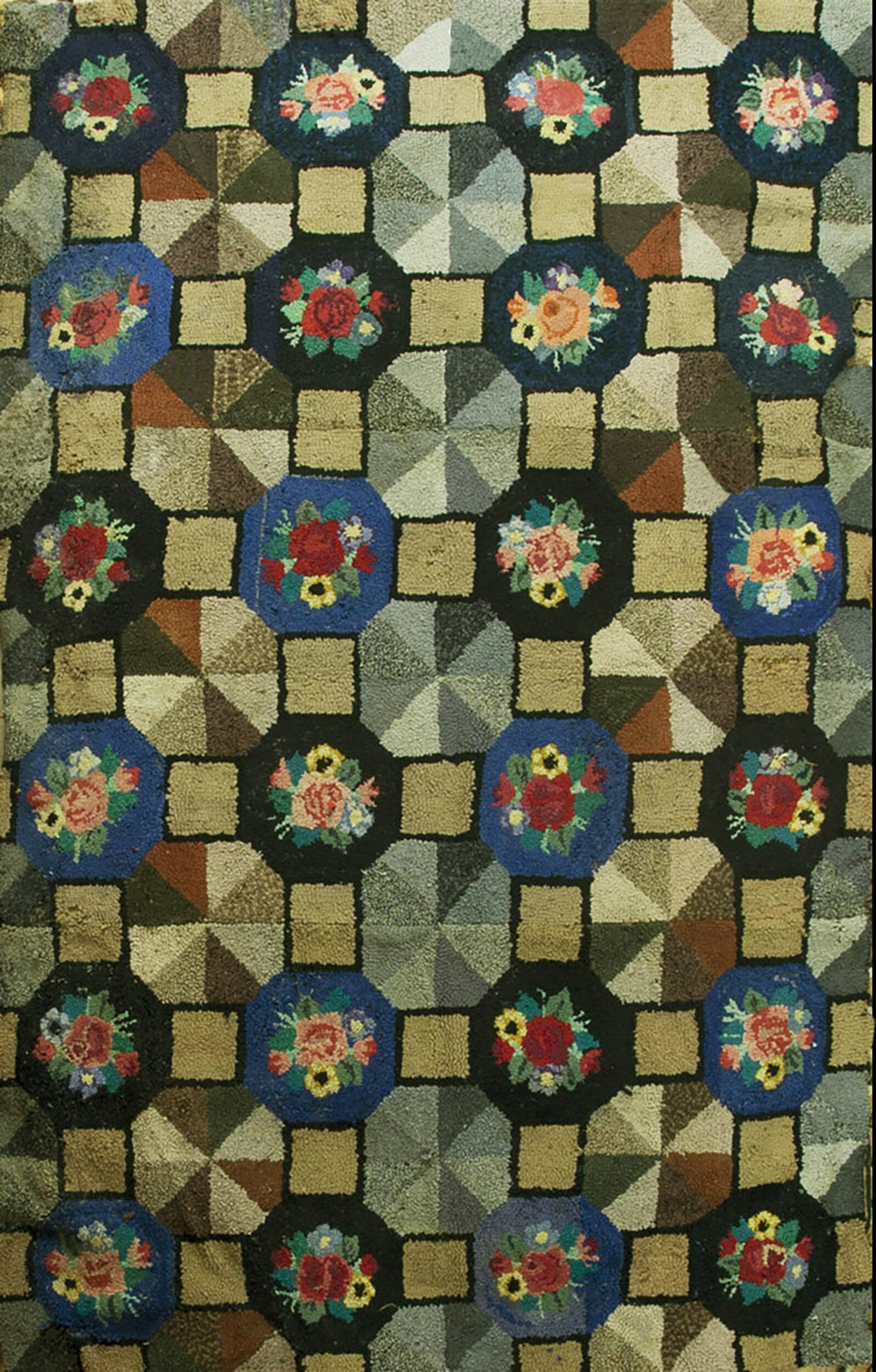Antique Folk Art American Grid Pattern Hooked Area Rug