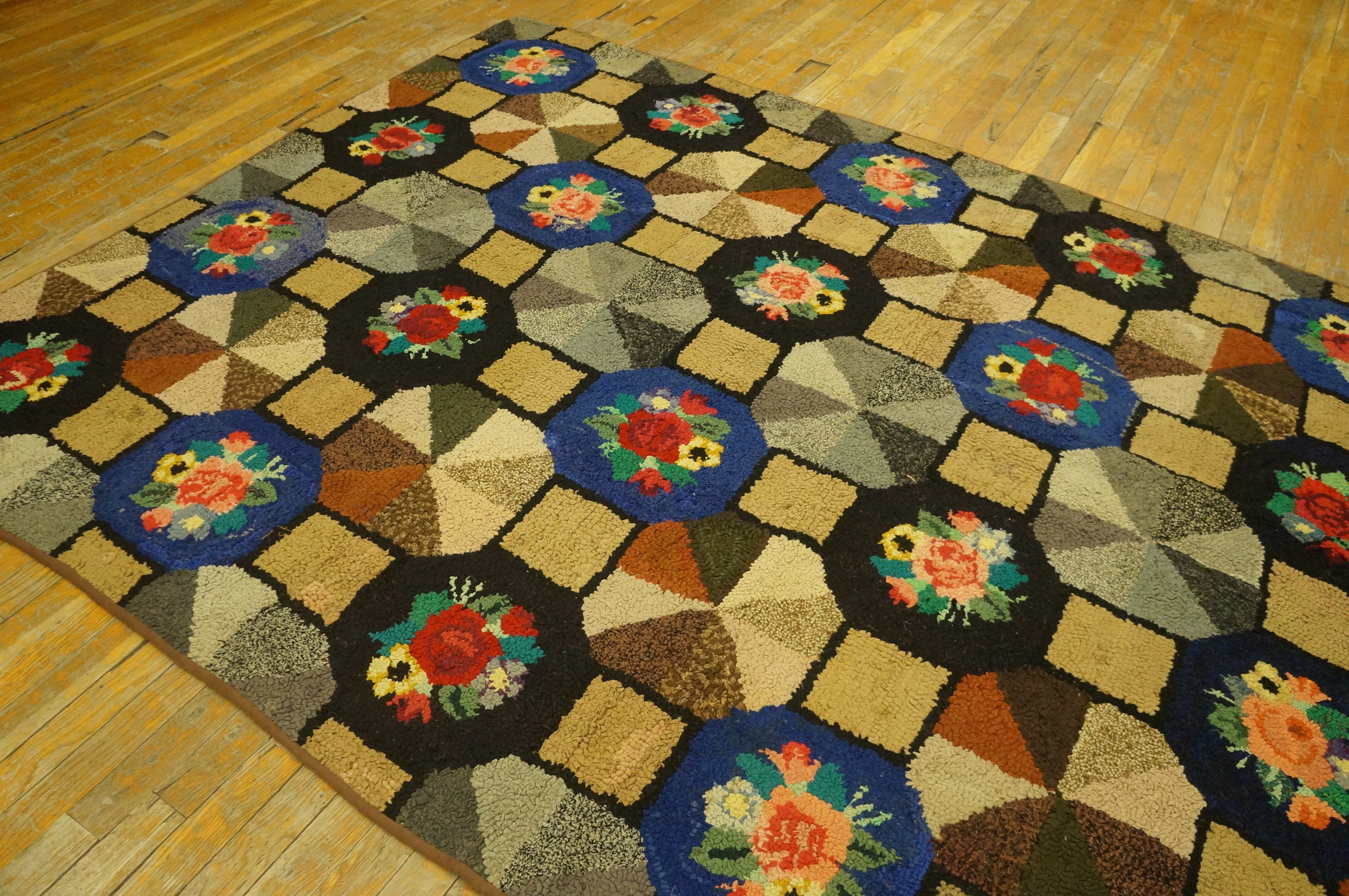 Antique American Hooked Allover Floral Wool Multicolor Jewel Tones 1920s Rug, Circa Date: 1920s. This exceptional example of an American hooked rug captures the vibrant, homespun aesthetic popular during the early 20th century, showcasing a charming blend of folk art sensibility and sophisticated design structure.