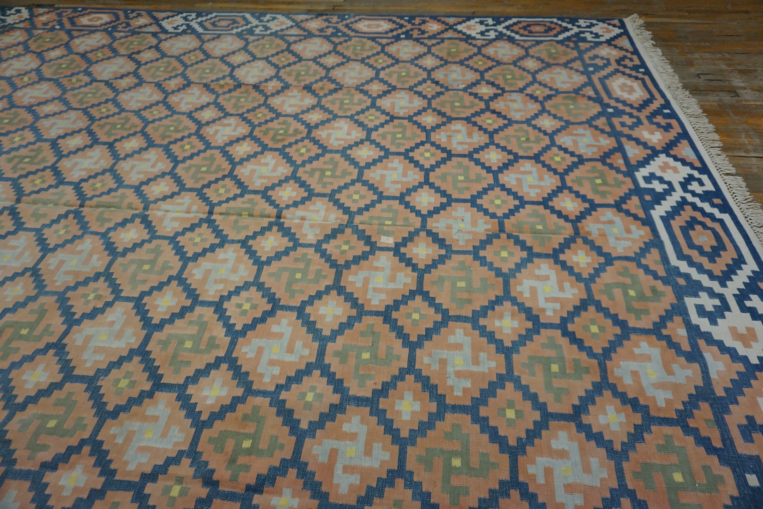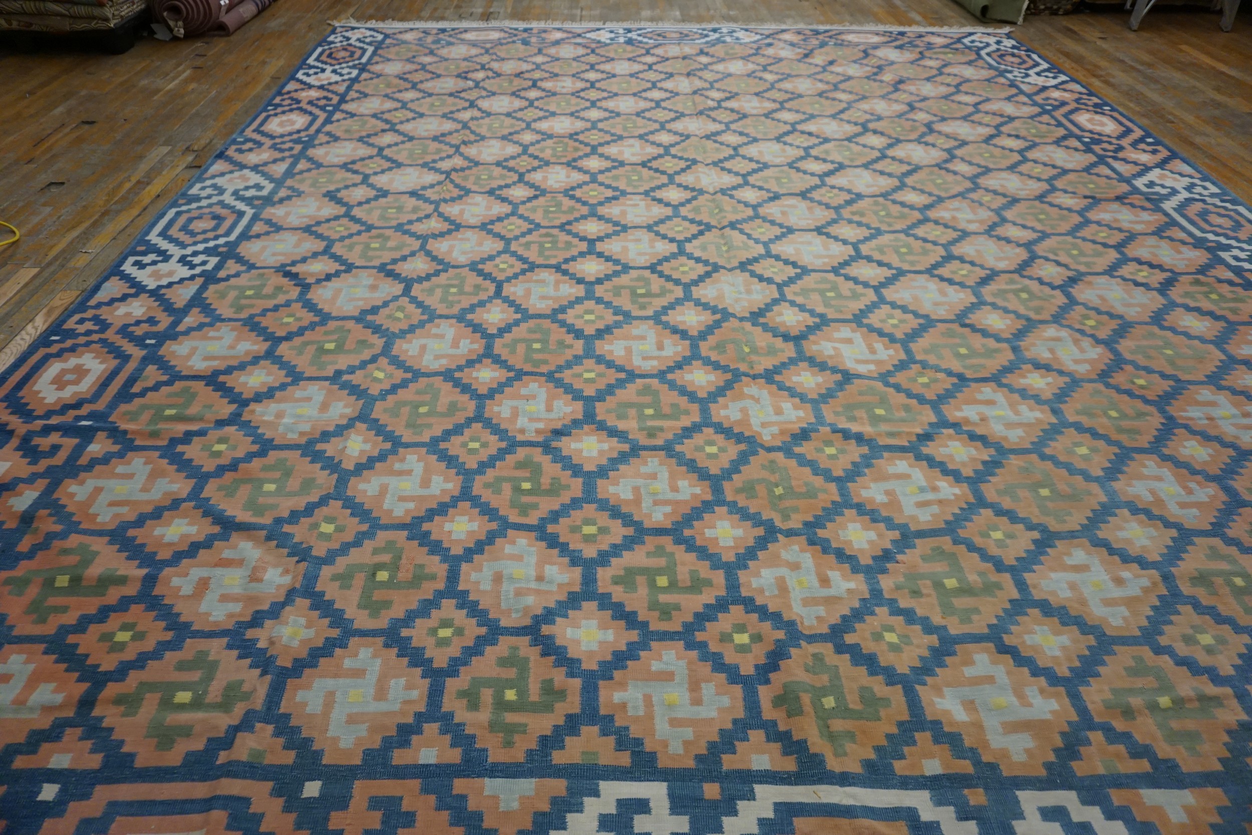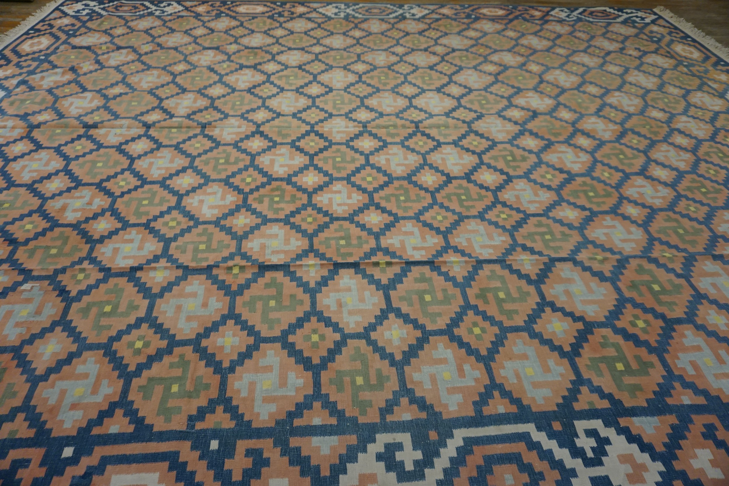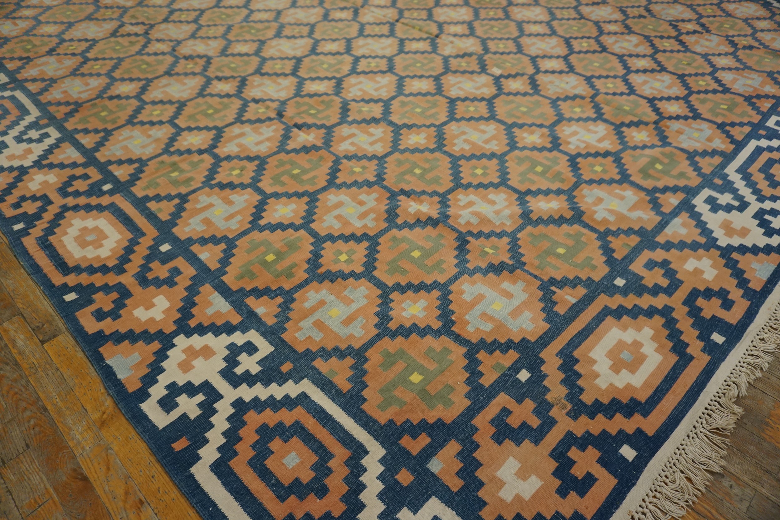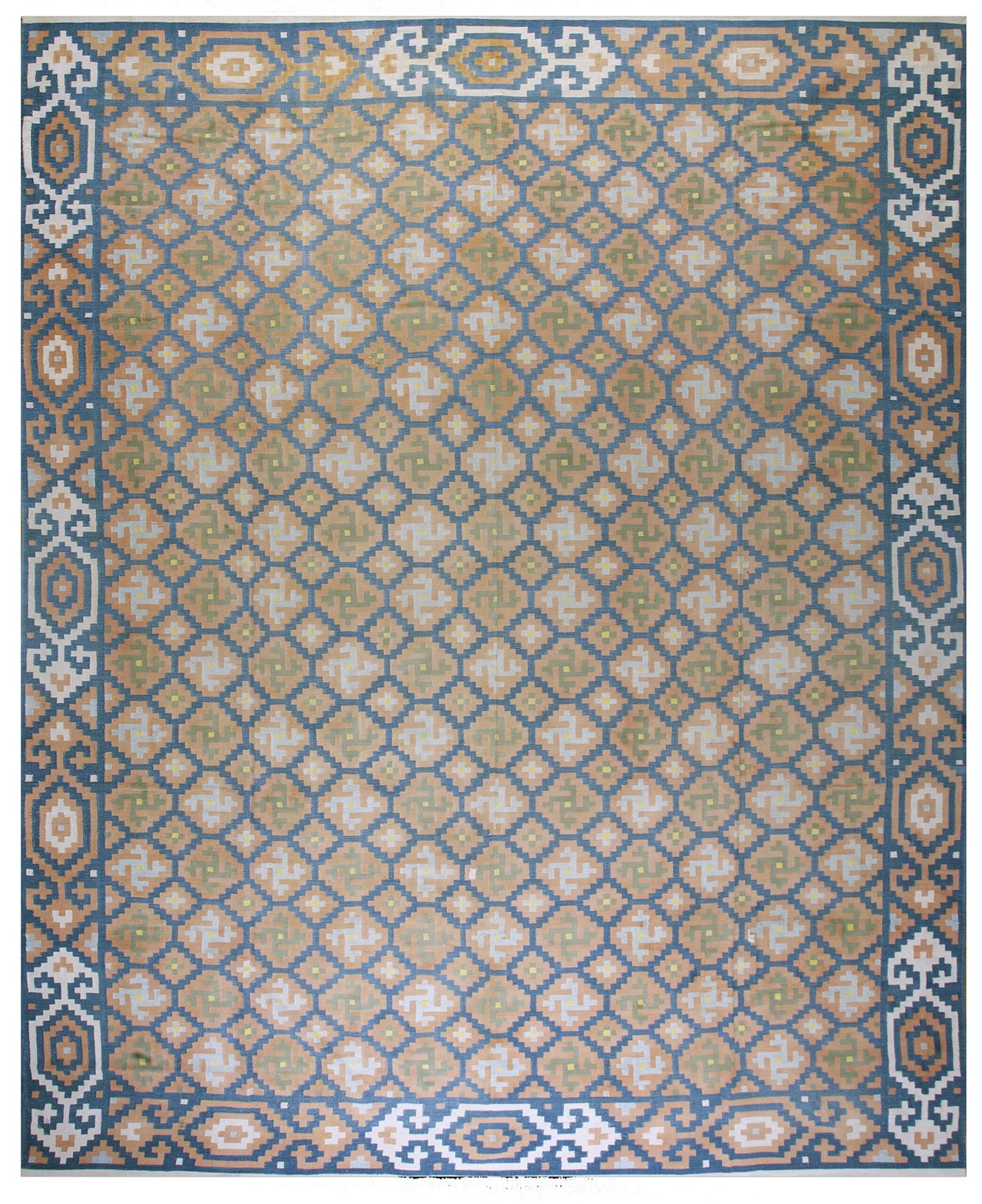 Antique Large Cotton Blue Flat Weave Rug, Circa Date: 1935. This exceptional textile represents a superb example of early 20th-century weaving, utilizing a durable cotton foundation and a tightly executed flat weave structure. Its age, condition, and sophisticated design qualify it among our finest antique rugs.