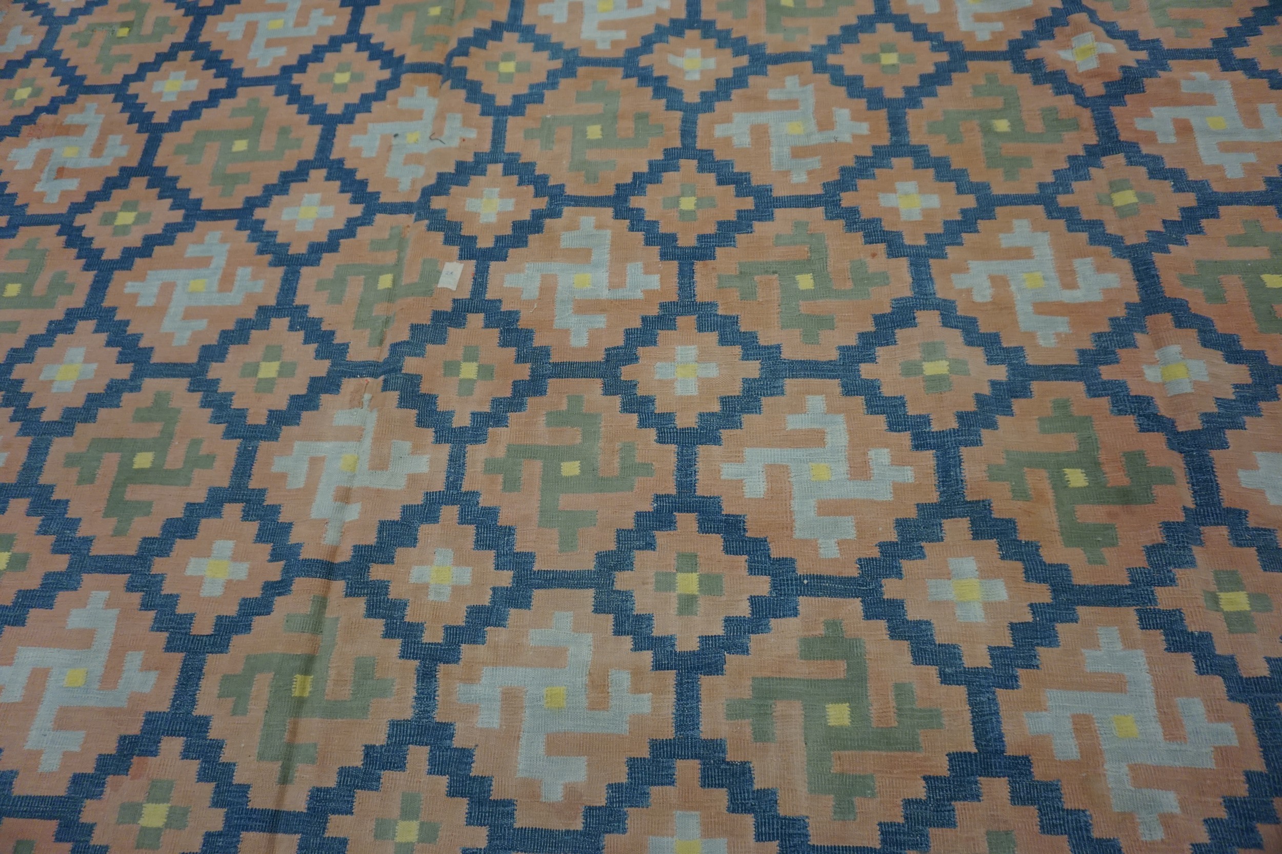 Woven to an impressive scale, this textile is categorized as a large oversized big rug, making it ideal for defining expansive living areas or grand dining rooms. The flat weave construction offers exceptional durability and a low profile, allowing this historic piece to integrate seamlessly into contemporary interiors requiring both texture and sophisticated color.