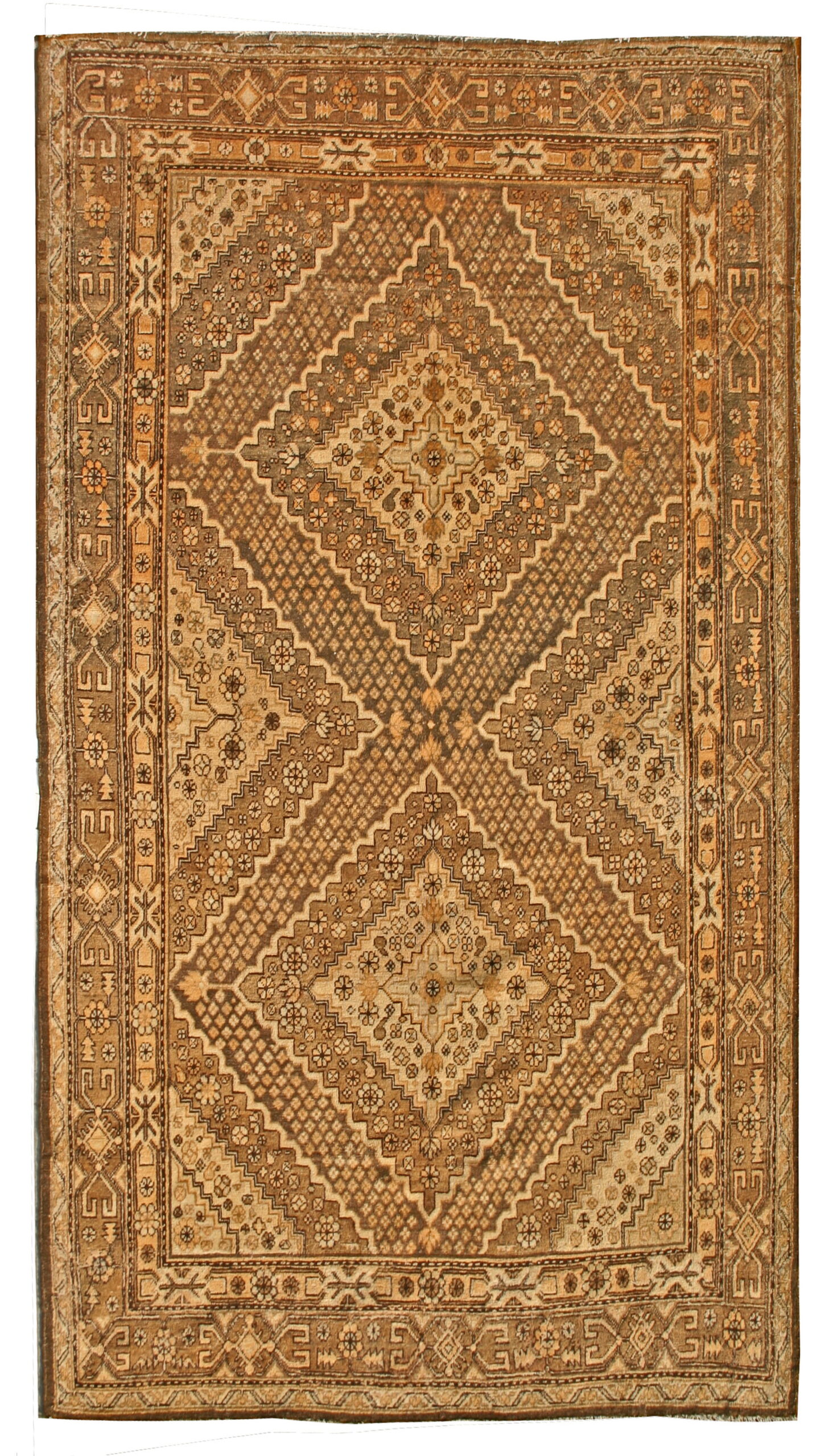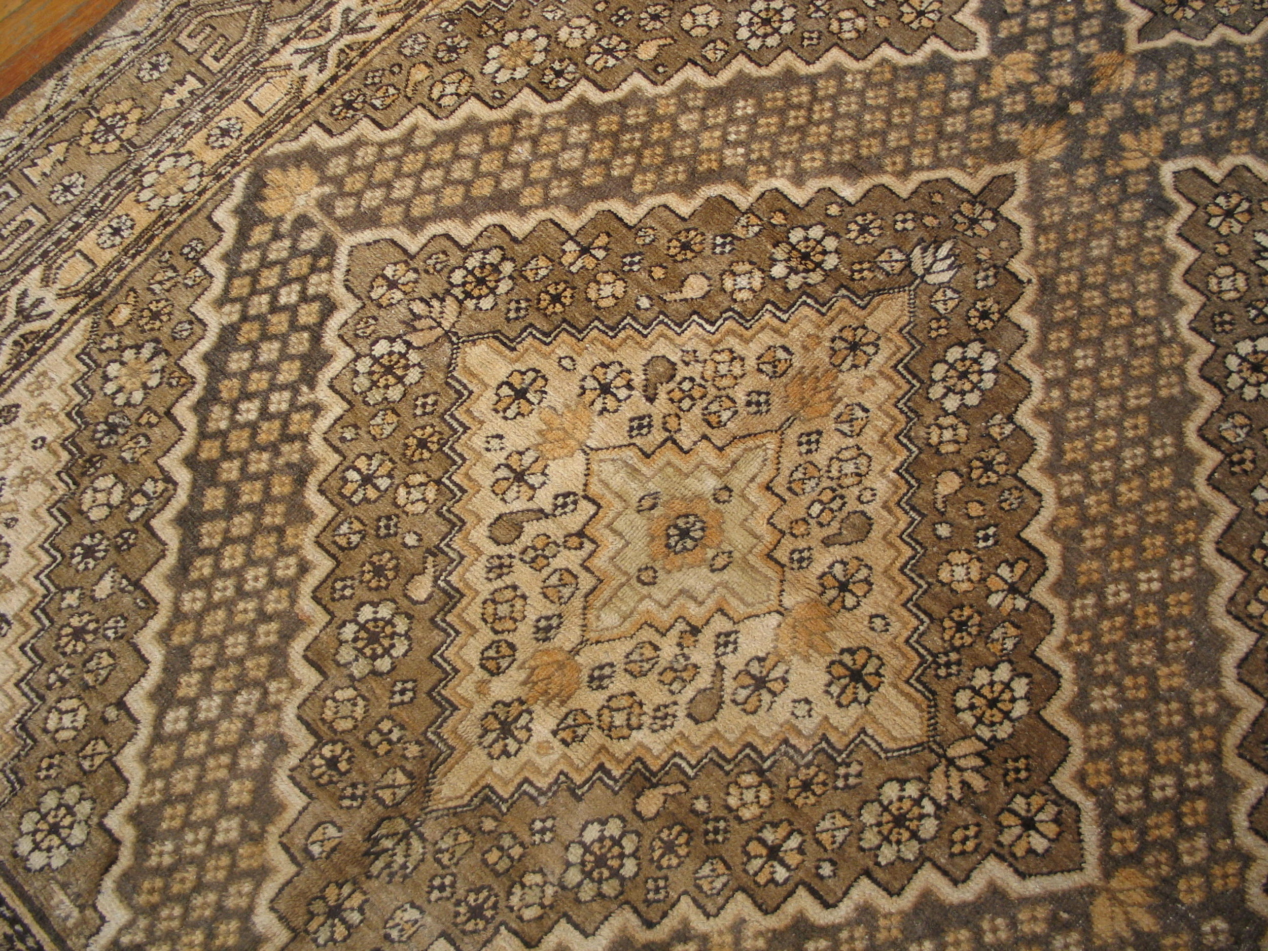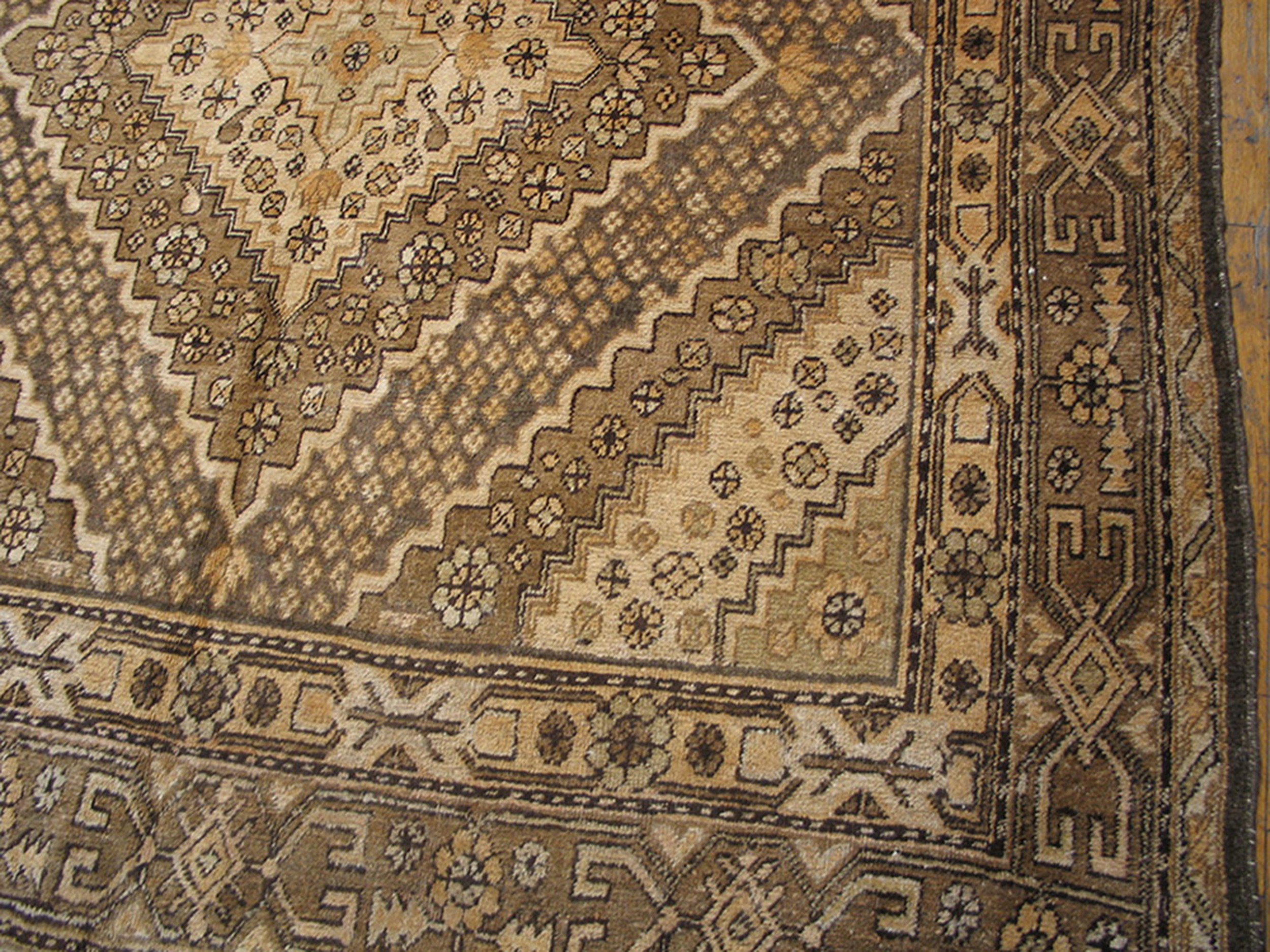 The field utilizes a complex geometric lattice structure, creating a dynamic allover design that avoids a central medallion, characteristic of many regional pieces from this era. The coloration is particularly noteworthy; while labeled “gray,” the wool exhibits subtle shifts between taupe, warm beige, and deeper charcoal tones, providing remarkable depth and versatility.