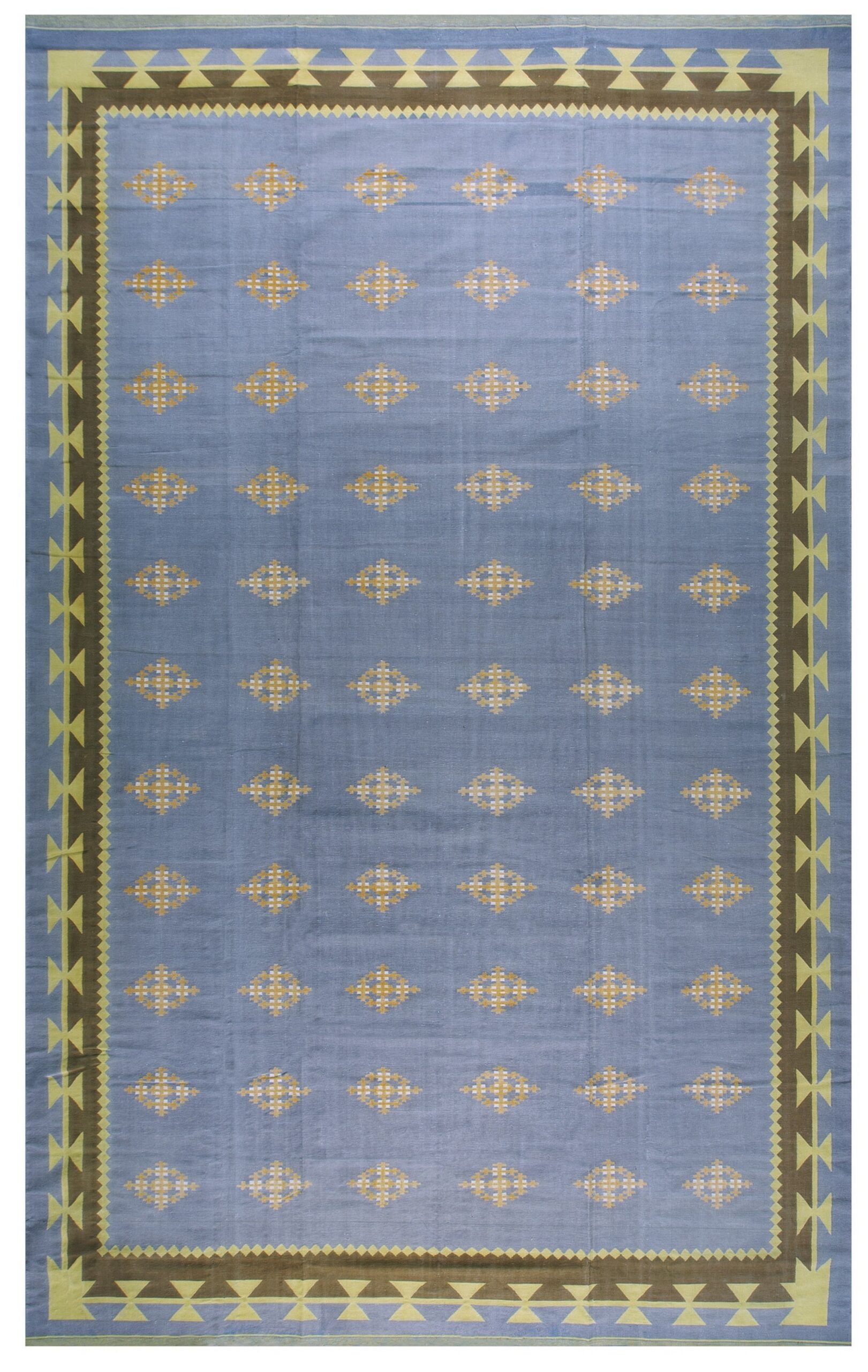 The expansive field is rendered in a sophisticated, muted blue-grey, establishing a calming foundation for the entire composition. This subtle hue places it among our finest examples of blue color rugs. The surface is punctuated by repeating, stylized diamond motifs, executed in contrasting yellow-gold and white, creating an organized, grid-like rhythm across the expanse. The overall design is a striking example of a geometric rug, emphasizing structure and symmetry over fluid ornamentation.