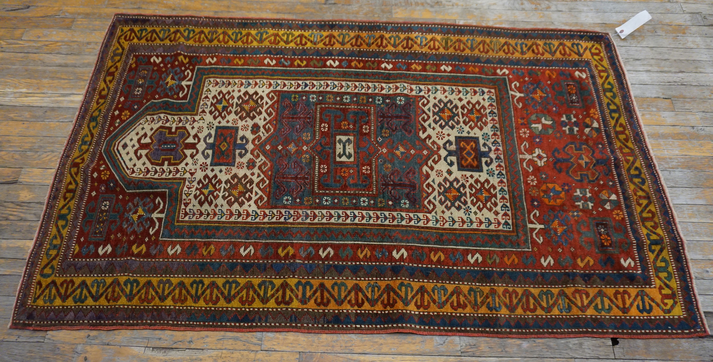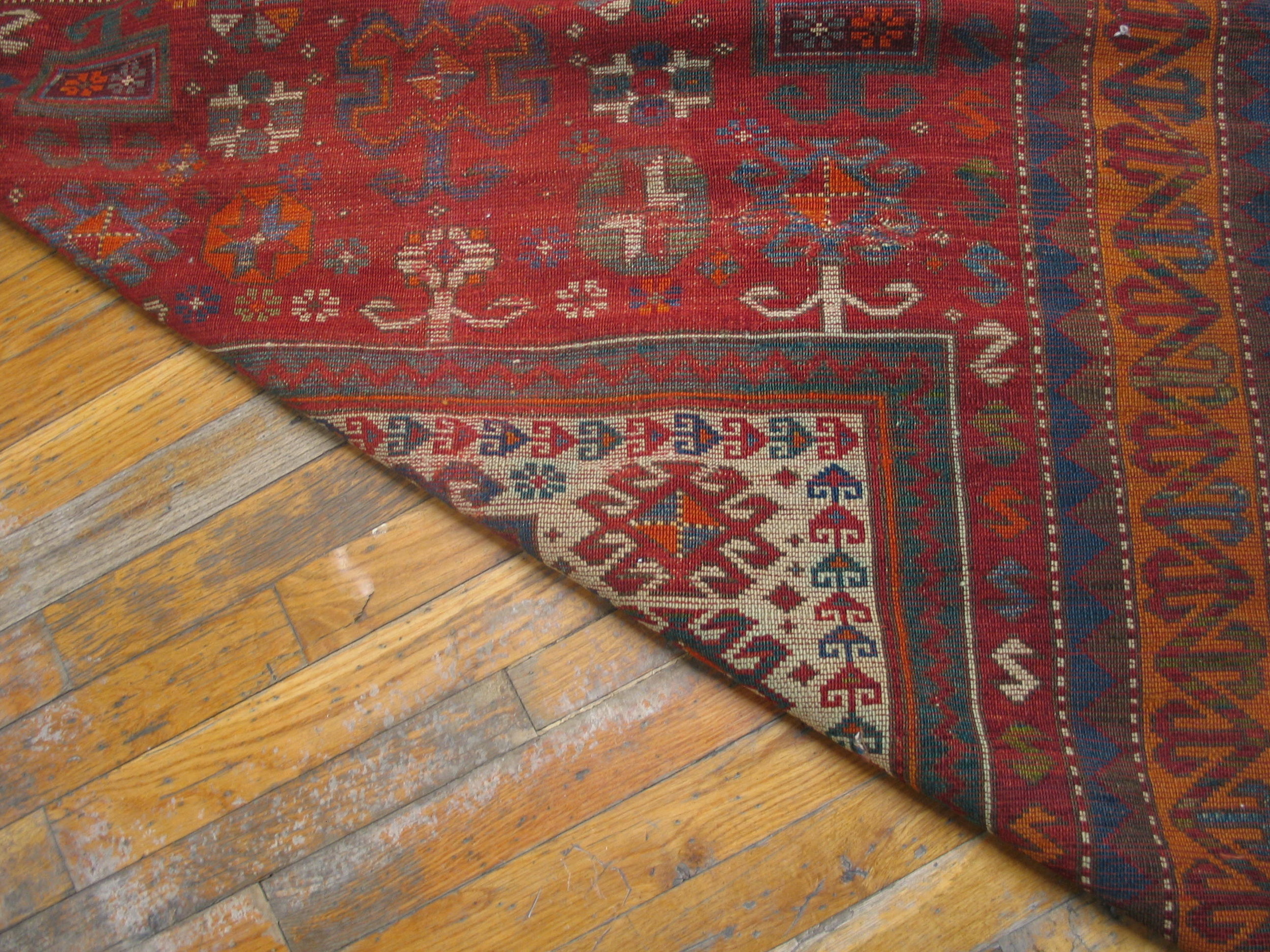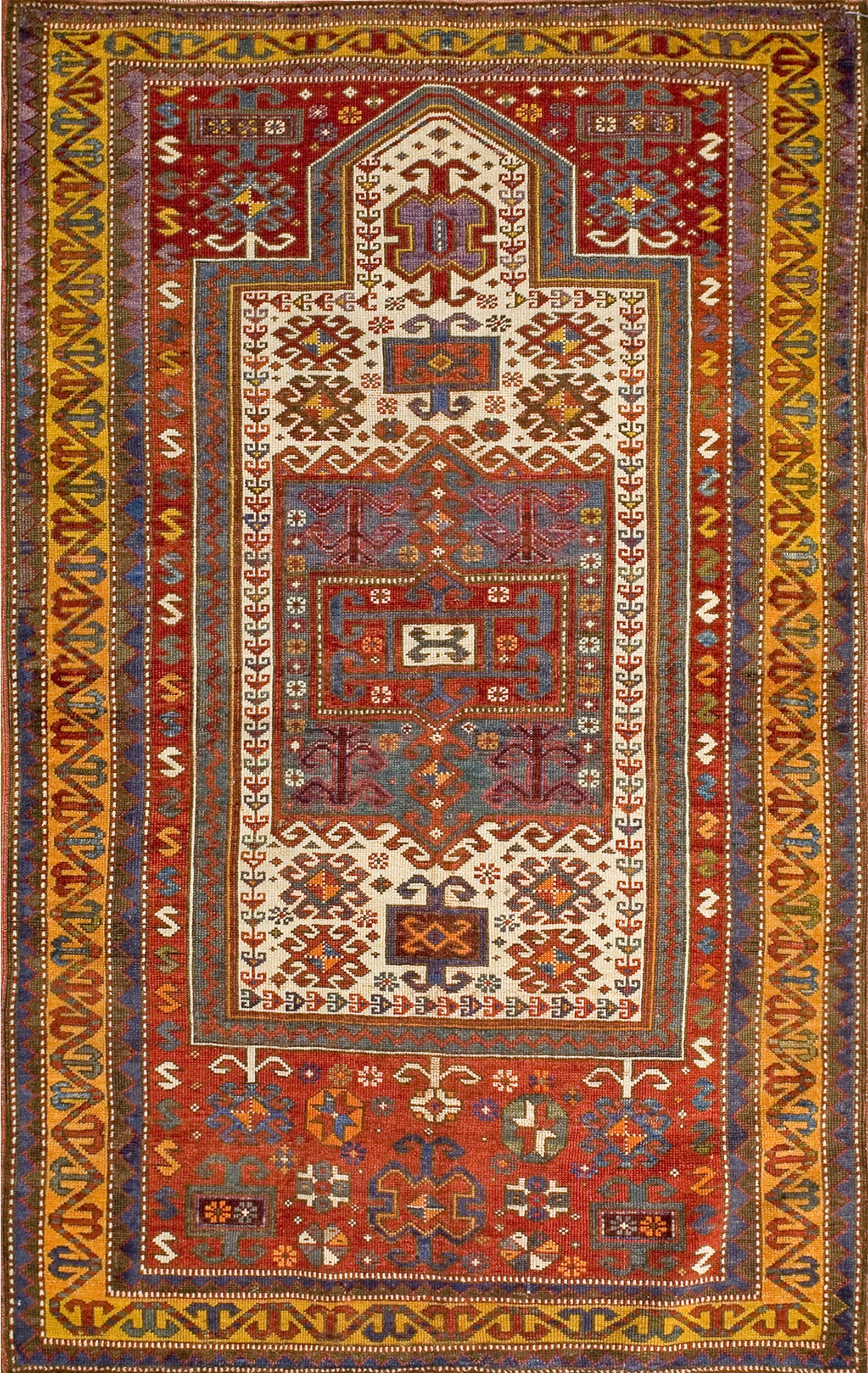 Characteristic of the period, the composition relies heavily on angular, highly stylized forms. The robust structure and dense pile confirm its status as a durable, hand-knotted textile designed for longevity. Every element, from the stepped central figure to the intricate guard borders, adheres to the strict conventions of geometric rugs, creating a dynamic yet balanced visual field.