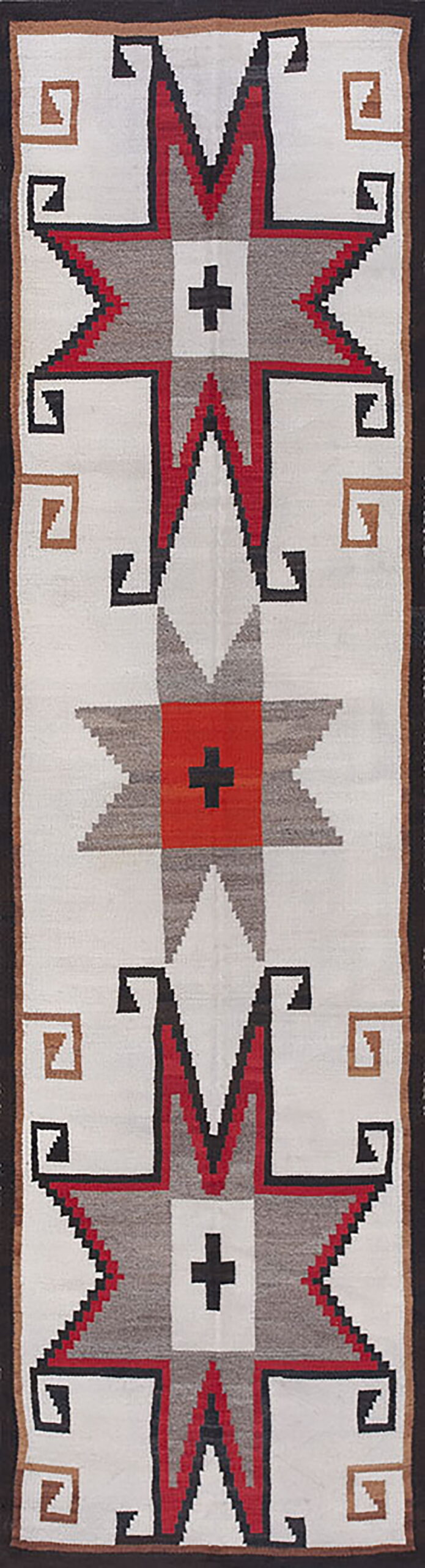 The design is dominated by large, repeating stepped medallions anchored by central crosses, a hallmark of powerful Southwestern textile traditions. The use of sharp zig-zags and interlocking forms demonstrates a sophisticated understanding of symmetry and movement, placing this piece firmly within the tradition of exceptional geometric rugs.
