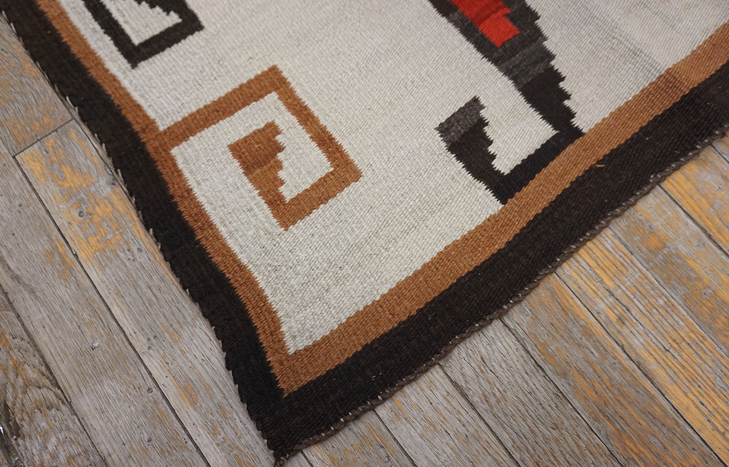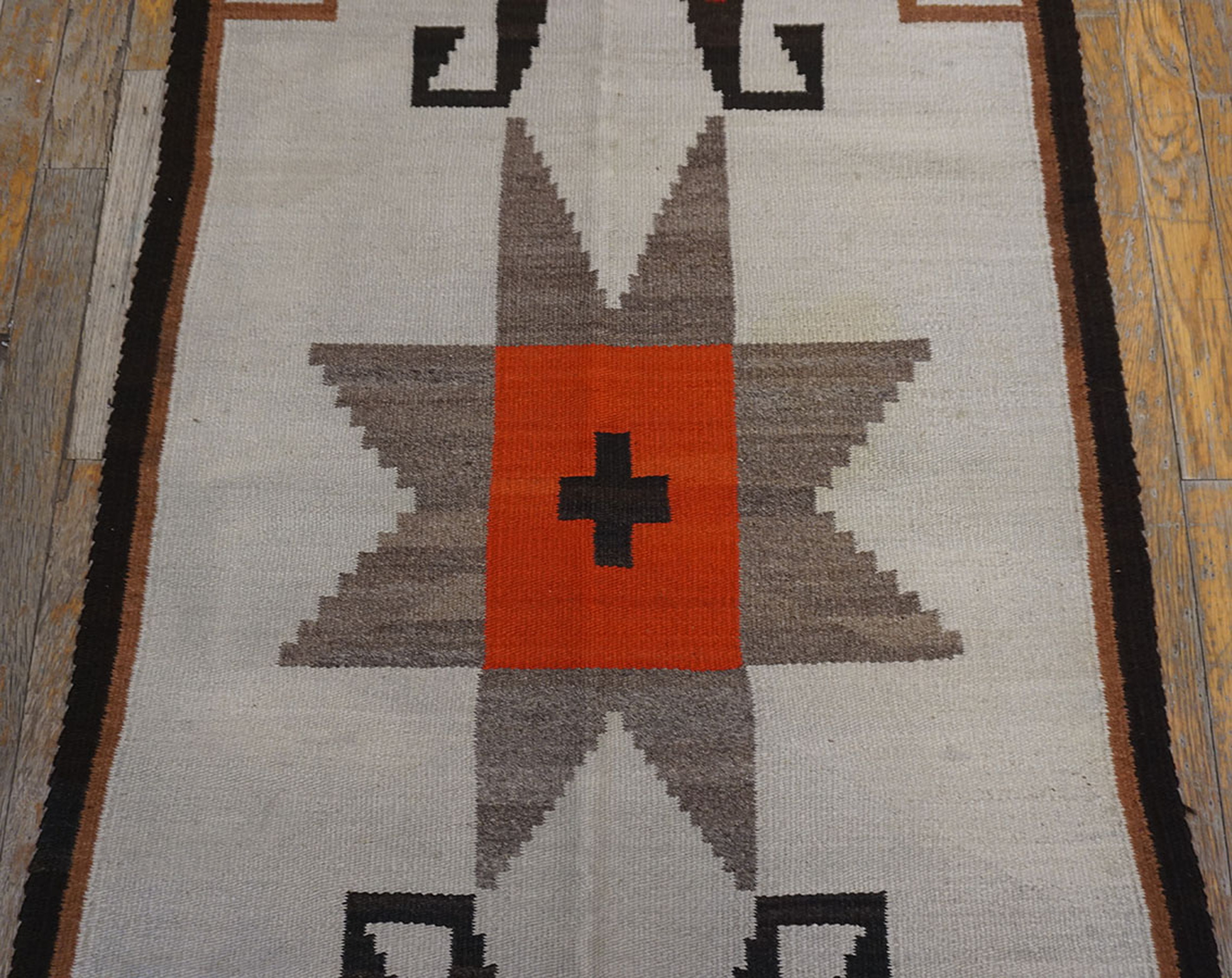 Antique Geometric Medallion Wool Flat Weave Ivory Beige Cream White 1930s Rug, Circa Date: 1930s. This striking textile is a superb example of early 20th-century Native American flat weaving, characterized by its bold, graphic composition and exceptional clarity. The tight, durable structure emphasizes the purity of the design, making it a highly desirable piece among antique rugs collectors seeking authenticity and visual impact.