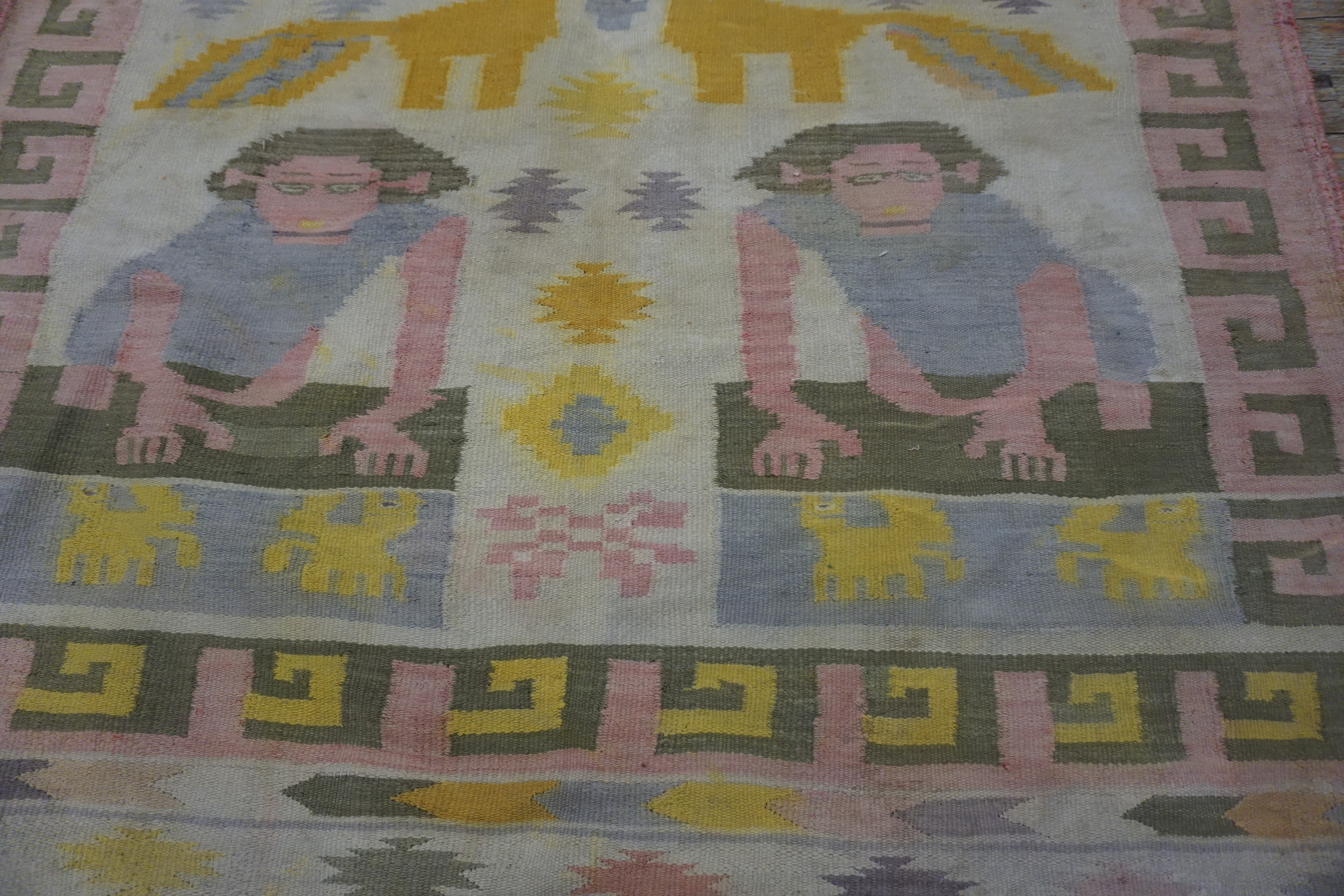 Woven entirely in cotton, the texture is soft and pliable, allowing the muted palette to shine through the decades of gentle use. The primary ground is a gentle, faded ivory tone, providing a neutral canvas for the highly saturated, yet soft, accents of ochre, lavender, and dusty rose used in the figural elements.