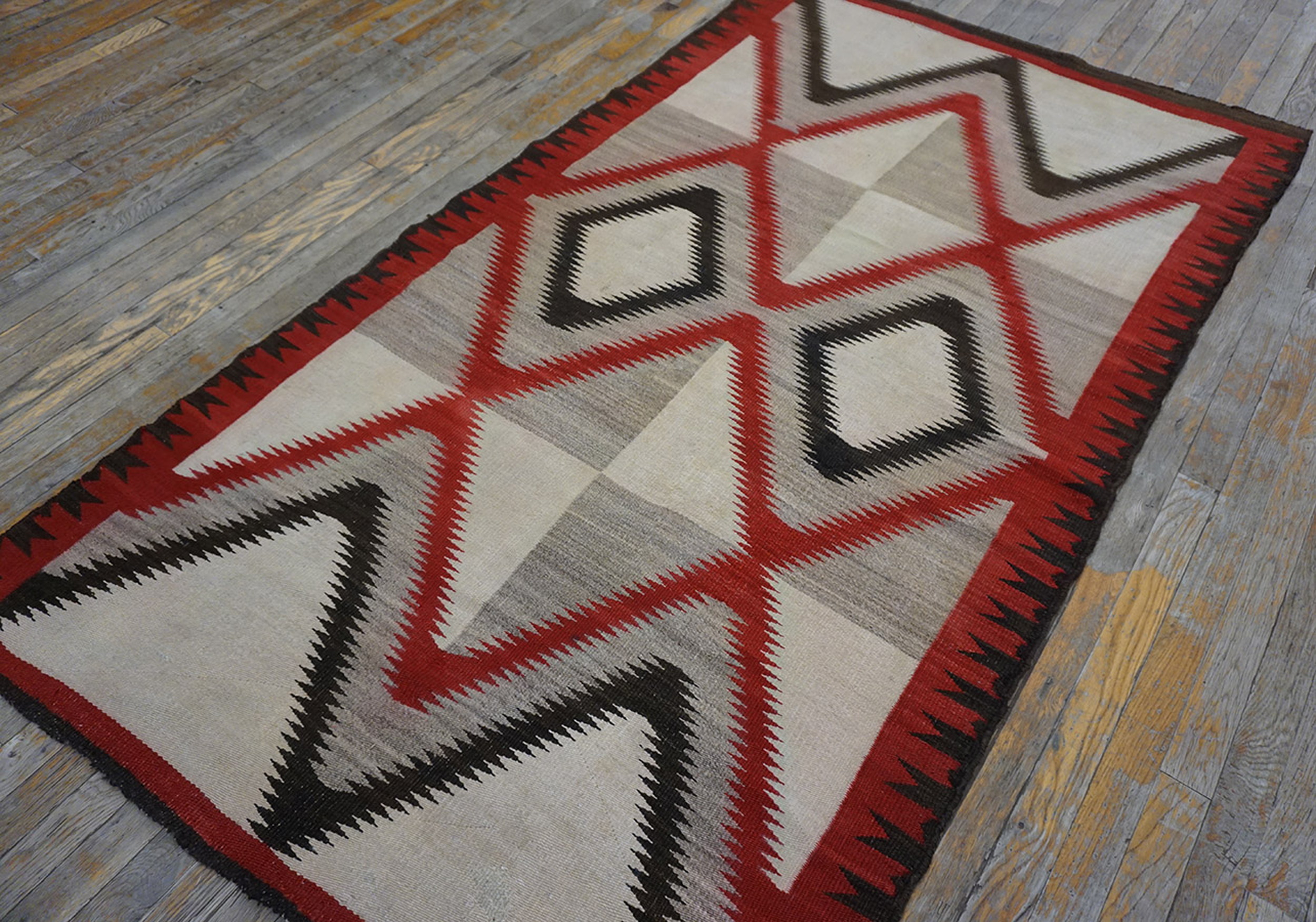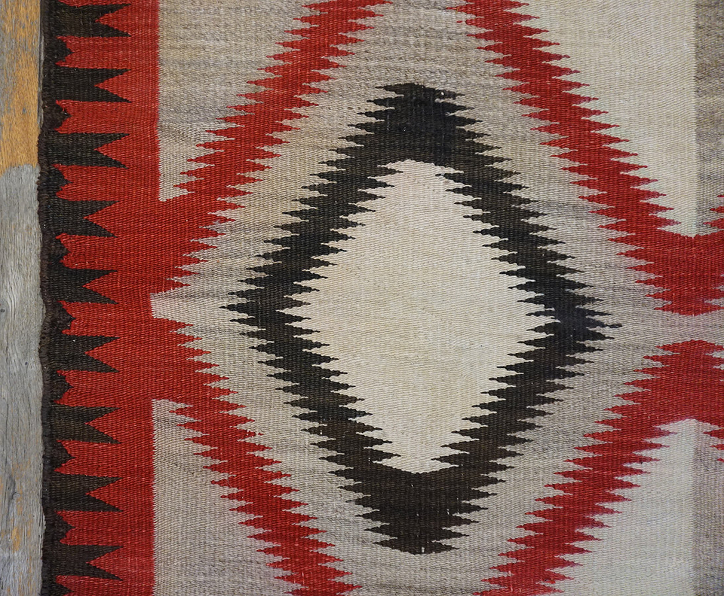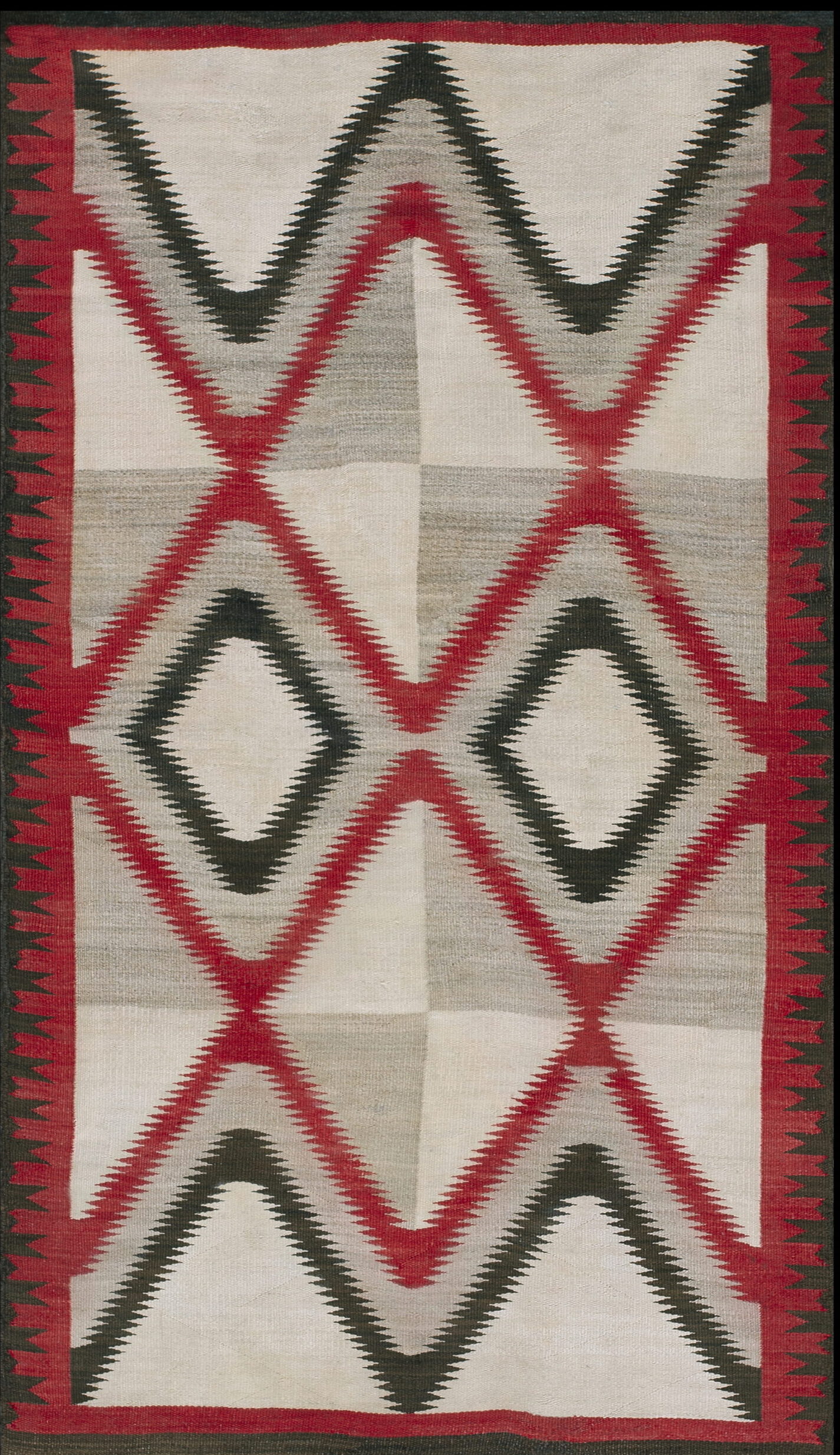 The palette is dominated by a luminous field, typical of ivory color rugs, providing a sharp, clean ground against which the dramatic serrated diamonds are set. The use of deep cochineal red and black creates a dynamic visual tension, reflecting the transitional period designs that emerged in the Southwest during this decade, moving toward increasingly refined, graphic compositions.