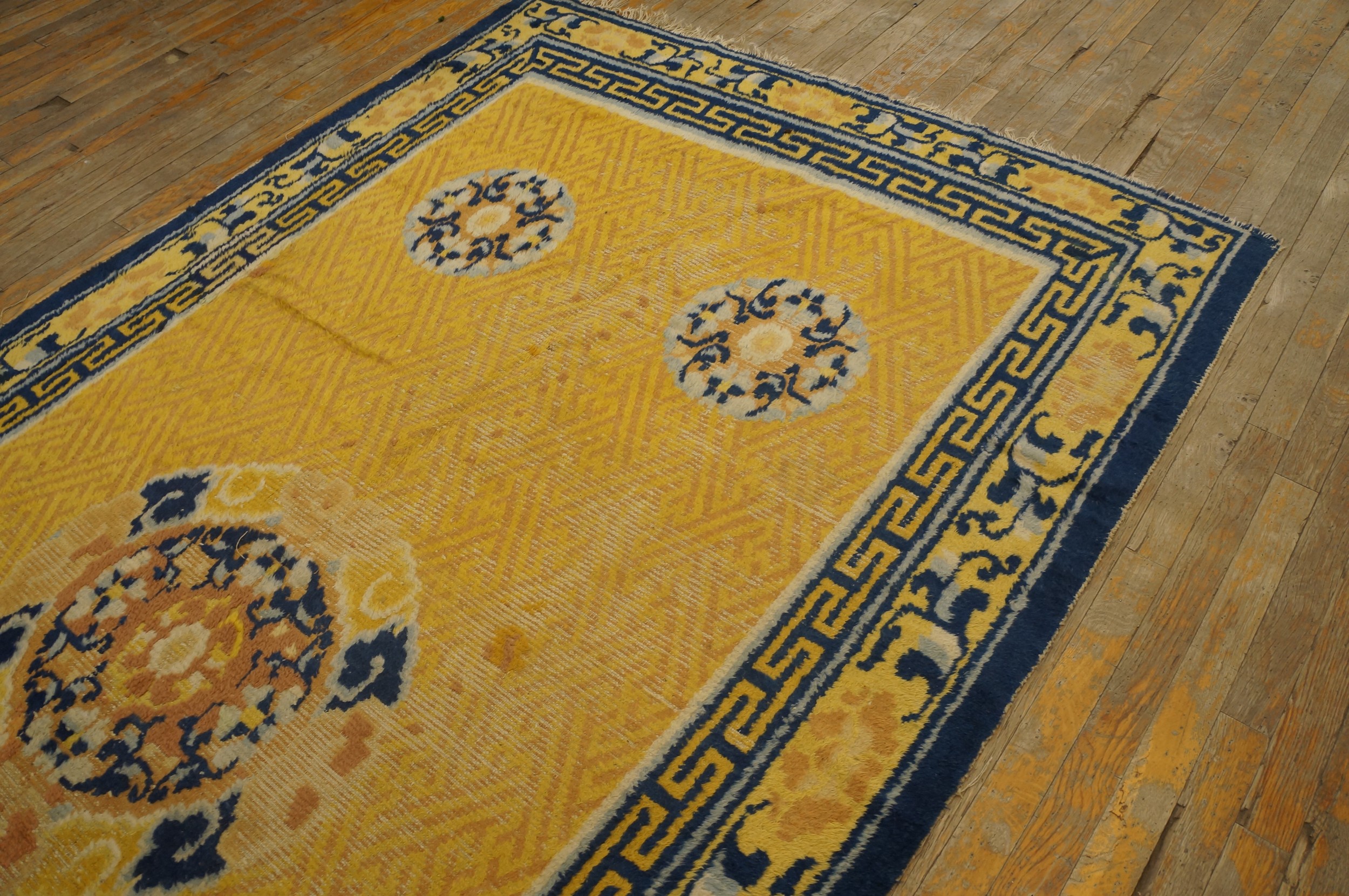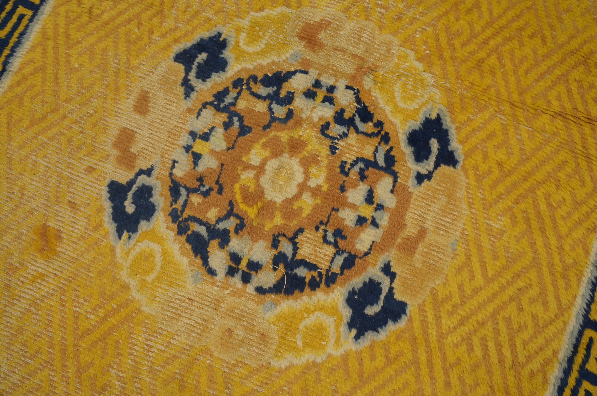 The five circular medallions feature complex, layered designs executed primarily in deep indigo and soft tan, offering a powerful visual counterpoint to the golden ground. The primary border utilizes the classic Greek Key motif, rendered in crisp navy blue, which frames the central design with architectural precision, balanced by an outer guard band of stylized scrolling vines.