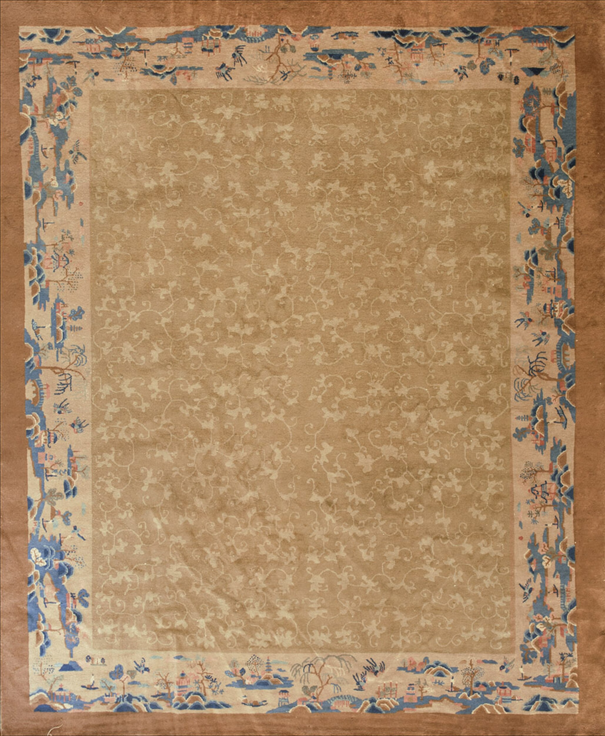 Contrasting beautifully with the monochromatic field, the wide border features traditional Chinese landscape elements—pagodas, mountains, and stylized clouds—rendered in striking shades of soft blue and terracotta. Such finely preserved antique rugs offer a tangible connection to the artistic traditions of the past, serving as exceptional examples of textile artistry.