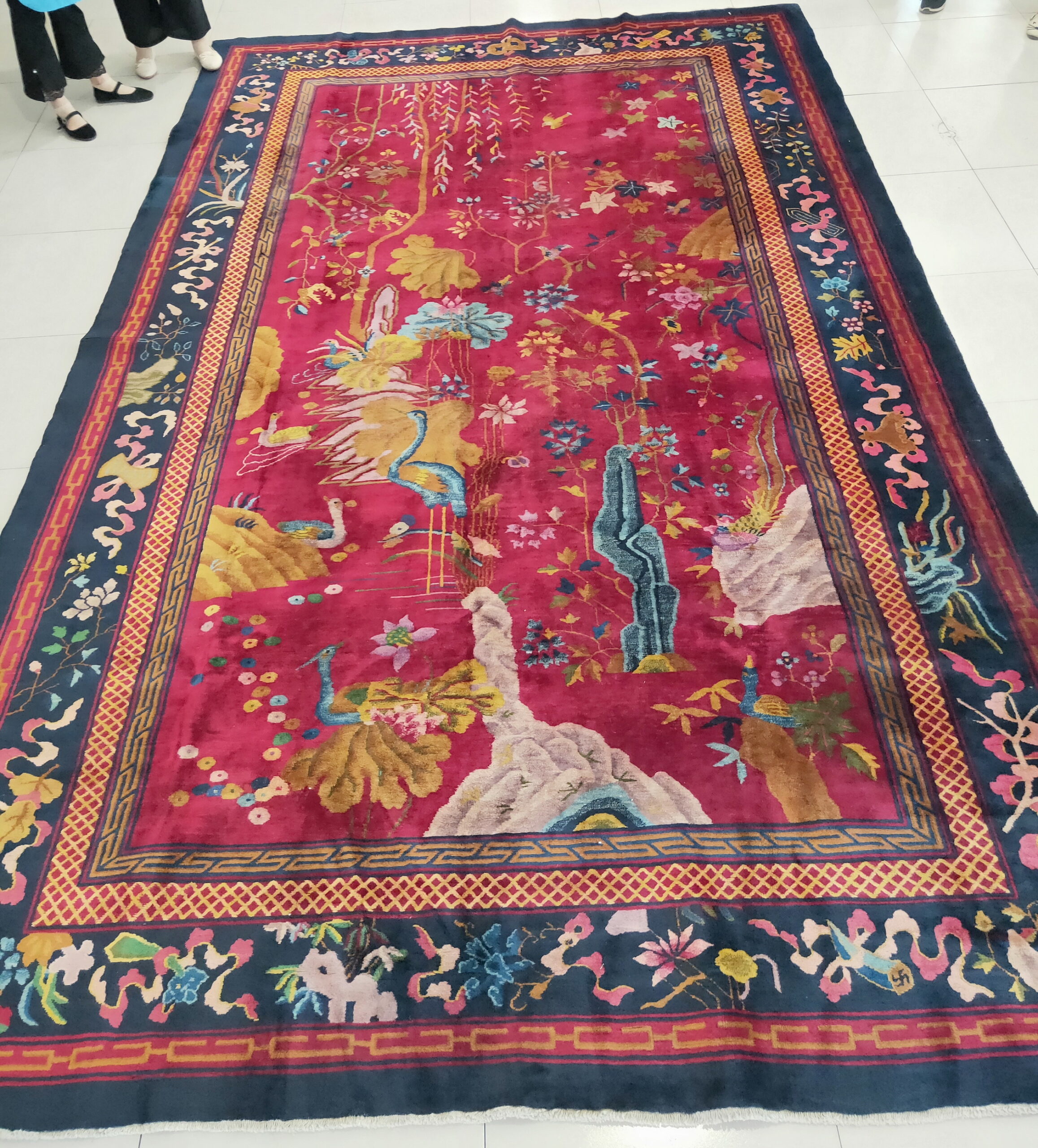 Hand-knotted from luxurious wool pile, the texture retains the soft, velvety sheen characteristic of high-quality Chinese production from the period. Its generous proportions classify it as a true room size piece, capable of anchoring a grand living space or formal dining area with historical gravitas.