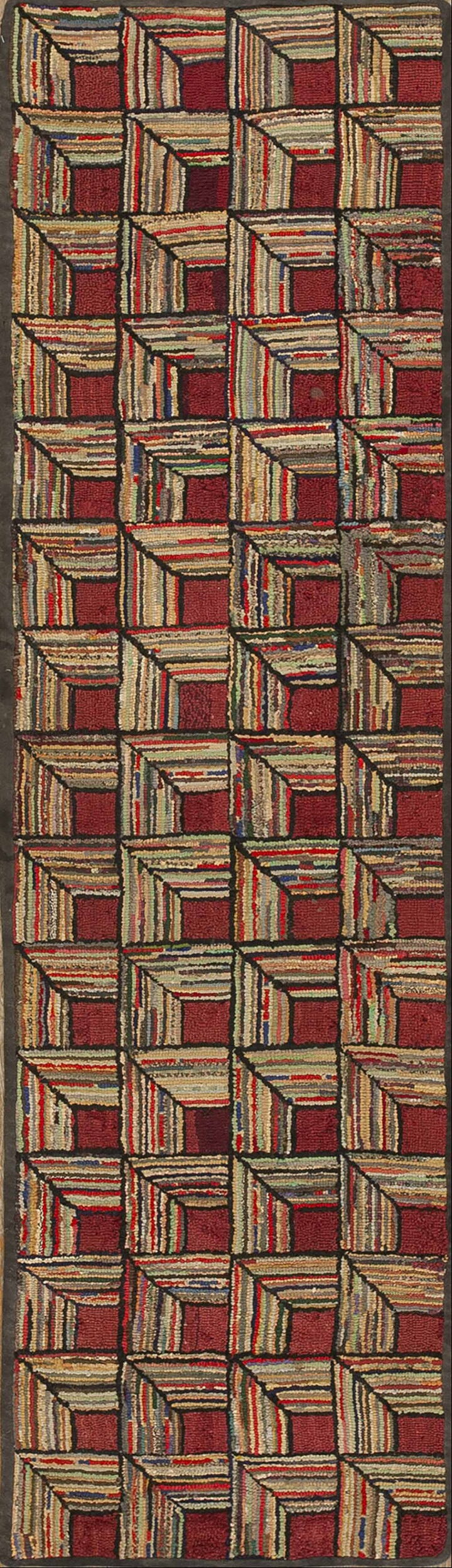 The design employs a striking, repeating geometric motif, reminiscent of the “Log Cabin” quilting style, which achieves a compelling three-dimensional optical effect. This strong, rhythmic pattern is presented as an allover rugs design, where the visual energy is distributed evenly across the entire field without reliance on a central medallion.