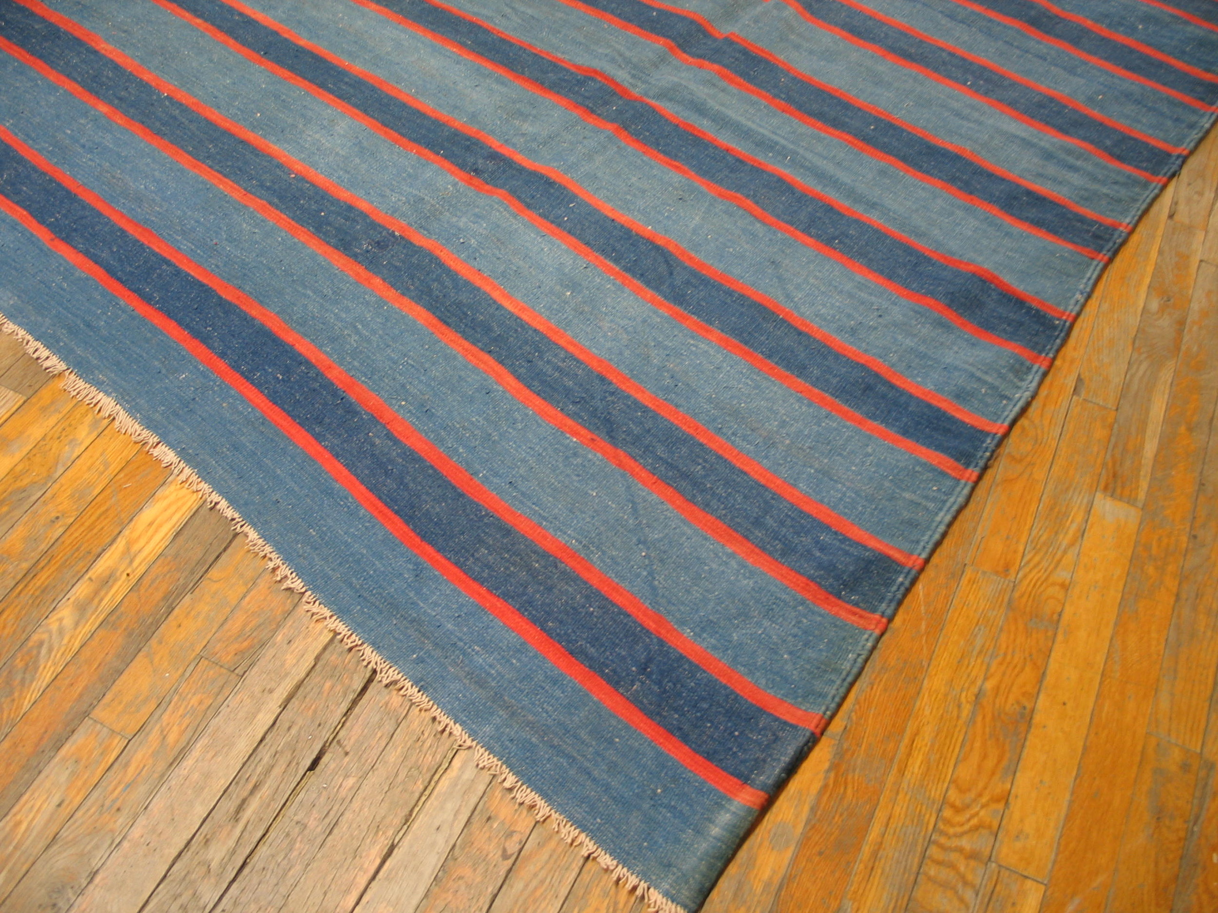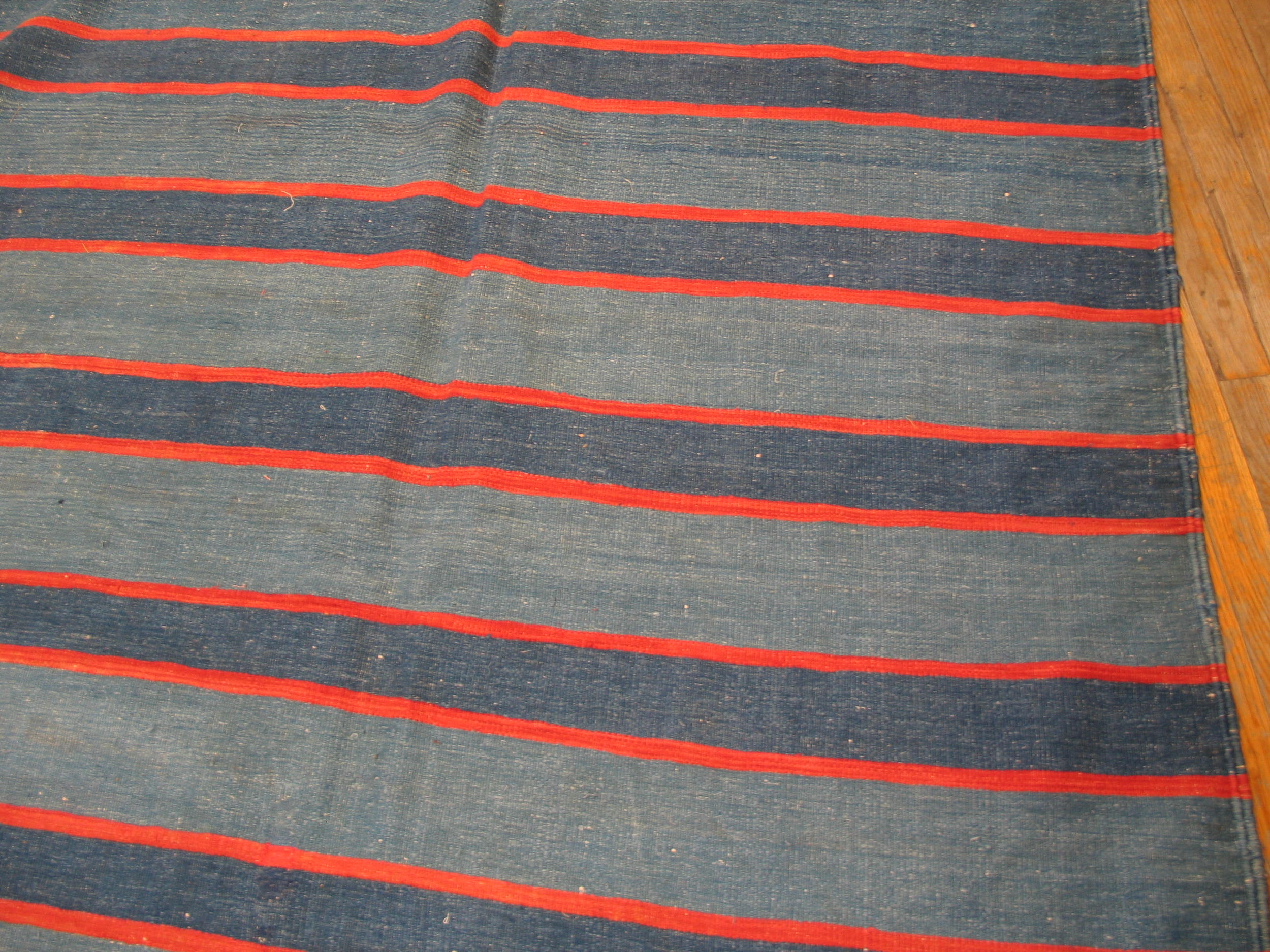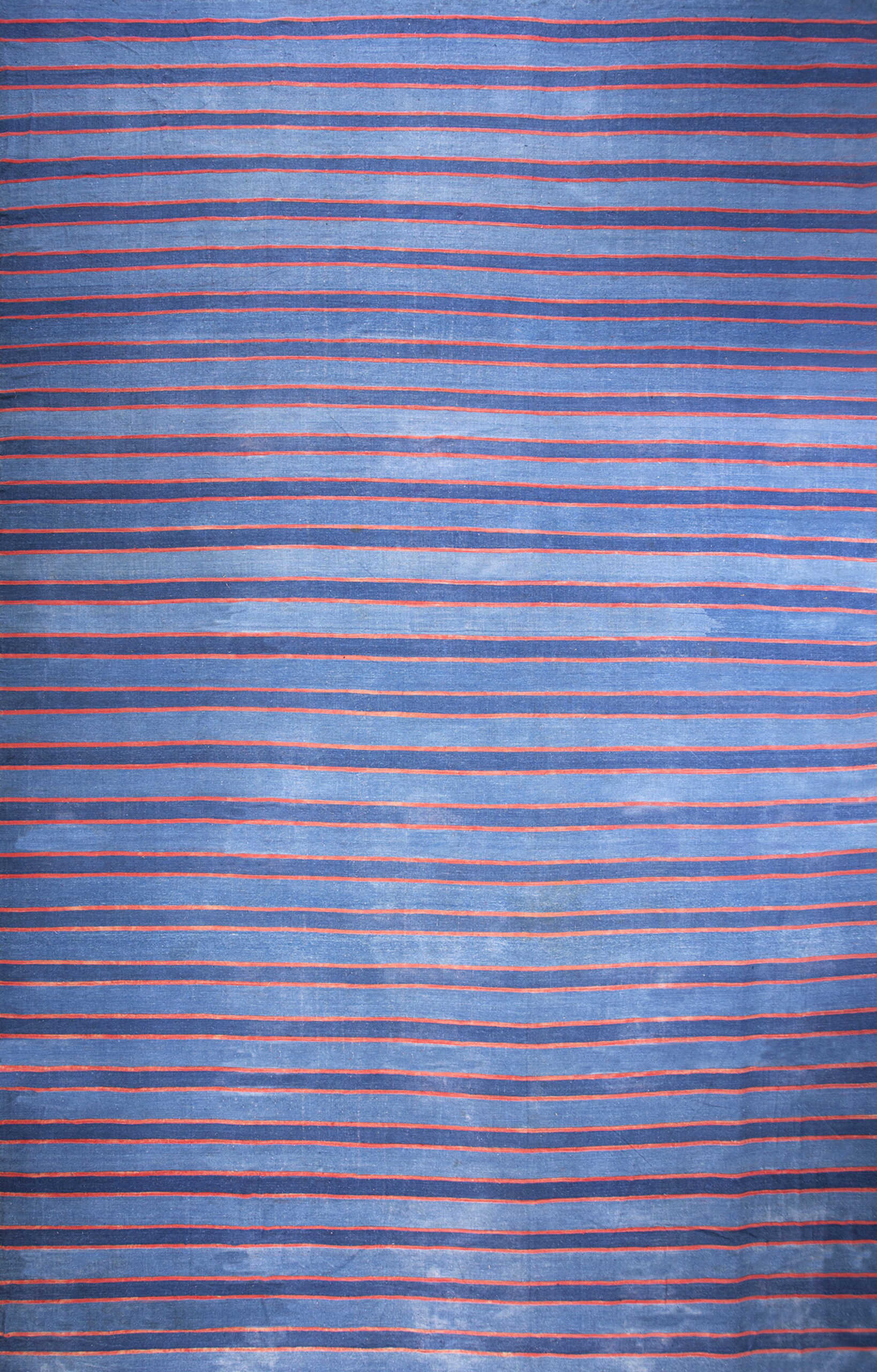 Antique Dhurrie Oversized Large Oversized Big Rug Wool Blue, Country of Origin: India, Circa Date: 1930s. This exceptional piece represents a fascinating chapter in the history of Indian rugs, showcasing a bold geometric aesthetic rarely associated with the region’s traditional output. The design is characterized by its stark simplicity, utilizing horizontal bands of varying blue tones accented by thin, vibrant red lines, achieving a powerful, rhythmic visual cadence.