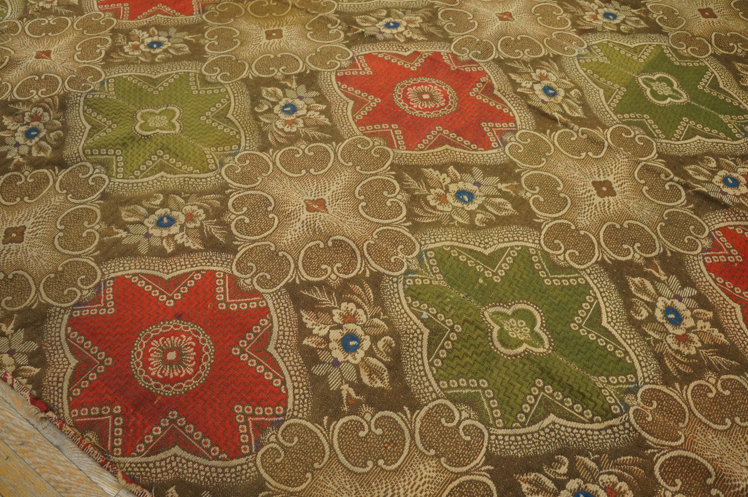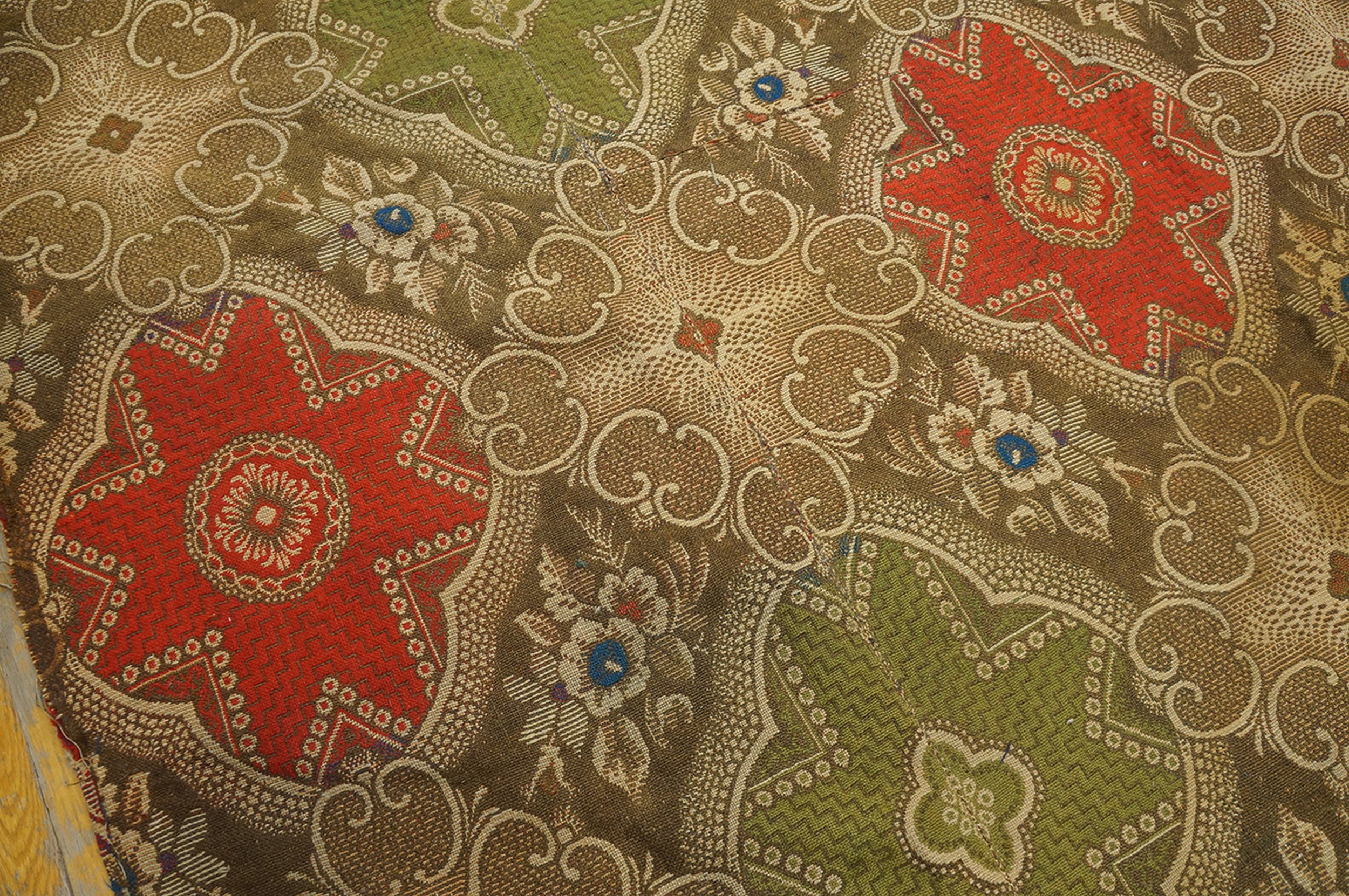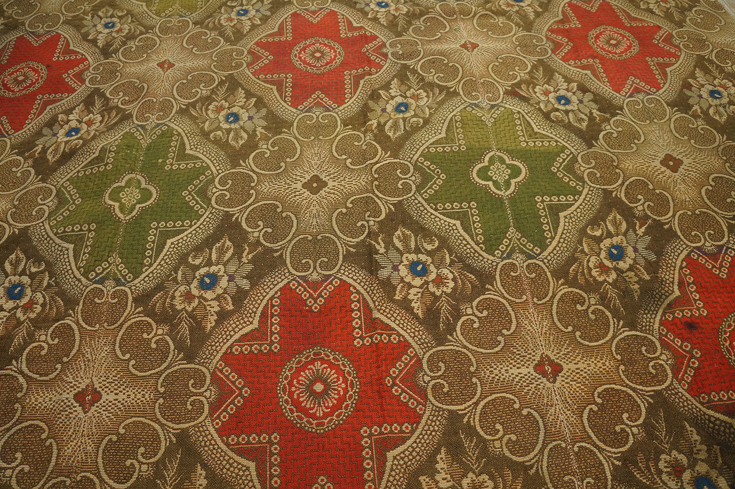 The palette is remarkably rich for its age, utilizing a deep, earthy brown field that highlights the vibrant contrast of the primary red and olive green motifs. This striking combination places it among the finest examples of multicolor jewel tone rugs from the era, retaining remarkable saturation despite its history.