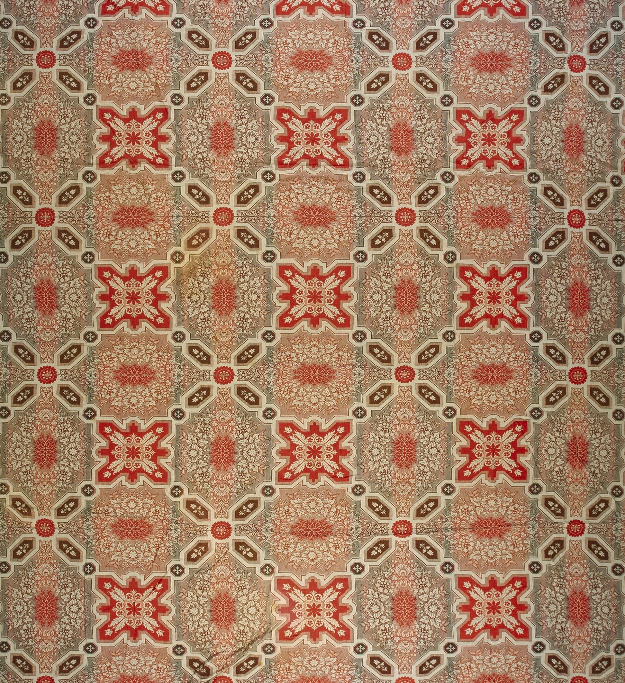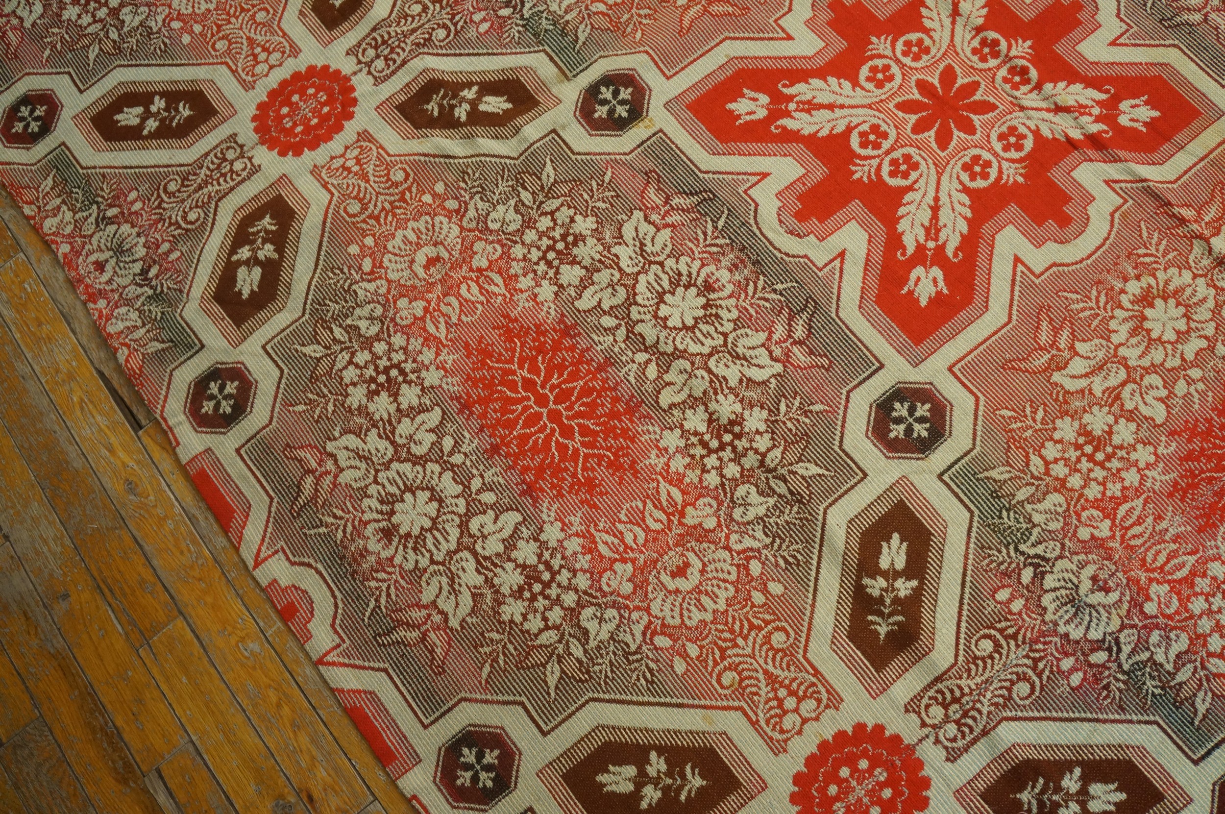 Antique Ingrain Room Size Wool Other Rug, Circa Date: 1850s. This exceptional example of an Ingrain carpet represents a significant piece of 19th-century domestic textile history. Ingrain carpets, prized for their durable, reversible double-cloth structure, were a staple of American and European homes during the mid-Victorian era, offering complex, loom-woven patterns previously unattainable by hand.