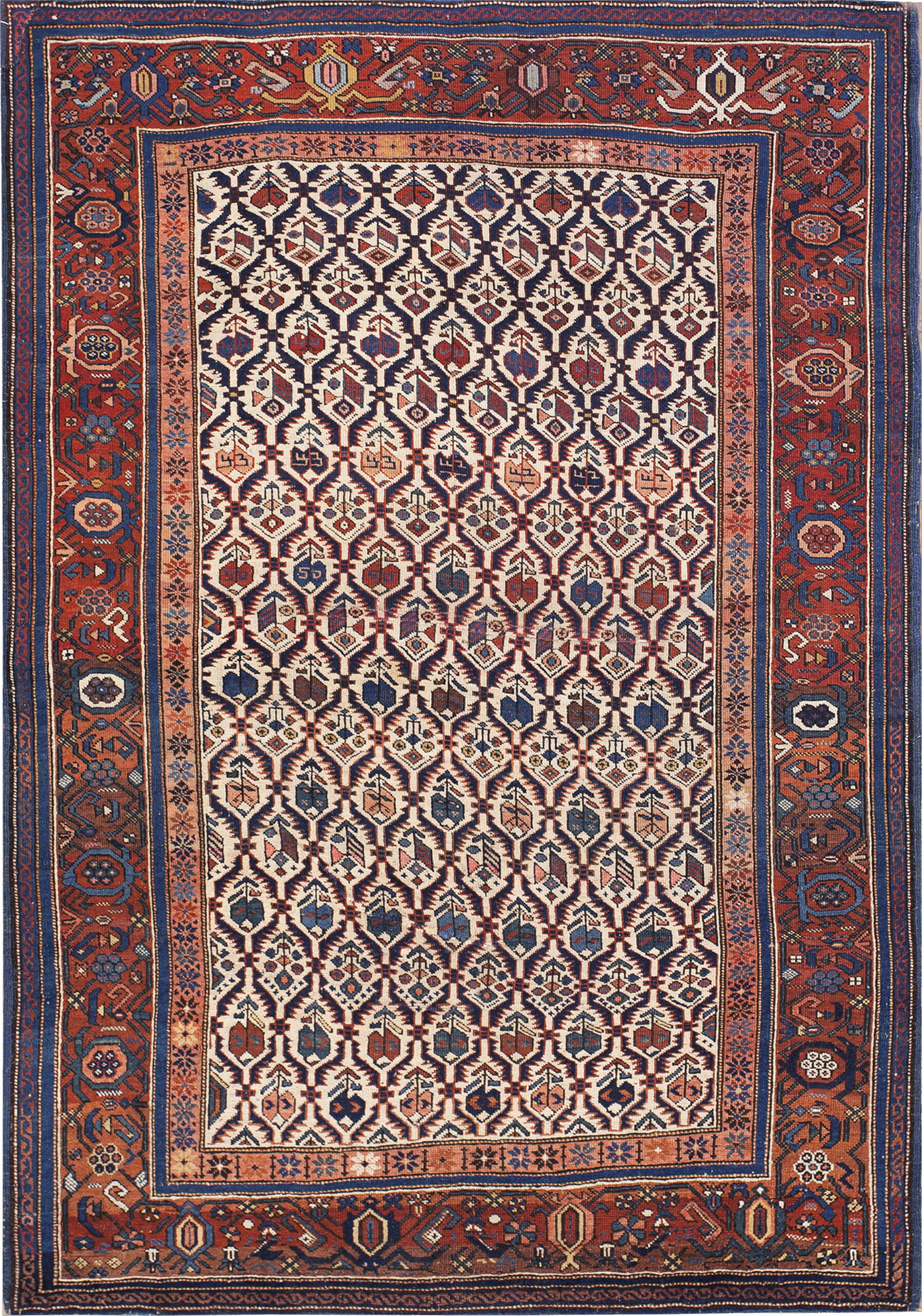 The composition is framed by multiple borders featuring classic serrated leaves, stylized rosettes, and traditional latch-hook designs, executed primarily in rich terracotta and midnight blue. Such detailed execution demonstrates the enduring appeal of these antique rugs, serving as a testament to the weaver’s skill and cultural heritage.