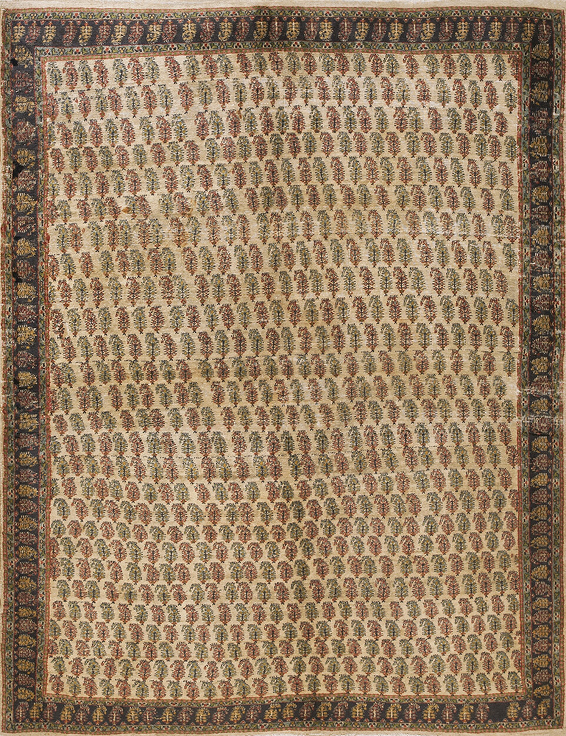 The central field is dominated by a warm, subdued ivory background, which provides a sophisticated counterpoint to the repeating boteh motif. These stylized leaf forms are rendered in muted tones of terracotta, sage green, and soft blue, creating a rhythmic, all-over pattern that avoids the formality of medallion designs. The subtle variation in color saturation suggests the use of natural dyes, lending depth and authenticity to the composition.