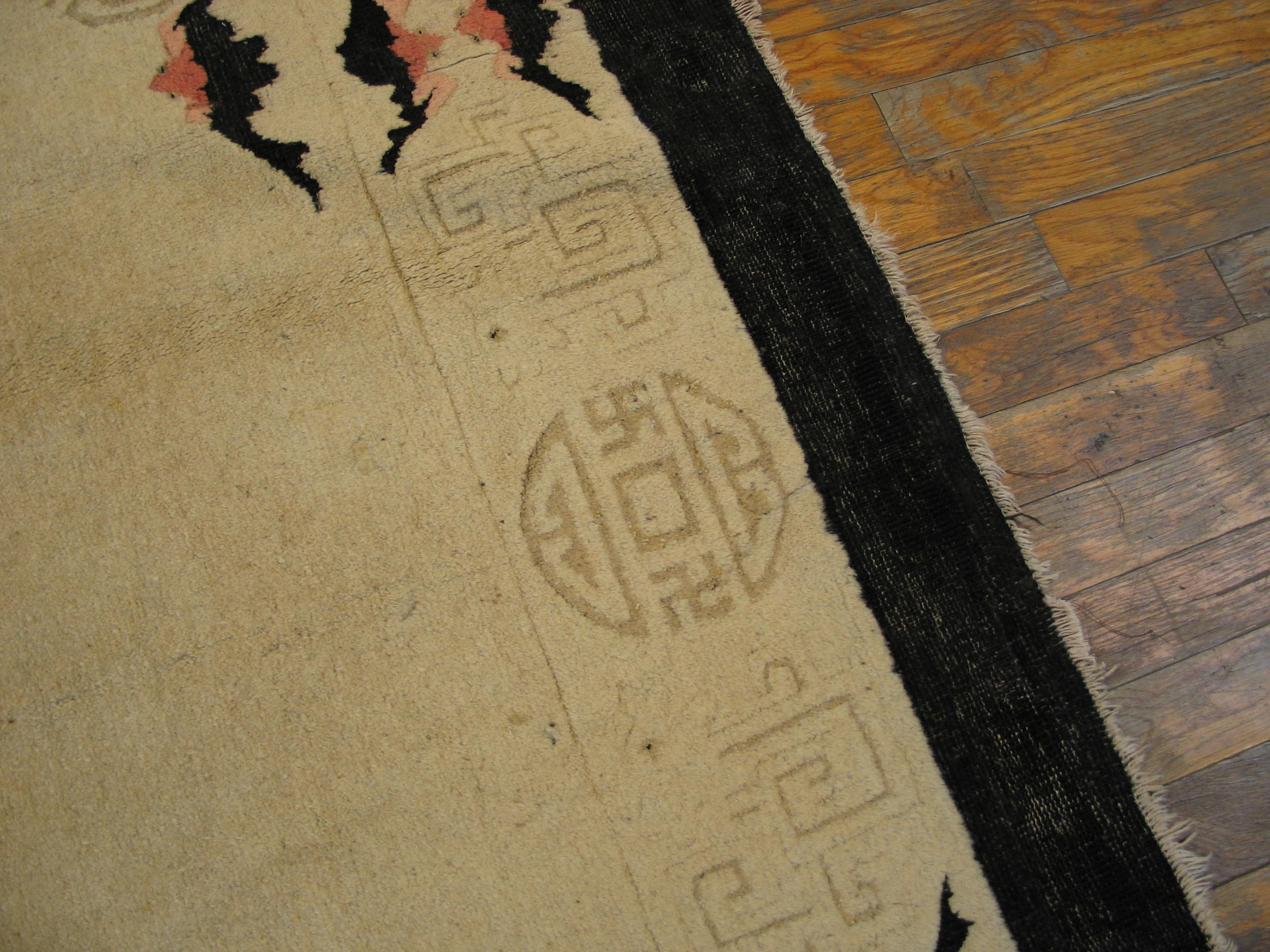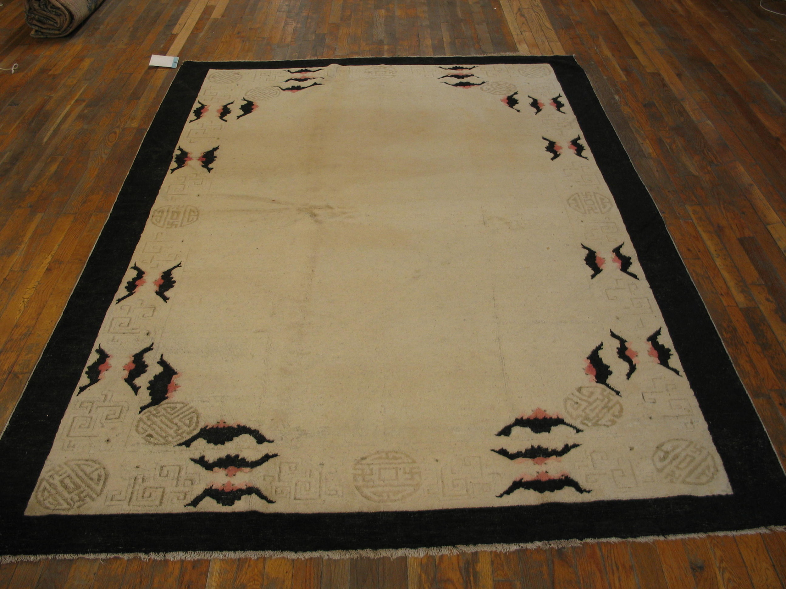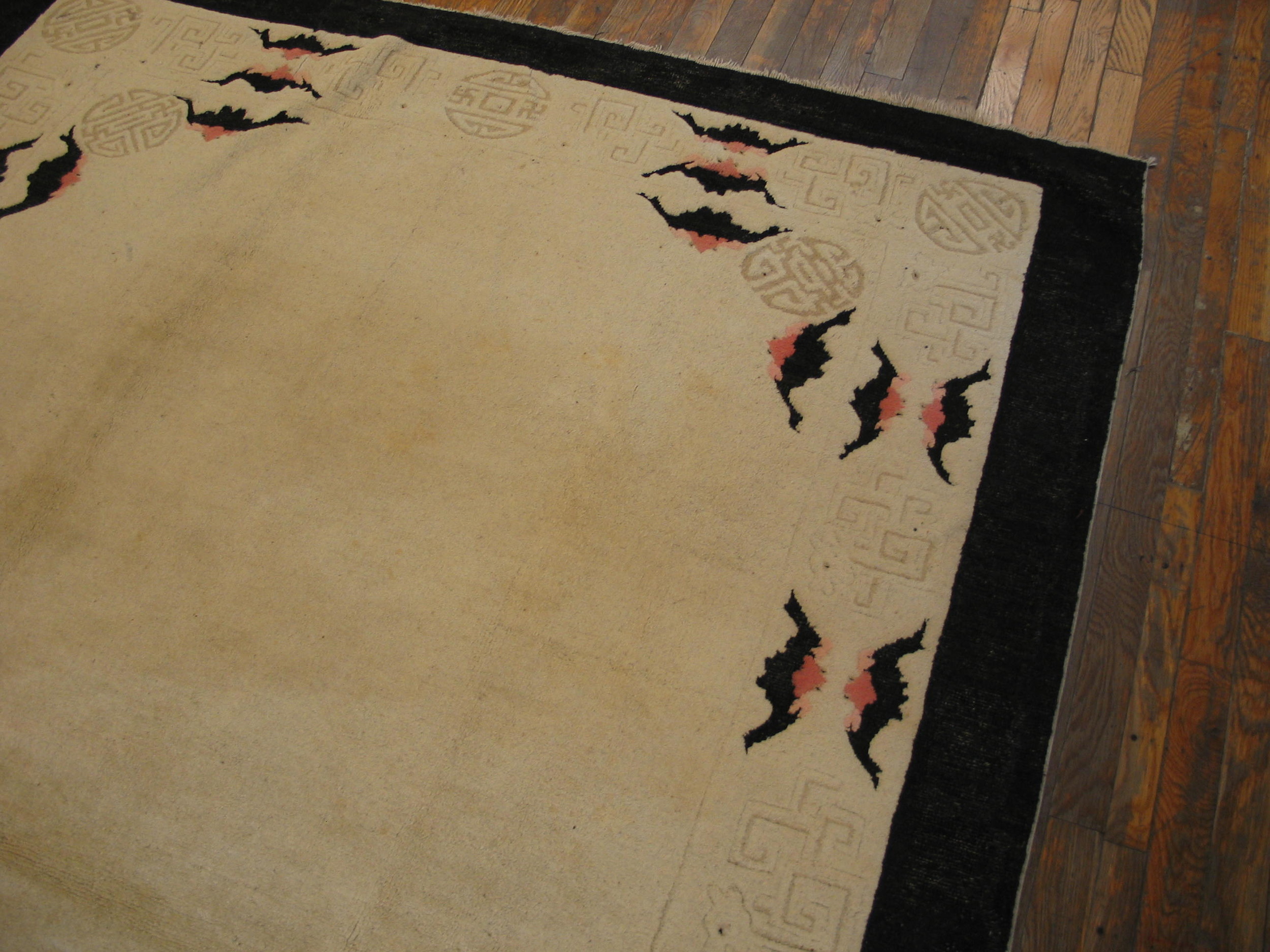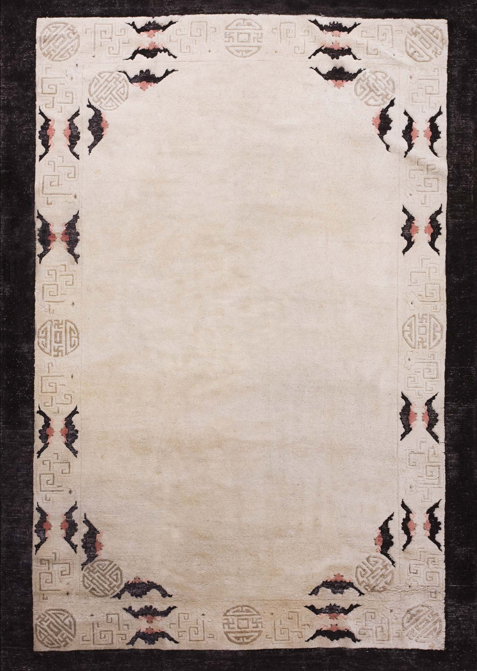 A narrow, highly detailed border frames the central expanse, featuring stylized black and pale pink bat motifs interspersed with traditional longevity symbols (Shou roundels). The surrounding fretwork utilizes precise, interlocking lines, classifying this border as a superb example of geometric rugs from the period.