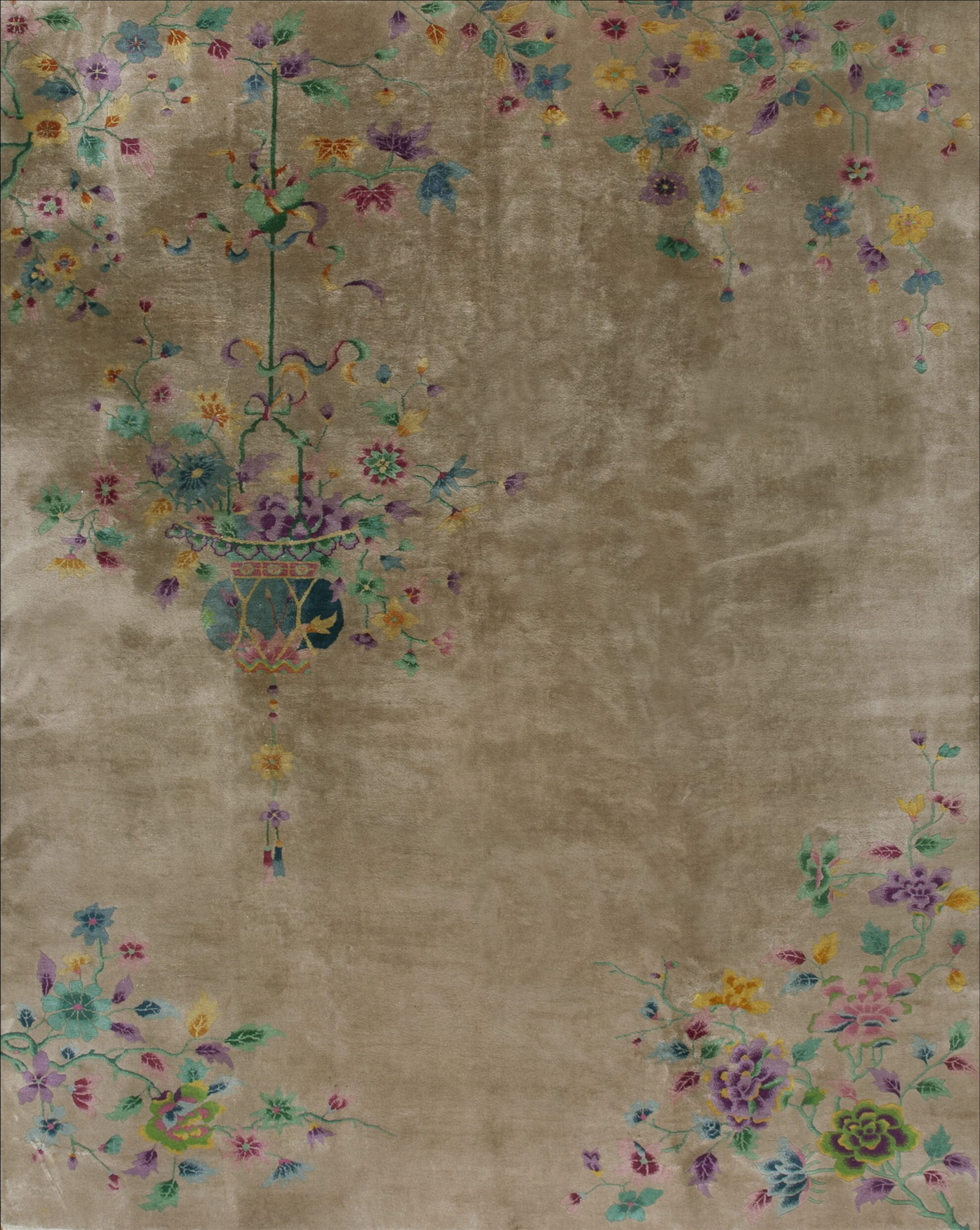The design eschews a traditional border, instead featuring delicate, meandering vines and cascading blossoms that frame the corners and upper edges. A central, stylized hanging basket or lantern motif, rendered in deep teal, lavender, and emerald, anchors the composition without overwhelming the expansive field. This open, asymmetrical layout is characteristic of high-quality Art Deco antique rugs.