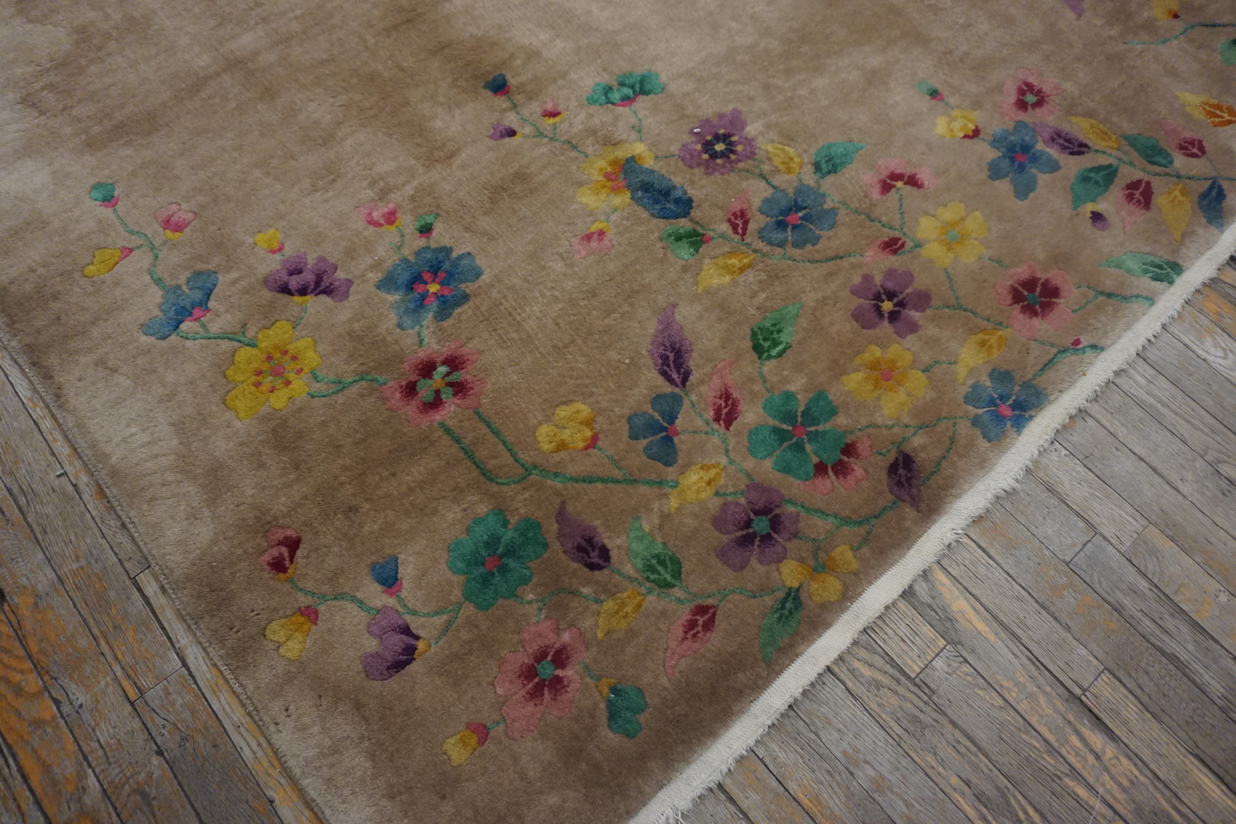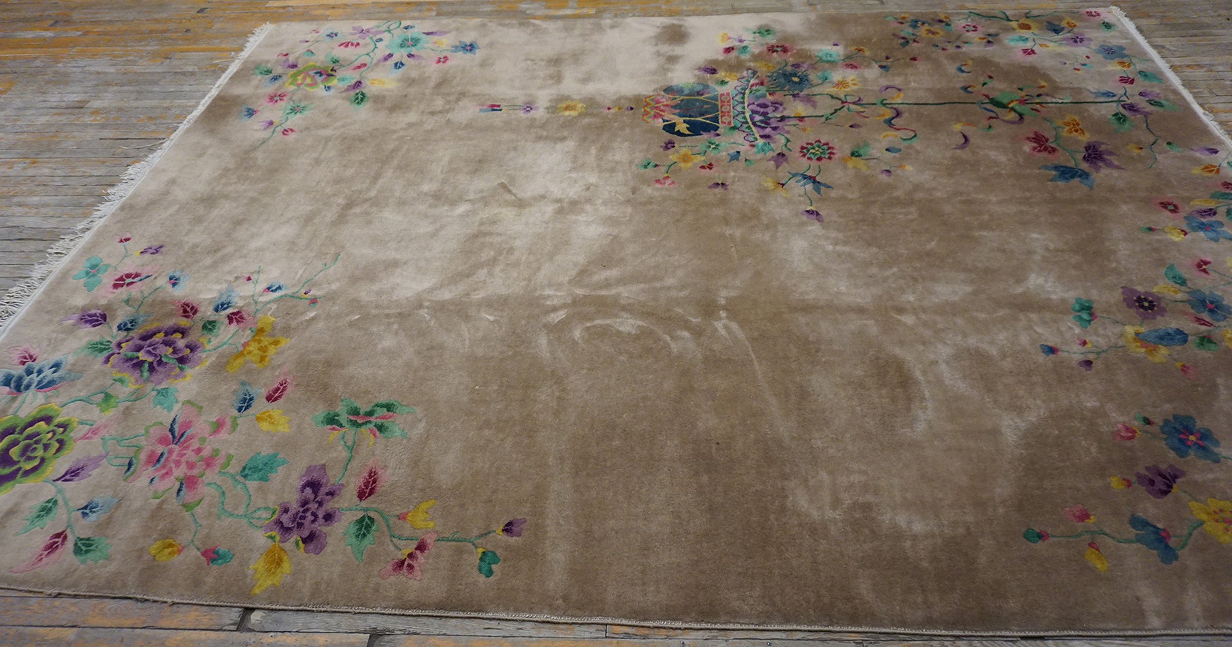 The palette is remarkably sophisticated, utilizing jewel tones—pinks, blues, purples, and yellows—to highlight the stylized floral motifs. These colorful accents pop against the muted ground, creating a sense of movement and lightness. This Chinese Art Deco rug remains a timeless statement of luxury and early 20th-century design innovation.