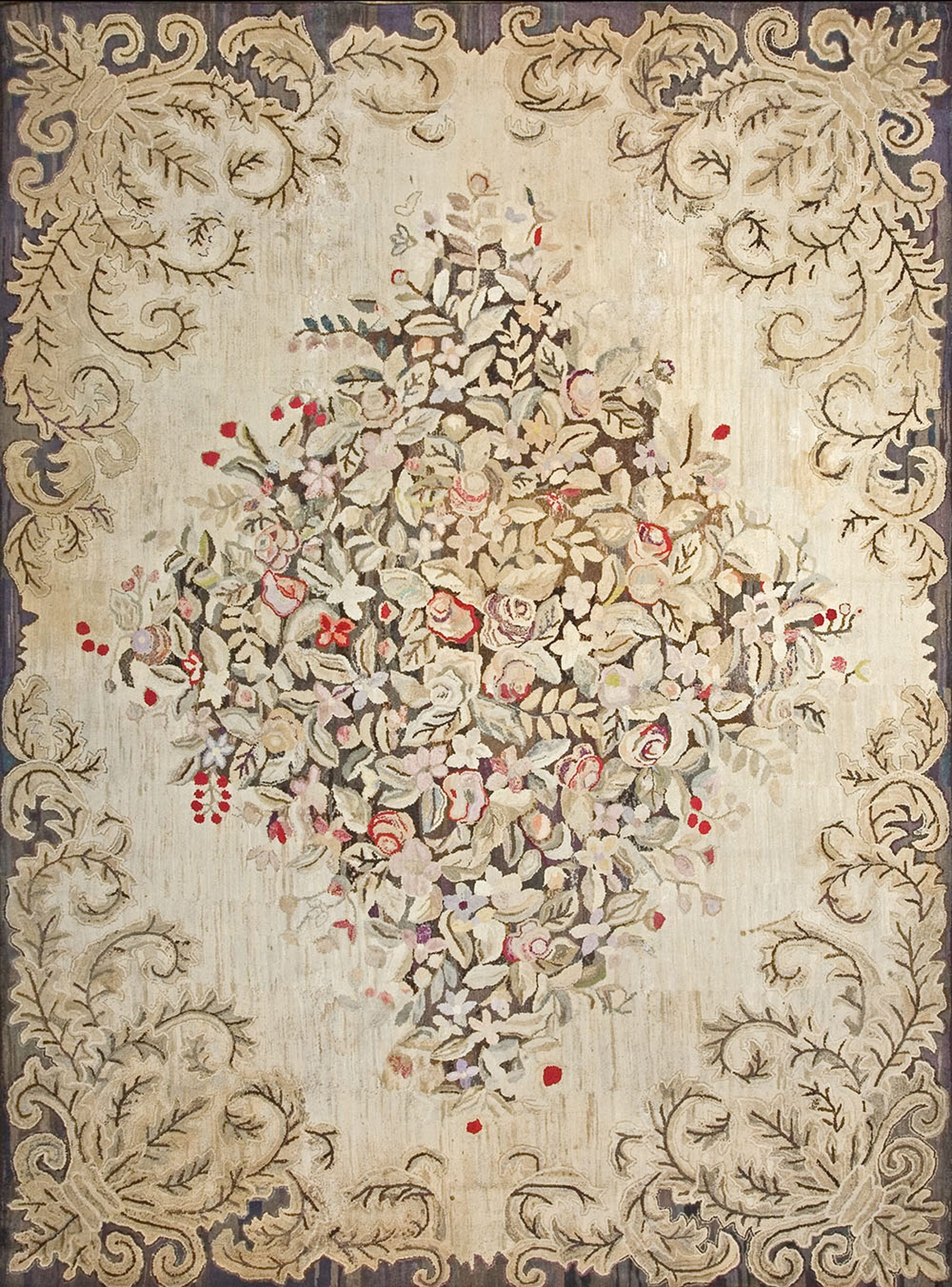 Dominated by a large, diamond-shaped arrangement, the design features complex shading and texture typical of the hooked technique, rendering a lush bouquet of roses, leaves, and small blossoms. This emphasis on naturalistic elements firmly establishes the piece within the tradition of floral rugs.